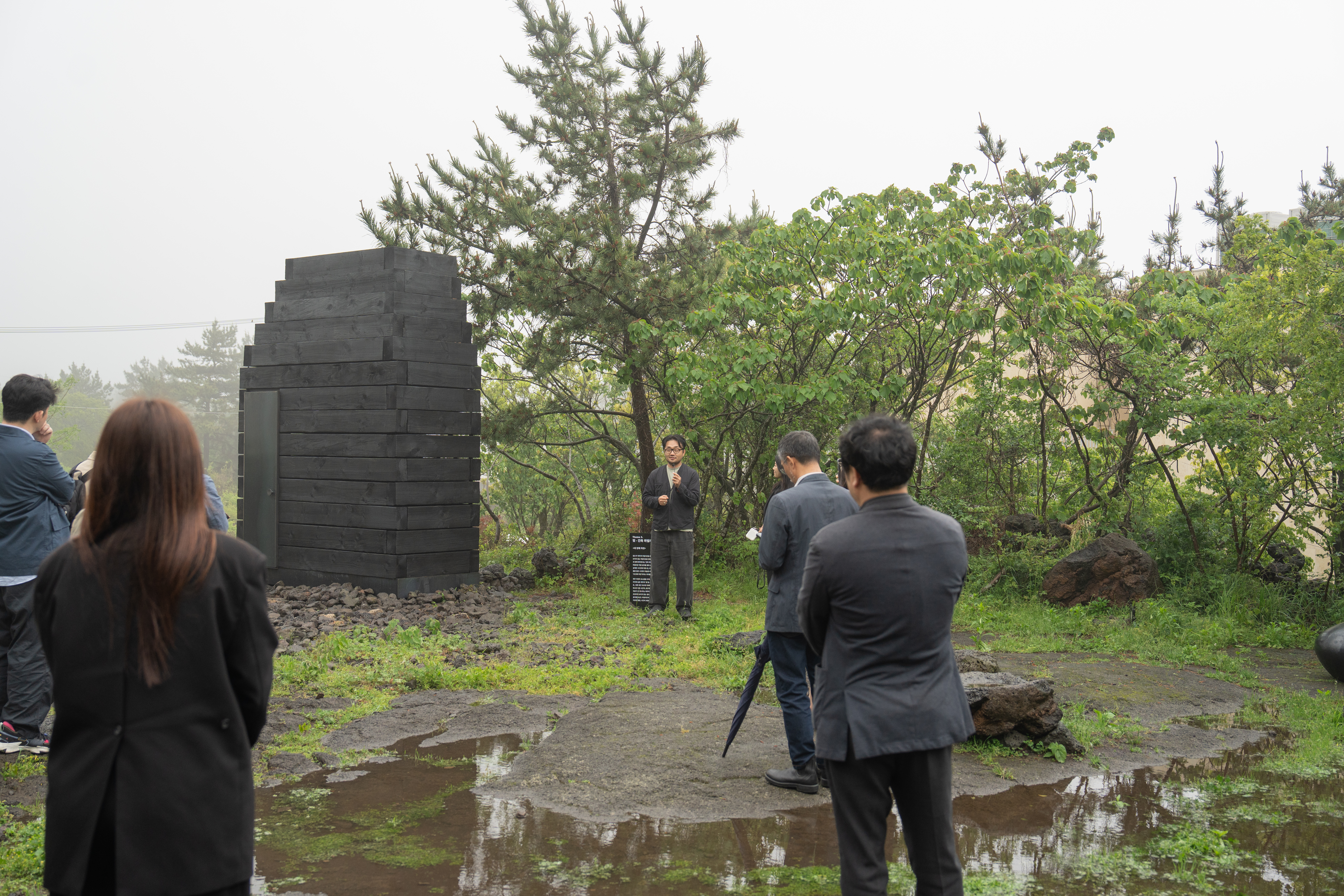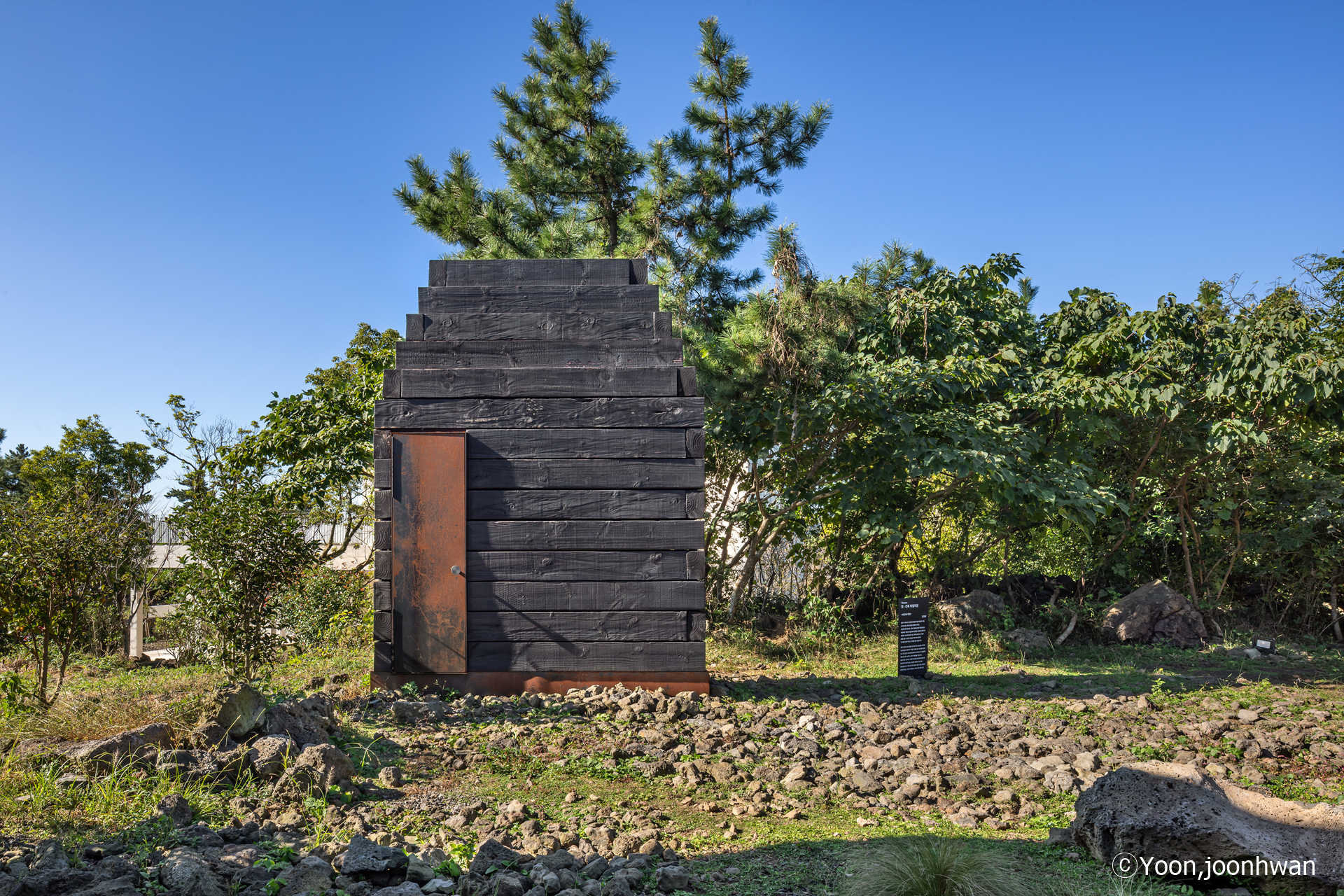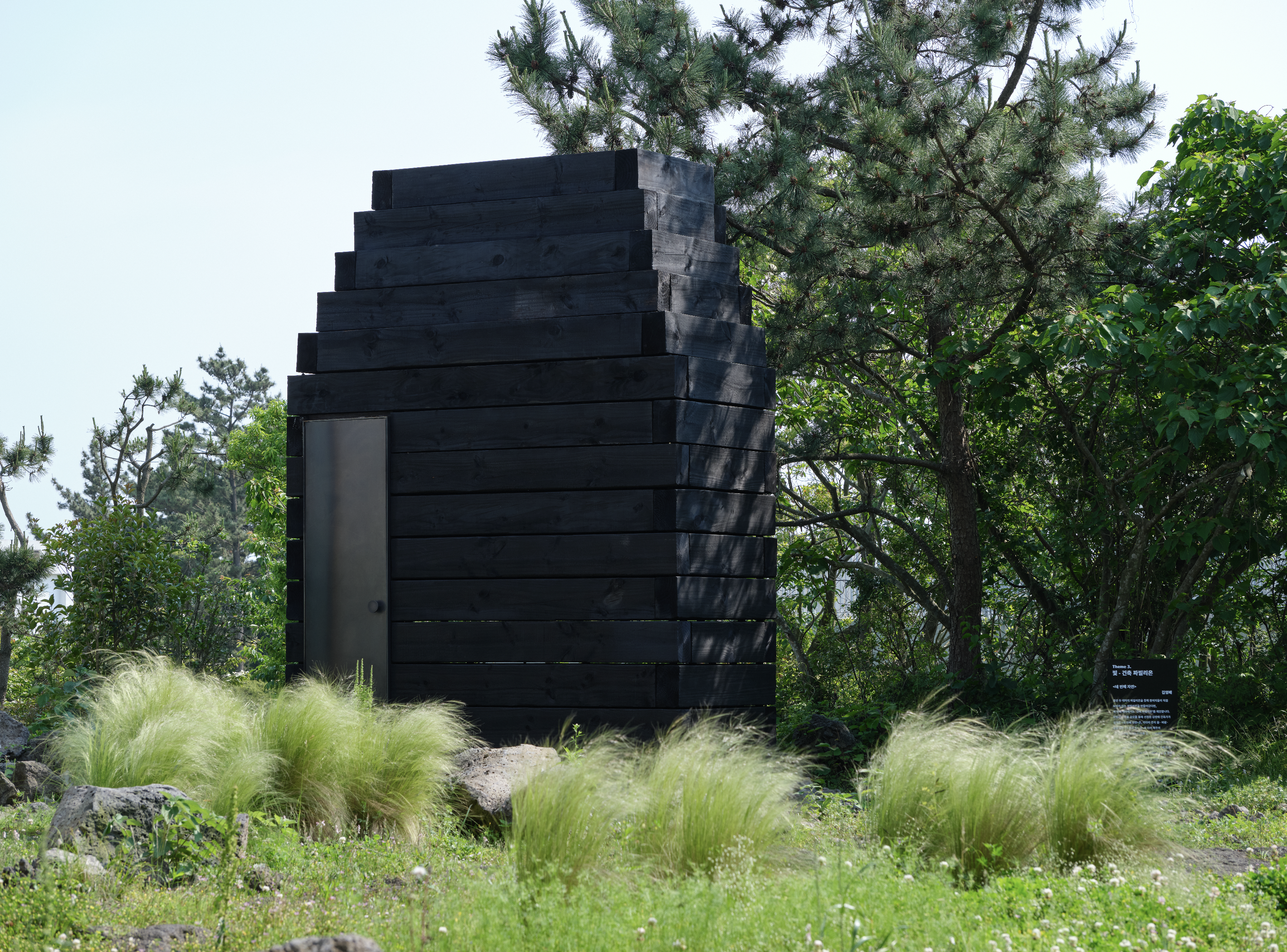 The 12mm gaps between the blocks go beyond simple constructional joints; they serve as delicate filters that allow Jeju’s light and wind to infiltrate the space. Rather than defining or articulating form, the light merely exists—leaving a subtle material impression within the space. The rough grain of the cedar, the charred surfaces, and the light seeping through the gaps collectively condense the experience of Jeju’s air, humidity, scent, and the passage of time. Visitors do not perceive a direct representation of nature within the Museum. Instead, they experience the tremor of light and the breath of timber, sensing how nature permeates inward and how the space responds with a dense materiality.