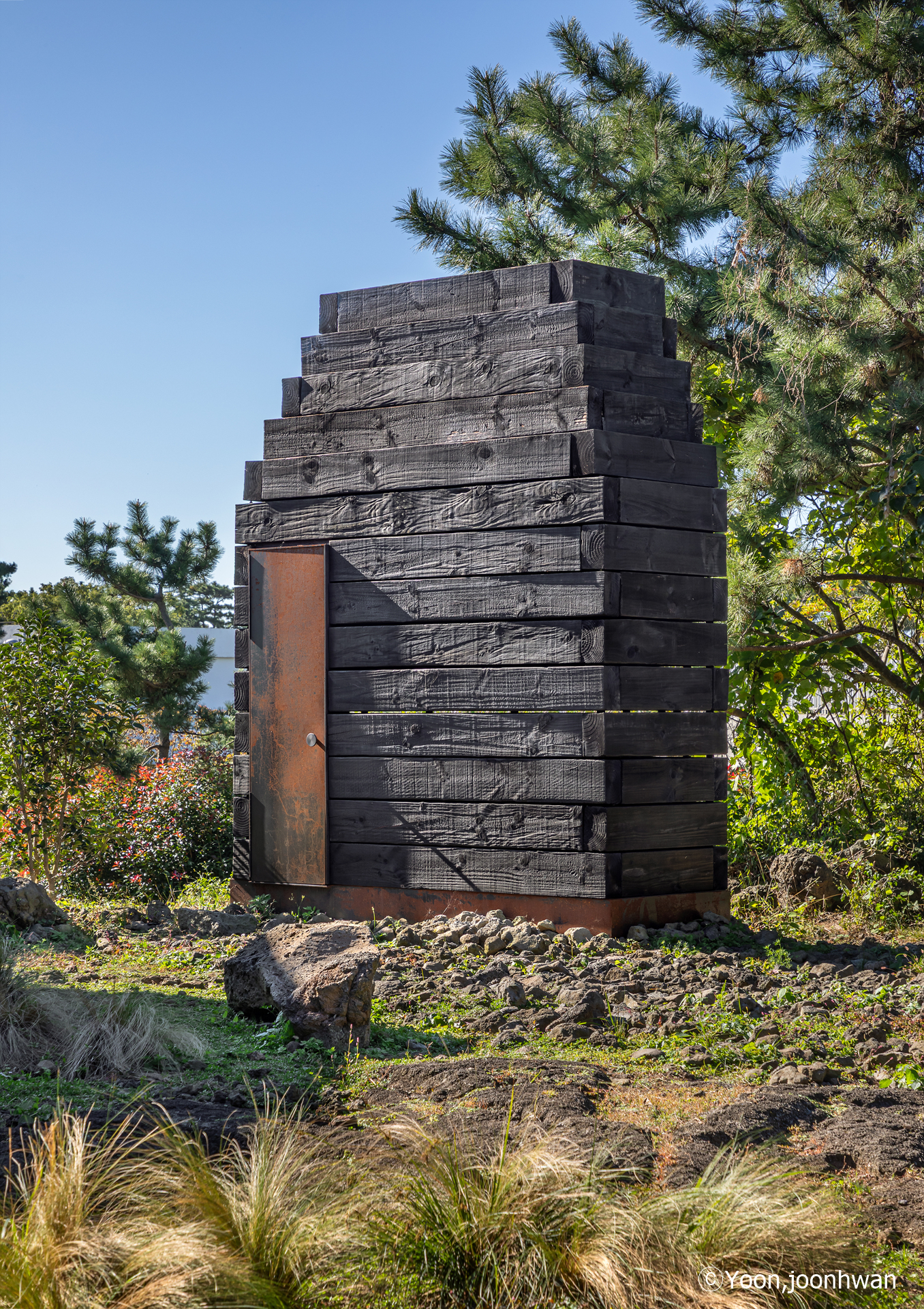 The 12mm gaps between the blocks go beyond simple constructional joints; they serve as delicate filters that allow Jeju’s light and wind to infiltrate the space. Rather than defining or articulating form, the light merely exists—leaving a subtle material impression within the space. The rough grain of the cedar, the charred surfaces, and the light seeping through the gaps collectively condense the experience of Jeju’s air, humidity, scent, and the passage of time. Visitors do not perceive a direct representation of nature within the Museum. Instead, they experience the tremor of light and the breath of timber, sensing how nature permeates inward and how the space responds with a dense materiality.