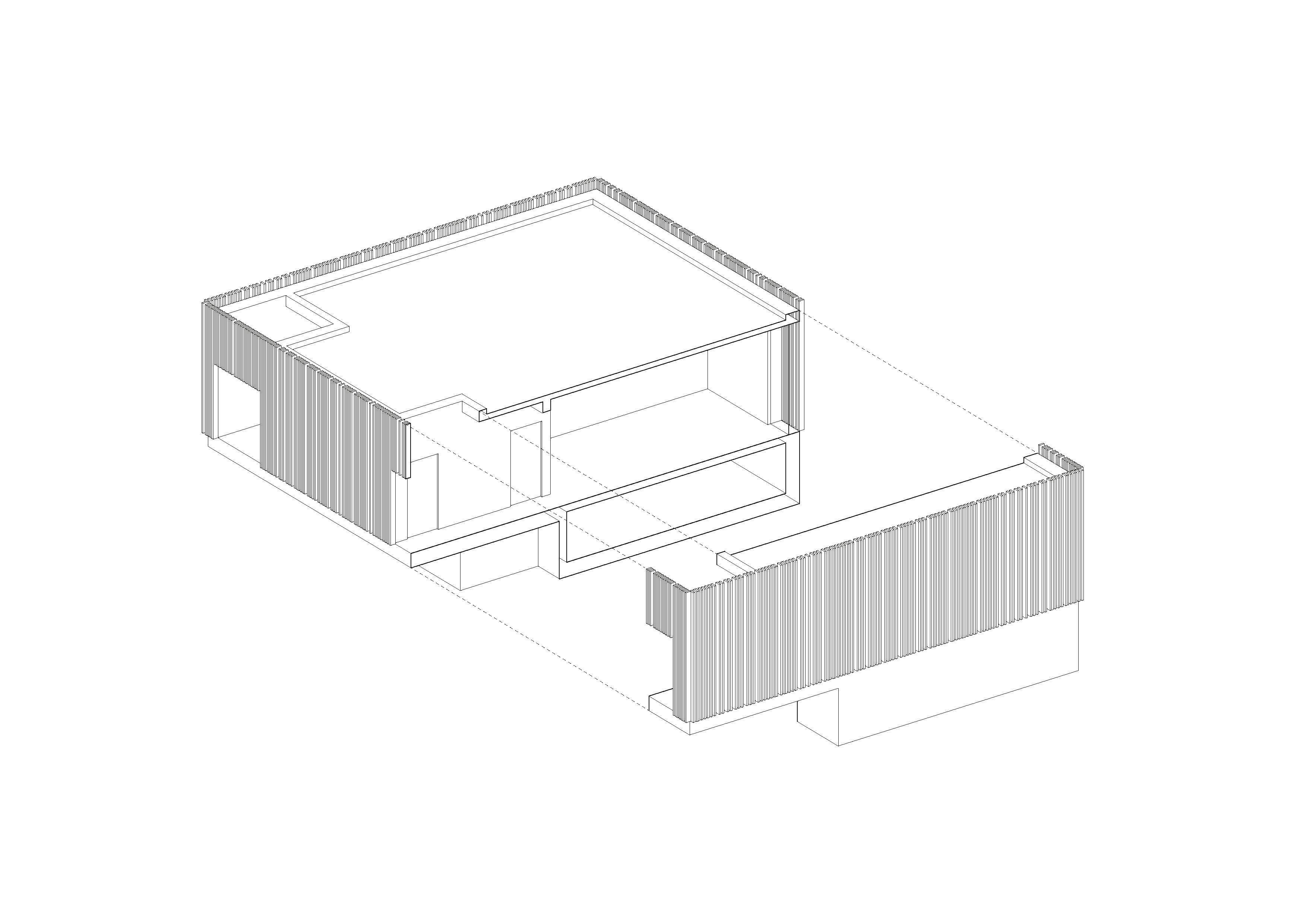 차분하고 묵직한 매스를 이루고자 루버의 깊이와 그림자가 만들어내는 질감을 강조하고 입구 두 곳만 보일뿐 입구 반대편의 세로로 긴 채광창은 루버에 가려 완결성을 갖도록 하였다. 적삼목 루버는 두께 50mm, 깊이 150mm를 기본으로 두개 루버를 연이어 놓거나 두칸을 건너띄는 식으로 자유롭게 배열하였다. 그리고 루버 뒷면에는 OSB합판의 무늬와 루버의 그림자가 입면의 구성을 단조로우면서도 깊이 있게 하여 차분한 분위기를 잘 만들어낸다.