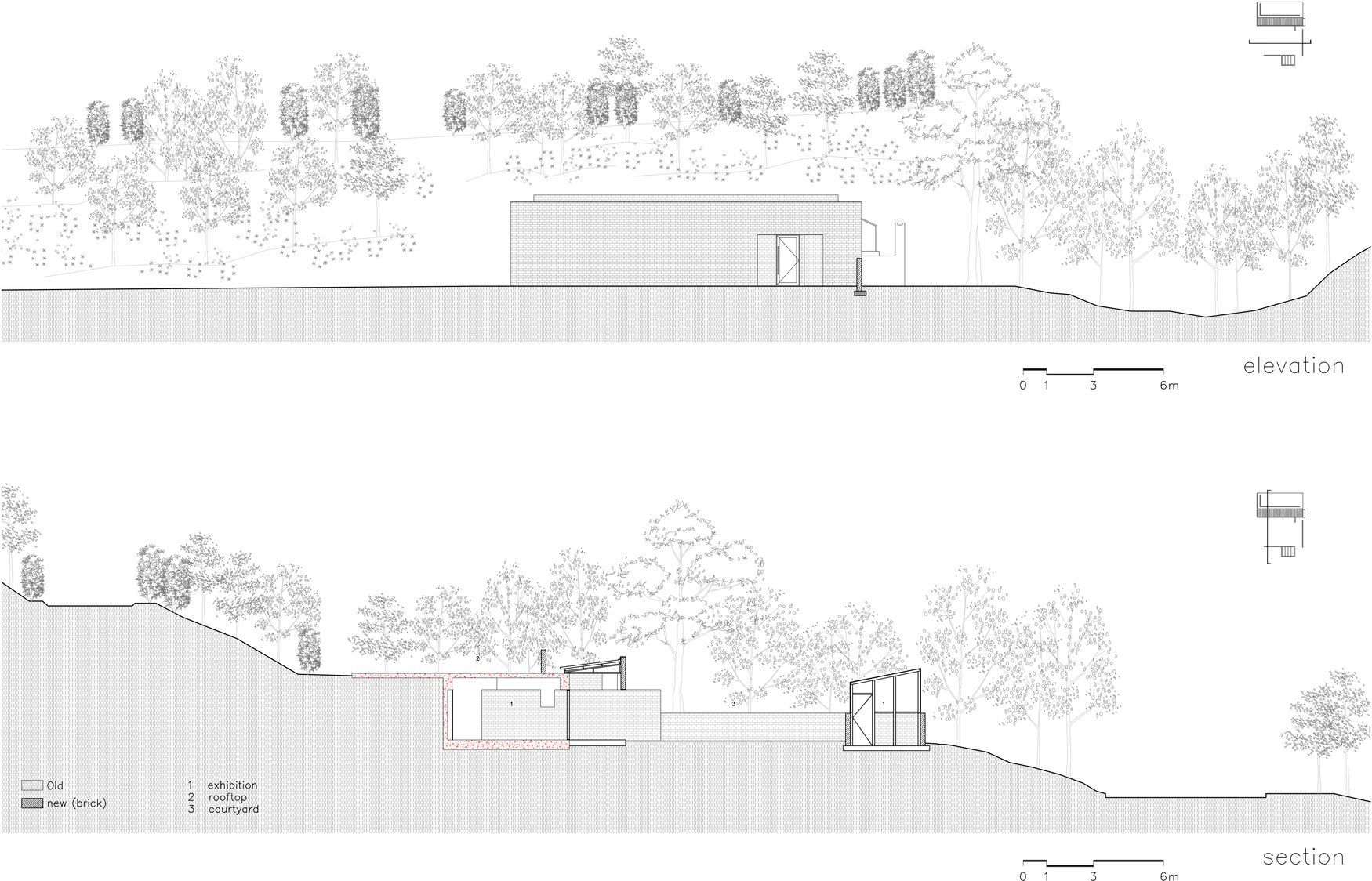 성북도원의 2, 3전시장은 기존의 폐가의 위치에서 다시 세워졌다. 다만 새로운 재료와 벽을 통해 정제된 분위기를 가지게 되었다. 콘크리트 박스로 살던 곳에 처마를 내고 창을 막았다가 다시 처마를 한번 더 내었던 곳의 영역만큼 공간 확장을 하였고, 흉가나 다름없는 목구조의 헛간은 모두 철거후에 새로운 재료와 구법으로 야외 전시장으로 계획하였다. 단지 벽을 통해서 공간의 확장과 영역성을 가지는 간결한 방법으로 새로운 분위기를 만들어냈다.