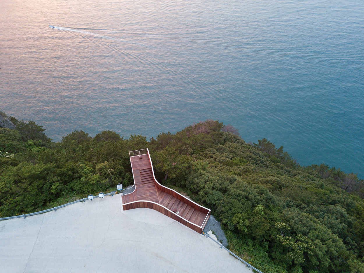 대상지는 남쪽 해안도로를 따라가는 세 곳의 전망 지점 중 한 곳이다. 절벽에 난 해안도로를 따라가다 보면 산이 굽이치고 바다가 교차되는 풍경이 보인다. 산과 바다가 대치하 듯 만나는 풍경이 이어질 때쯤 바다 고래처럼 거대한 섬들이 눈앞에 나타난다. 이 곳에 압도적 스케일의 섬과 무한한 깊이에 빠질 듯 한 바다가 한자리에 있다. 드넓은 수평선을 보며 지나온 방향의 아래에는 에메랄드빛의 몽돌해수욕장과 여기저기 돌무덤과 같은 섬이 펼쳐진다. 이 땅에 흐르는 듯 펼쳐지는 풍경을 즐길 수 있는 곳을 계획하기 시작했다. 땅의 형상은 도로 한 켠 삼각형의 선형으로 영역을 가지며 한 쪽이 경사진 곳이다. 우측에 섬을 보는 풍경과 좌측에 여차마을을 내려다보는 풍경이 가장 아름답다. 따라서 계획은 자연스레 지형을 따라 흐르는 듯 길게 늘어뜨린 데크를 놓고 우측은 지형을 따라 아래로 내려 스탠드형식을 갖추어 섬을 조망하도록 하고, 좌측은 들어올려 바다쪽으로 길게 내민 데크가 바다로 한걸음 다가가서 여차마을을 내려다보도록 했다. 경사진 지형을 활용해 데크 레벨을 다양하게 취하며 자연을 대하는 방식을 달리 가지도록 했다.