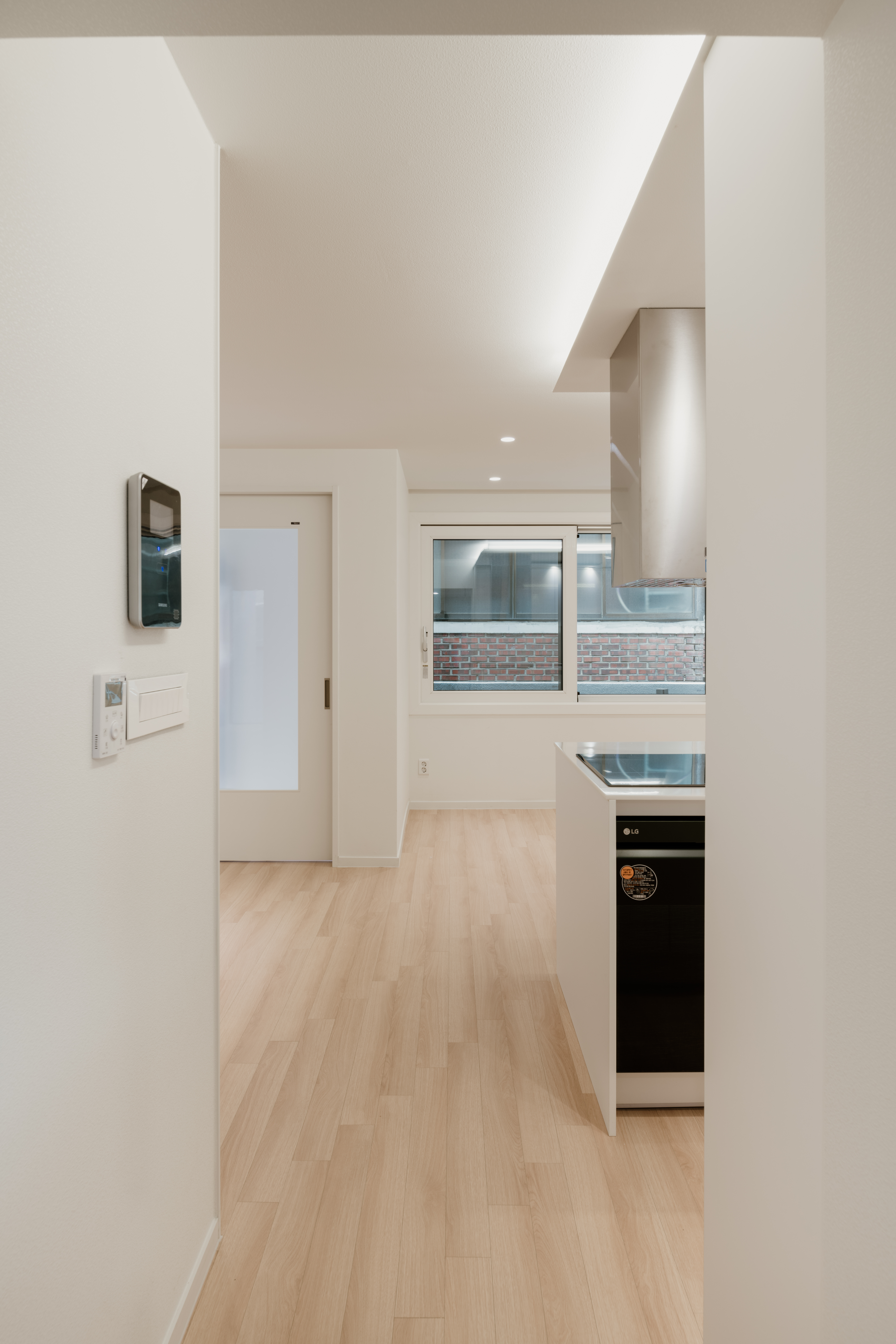 건축주는 중년의 대학교수로 아파트 생활을 해오다 자녀들과 함께 주택에 살아보기로 결심하고 이 집을 매입해 리모델링하게 되었다. 구옥은 애초에 1층 면적이 약 15평에, 다락이 9평 정도밖에 되지 않는 작은 집이었다. 증축할 정도의 예산은 아니었기에 다락방은 건축주가 사용하고 1층에 자녀들 방을 하나씩 두기로 하고 리모델링이 진행됐다. 외관은 옛집의 벽돌을 일부분 그대로 가져가되, 강 렬한 레드 컬러와 금속 지붕을 얹어 모던한 느낌을 더했다. 거실은 주방과 연결되게 배치하였고 아 일랜드 싱크대 뒤쪽으로는 다용도실을 배치해 생활의 편의성도 높였다. 이렇게 50여 년의 세월의 더께가 쌓인 구옥이 식구들만을 위한 소박하고 편안한, 작지만 완성도 있는 공간으로 재탄생했다.