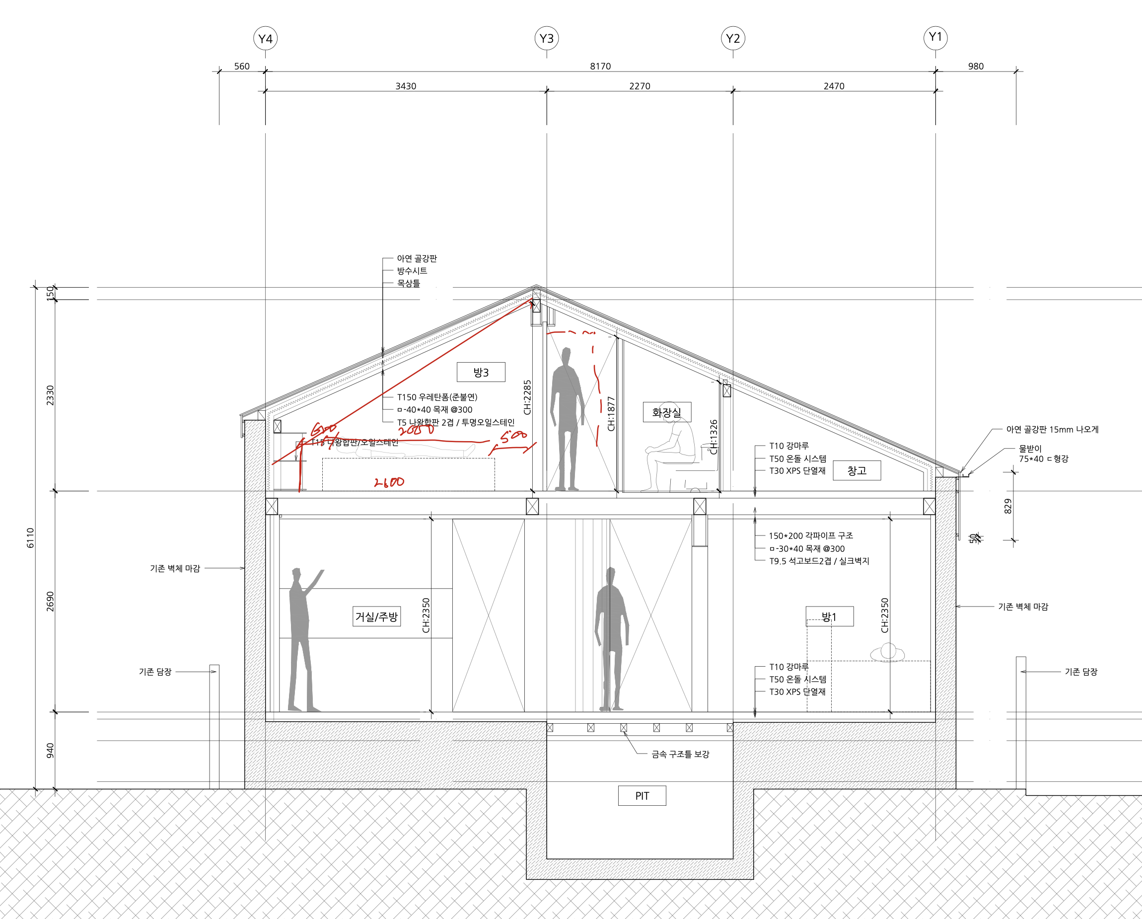 기존 주택은 1973년 지어진 단층 주택이며 유약 벽돌과 화강석 마감, 기와 경사지붕이 특징이었다. 주택일대는개발이활발하지못해주택형식등에서시대상을고스란히담고있는곳이많았다.이 집은 막다른 골목에 위치해 차량 진입이 어려웠고 옆집과의 이격거리가 좁아 일조가 우수하지 못했 다.또한이시대에지어진집들은정부정책으로지하를두어방공대피소의역할을하도록했는데 지하수 유입과 위생상의 문제로 해결책이 필요했던 리모델링 프로젝트였다.