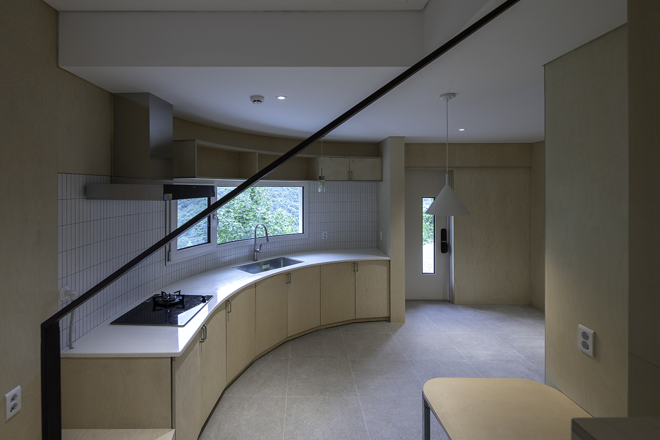 철근콘크리트로 바닥을 완성하고 벽과 지붕은 경량목구조를 사용했다. 또한 지붕은 징크, 외벽 마감은 모노쿠쉬를 사용하여 외벽의 곡면을 단정하게 정리하였다. 내부 공간을 계획할 때 1층과 2층의 성격에 따라 다른 분위기로 마감을 하기로 했다. 공유 주방의 성격을 가진 1층의 바닥은 석재 타일을 시공하여 물청소가 가능하도록 하고 벽은 자작나무로 마감하였다. 곡면 벽에 있는 주방 가구는 자작나무로 제작하였으며 싱크대 앞에 서면 바깥 풍경을 볼 수 있다. 신발을 벗고 자작나무 벽을 따라 계단을 오르면 백색의 규조토로 마감한 2층 공간이 펼쳐진다. 동서남북 주요 위치마다 창을 배치하여 마당을 내려다보기도 하고 멀리 산을 볼 수 있다.