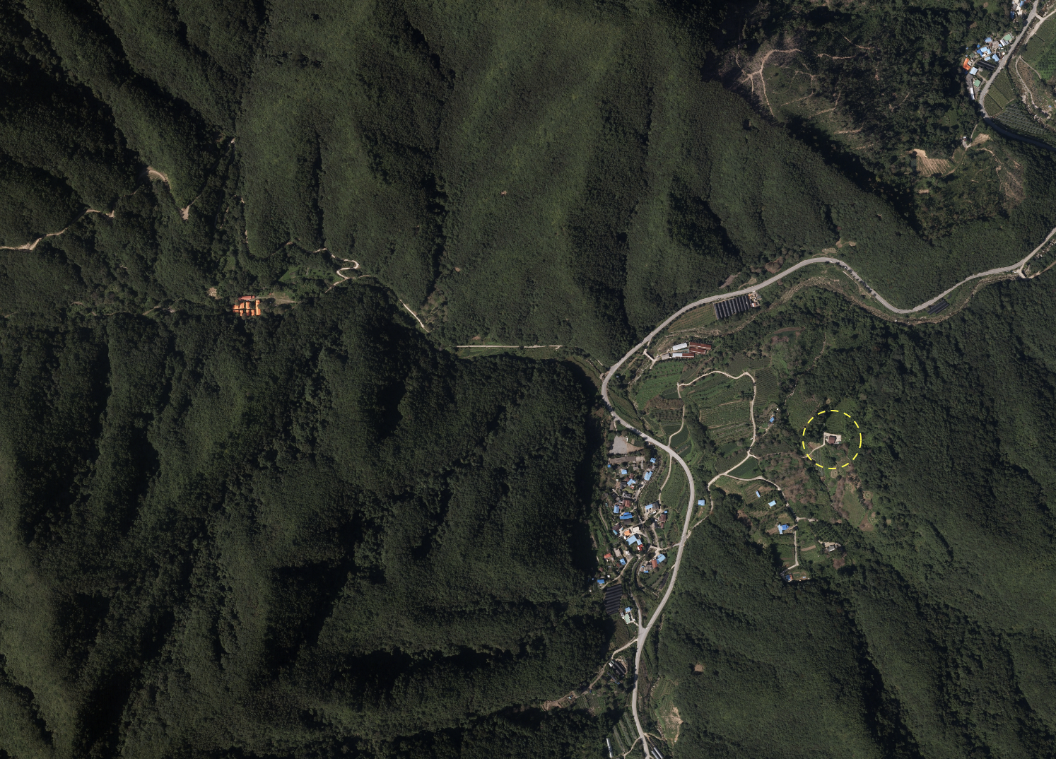진입 도로에서 60m 높이의 가파른 경사를 올라오면 산 중턱에 위치한 670㎡ 대지에 80㎡의 농가 주택이 자리 잡고 있다. 건축주는 인적이 드문 조용한 마을을 찾아 부모님과 함께 살 집을 짓고자 이 장소를 찾았다. 기존 농가 주택은 인테리어를 해서 부모님을 모시고, 본인은 옆에서 혼자 살 집을 짓기로 했다. 새로운 주택의 계획 조건은 1층은 주방 겸 창고로, 2층은 방으로 하되 1층에서 기존 농가 주택과 연결되는 것이었다. 실내이지만 외부공간의 성격을 가지는 1층이 공유공간의 역할을 하고, 2층은 사유공간으로 사용하길 원했다. 사실 처음 이 땅, 그리고 샌드위치 패널 구조의 기존 주택을 보고 어떻게 조화롭게 신축 주택과 배치를 해야 할지, 재료는 어떤 걸 사용해야 할지, 외관은 어떠한 관계성을 가져야 할지 고민이 많았다. ‘조화가 과연 가능한 걸까.’ 결국 기존 주택과는 기능적 동선만 해결하도록 하고 신축 주택은 독자적인 외관을 가지는 것으로 방향을 설정하고 계획을 하였다.