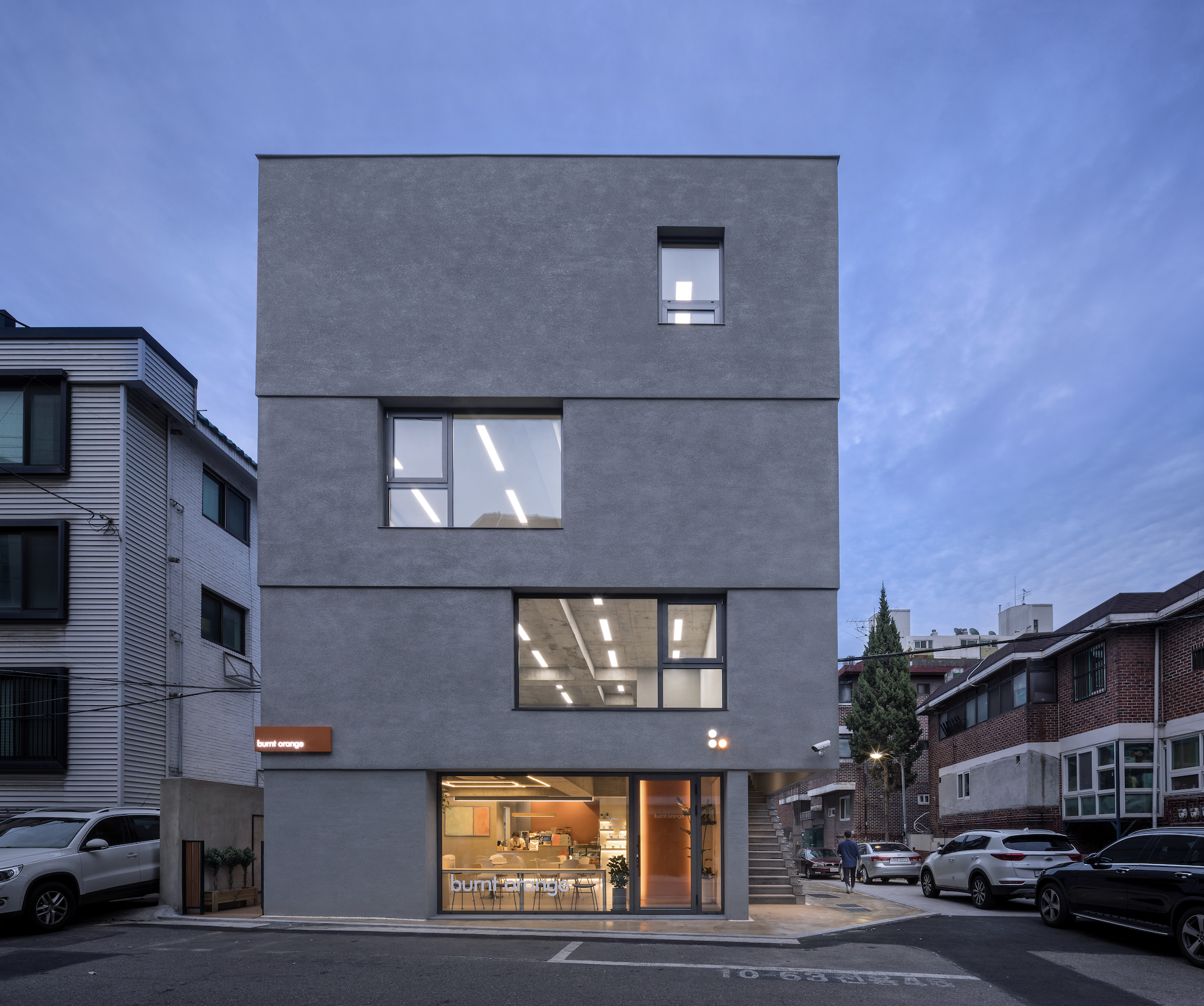 근린생활시설은 창호를 통한 외부와의 시야 확보가 중요하게 여겨진다. 어떻게 하면 가장 명료한 매스와 적정한 창호의 볼륨을 만들 수 있을지가 중요했다. 우리는 묵직한 매스에 집중하면서도 단조로울 수 있는 매스를 층별로 30mm씩 나오도록하여 분절 하였고 그 수평선에 창호가 맞붙게해 단조로운 매스에 정교함을 더했다.