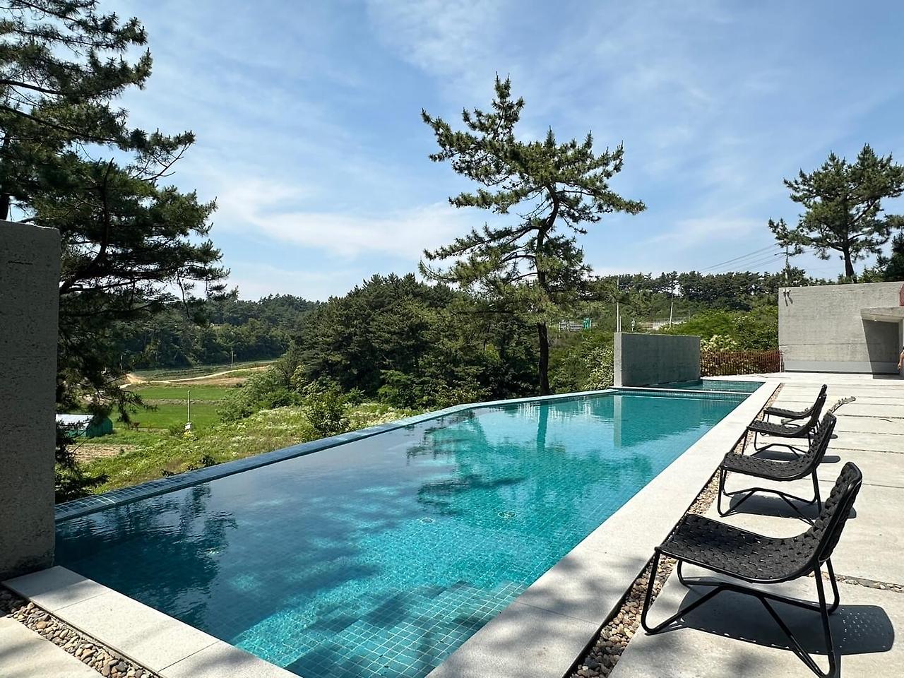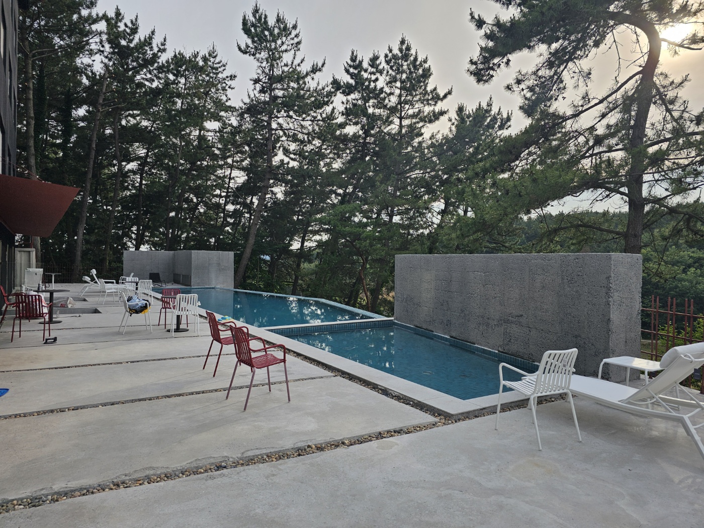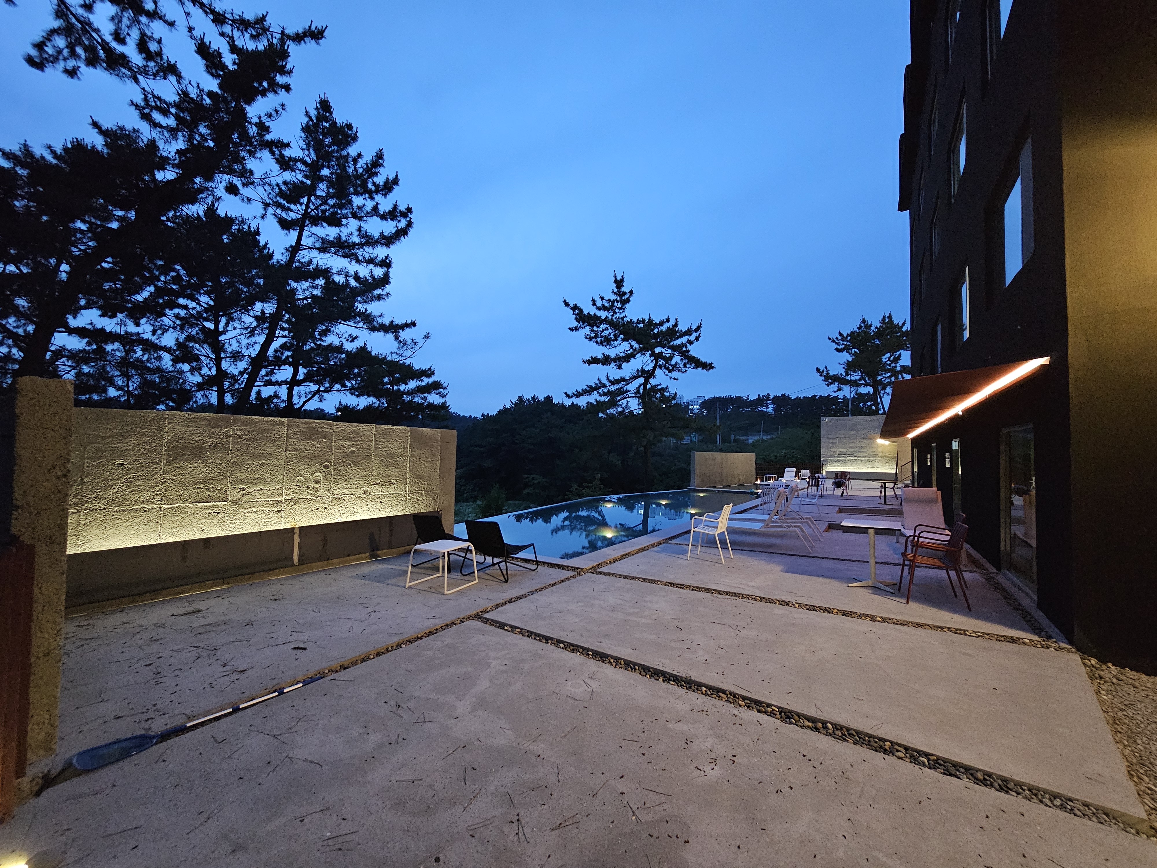 건물의 전면이 도시를 향하고 있다면, 후면은 자연과 직접적으로 맞닿아 있는 입지적 특성을 지니고 있었다. 그동안 활용되지 못했던 이 공간을 적극적으로 개방하는 것이 중요한 과제였다. 후면에 배치된 인피니티 풀은 단순한 부대시설이 아니라, 실내와 실외를 자연스럽게 연결하는 매개체로 작용한다. 투숙객들은 객실에서 한 걸음 나아가는 순간, 물과 하늘이 맞닿은 듯한 감각적 경험을 하게 된다. 이는 단순한 시각적 개방감을 넘어, 자연을 더욱 밀도 있게 체험할 수 있도록 하는 장치였다. 이러한 전략적 개방은 호텔을 단순한 숙박 시설에서 하나의 감각적 경험으로 확장하는 중요한 요소가 된다.