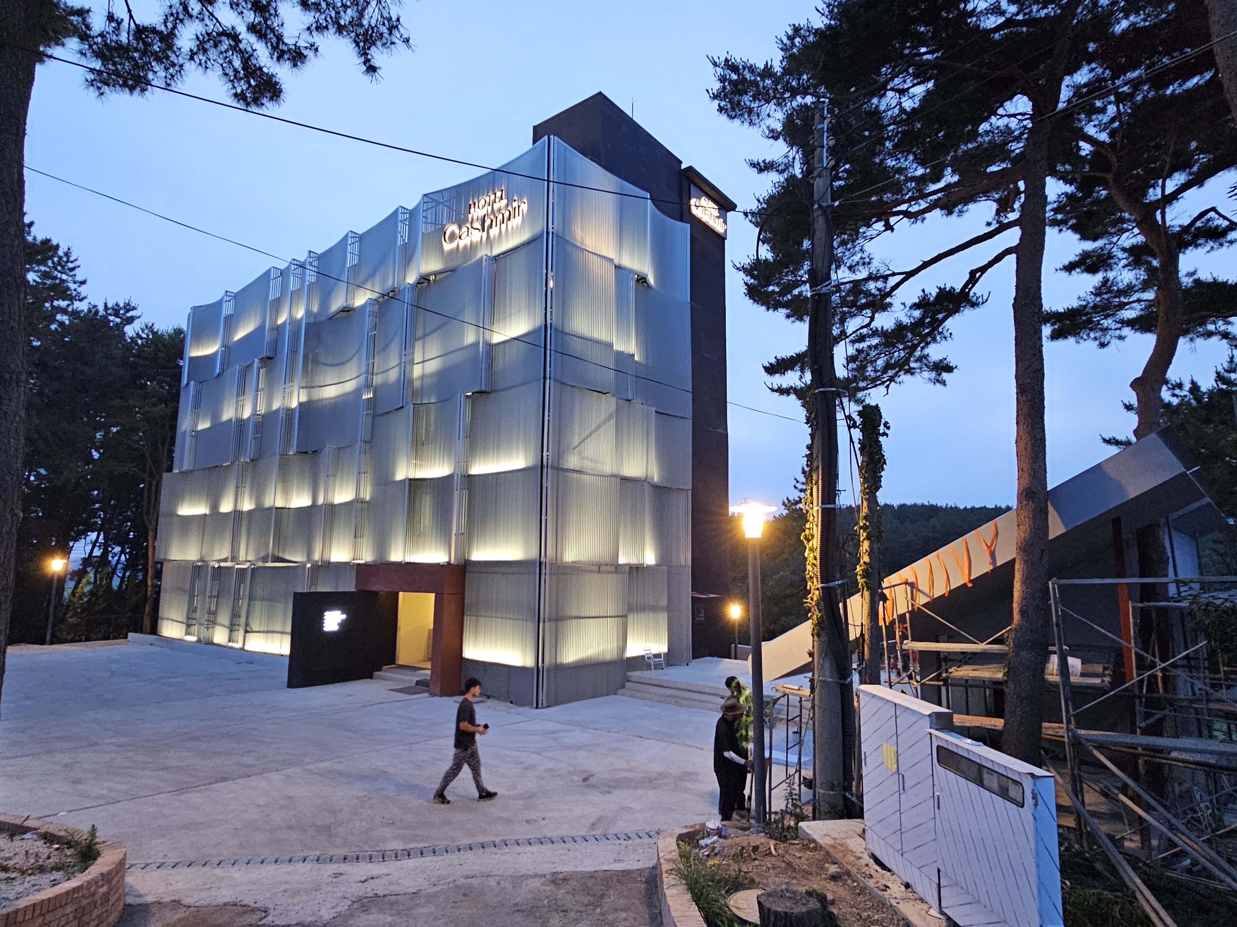 변화의 출발점은 입면에서 시작되었다. 도로를 면한 전면부에는 세로형 알루미늄 루버를 배치해 수직적 리듬을 강조하고, 기존의 단조로운 입면에서 벗어나 보다 유려한 곡선을 가미했다. 이는 단순한 미적 조형을 위한 변화가 아니다. 루버는 빛과 바람의 흐름을 조절하며, 시간의 흐름에 따라 다채로운 그림자를 드리운다. 낮과 밤, 계절에 따라 변화하는 이 표정은 호텔의 정체성을 새롭게 정의하는 중요한 요소가 된다. 기존의 폐쇄적이고 획일적인 모습에서 벗어나, 주변 환경과의 관계를 고려한 입체적 구성으로 재탄생한 것이다.