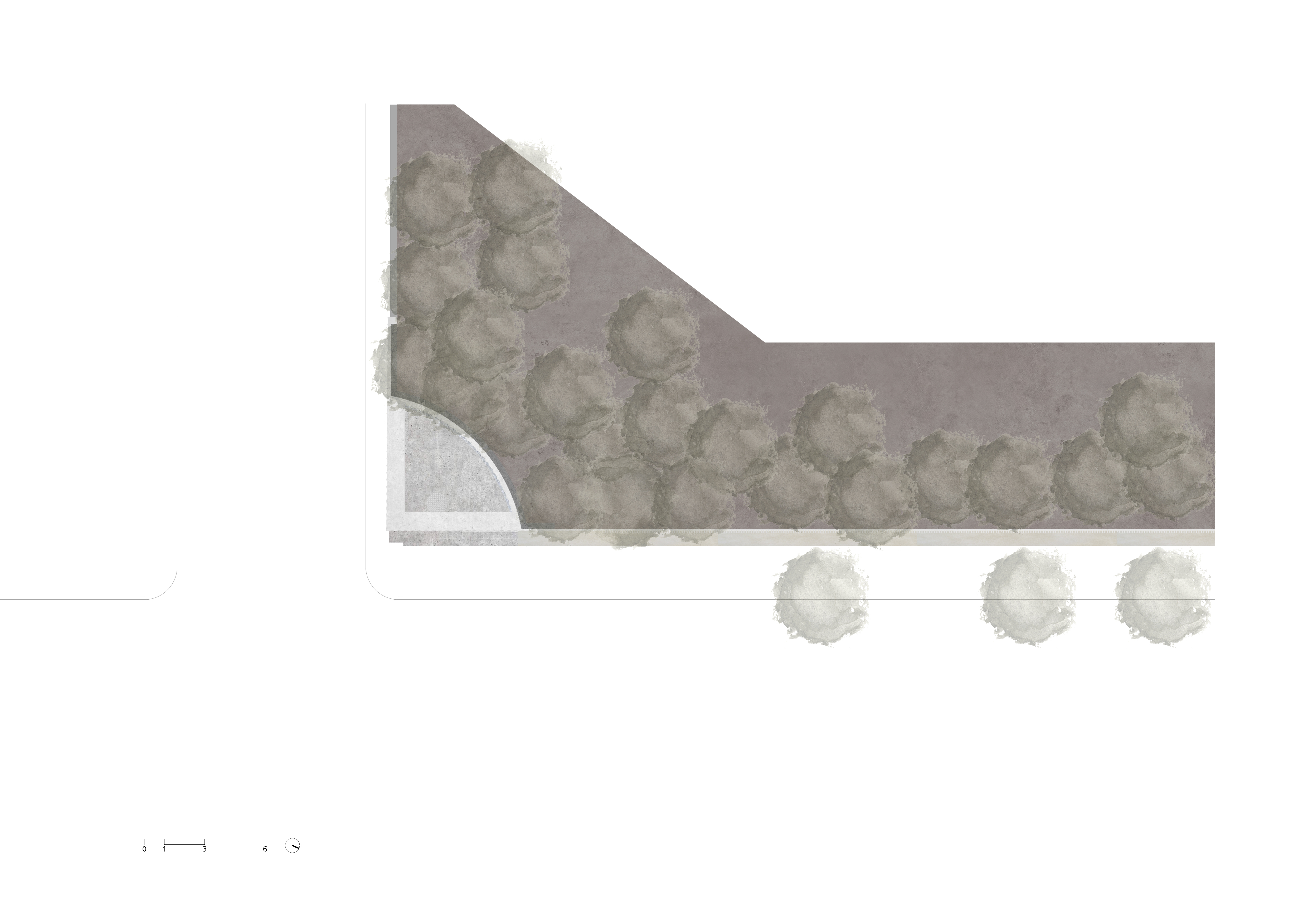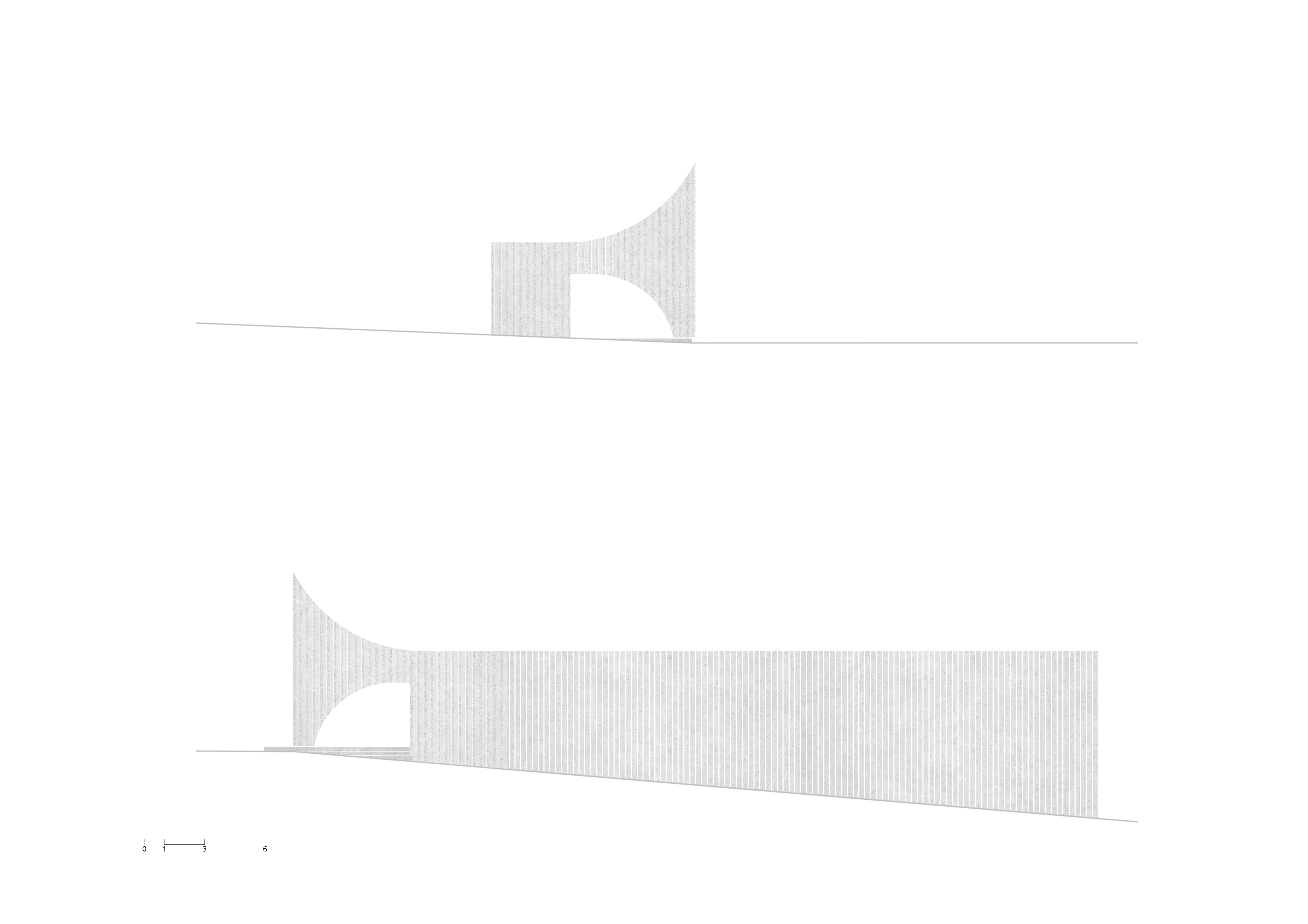 The main façade is located on the northeast roadside, so light and shadows enter the inner front yard only in the morning. A louver produced on the curved surface to add depth to the surface shows different shadows depending on the light and the natural scenery created with shadows of the plentiful pine trees escort people in their daily lives. In the yard of the pavilion, people can look up at the sky in between the structure and appreciate the light that shines upon them while restfully embracing the shade. The white wings will demonstrate a vivid presence and function as a new public landscape of the area.