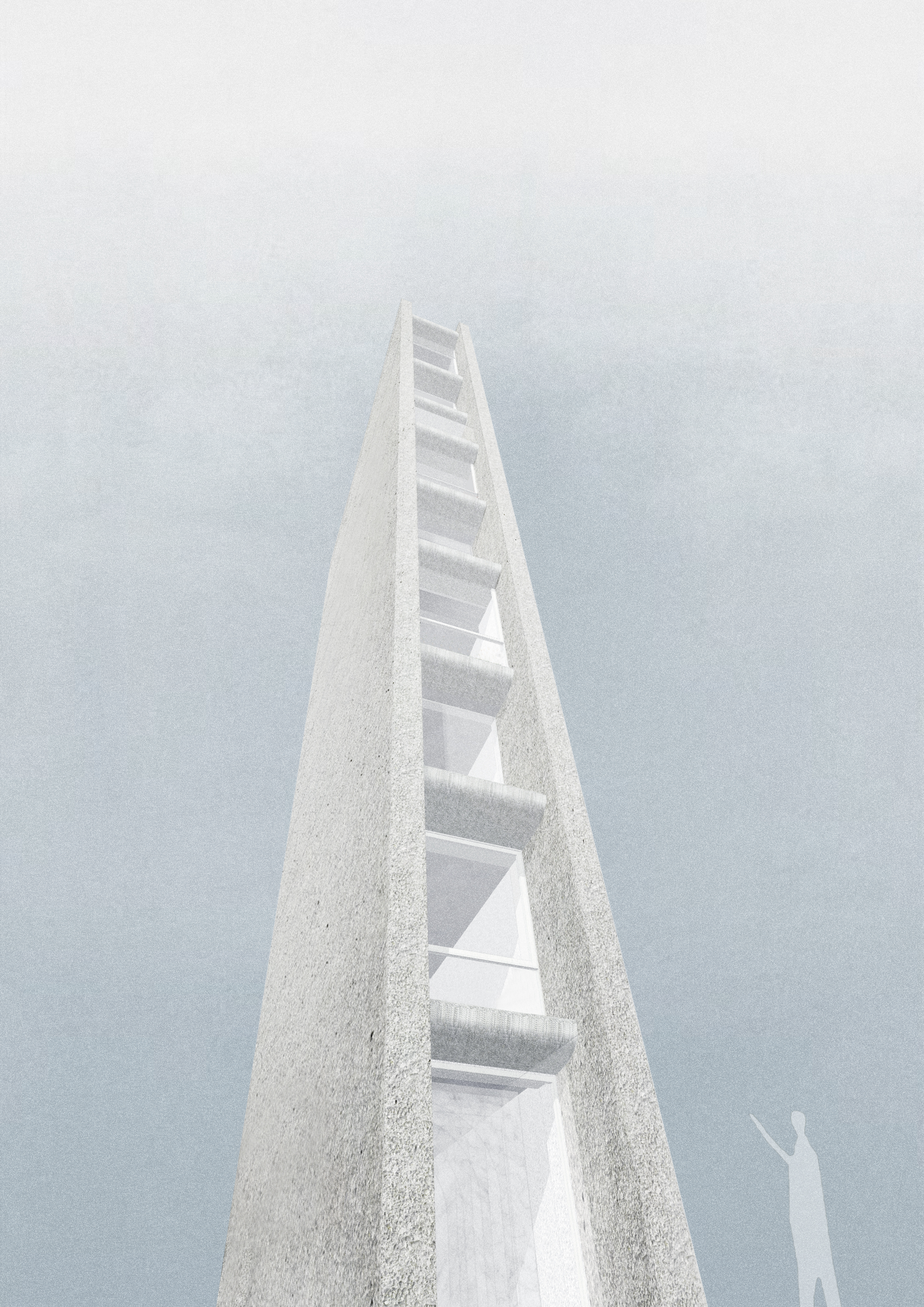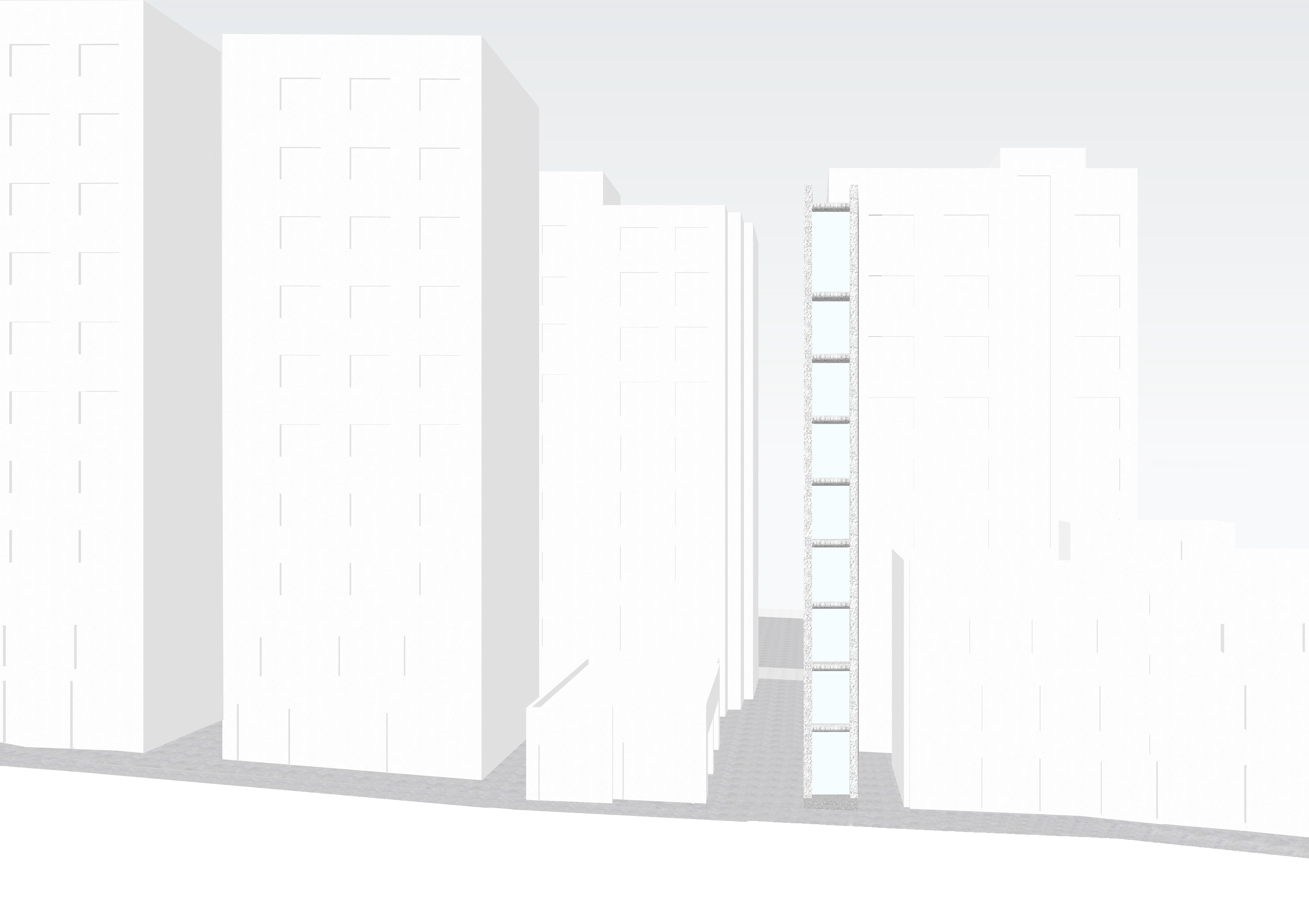 폭 2.2m 길이 9m의 공간에 안쪽에는 4인승 엘레베이터가 있다. 이 공간은 상업지역의 용적률을 최대한 활용하기 위해 높이 25m, 지하1층 지상9층으로 지어진다. 6m 폭의 좁은 길에서 고개를 들어올려 봐야 그 끝을 볼 수 있을 정도이니, 사람 의 존재가 약하게 느껴질 정도이다. 자연은 인간에게 풍요와 안식을 주기도하지만 깊고 빼곡한 숲속에서 느끼는 고독과 높은 절벽이 주는 경외 심, 세찬 바람과 거센 흔들림은 공포감을 주기도 한다. 위대한 자연으로부터 경이로움을 느끼듯 이 땅에 빌딩숲 사이의 틈에 세워진 벽체 사이 틈은 공간이 되어 그 스케일에서부터 압도적인 분위기를 전한다. 도시의 틈은 유휴지로 남을 수 있었으나 주변 빌딩숲의 반열에 올라 공간, 빛, 구조체의 원초적인 본질을 탐닉하게 한다.