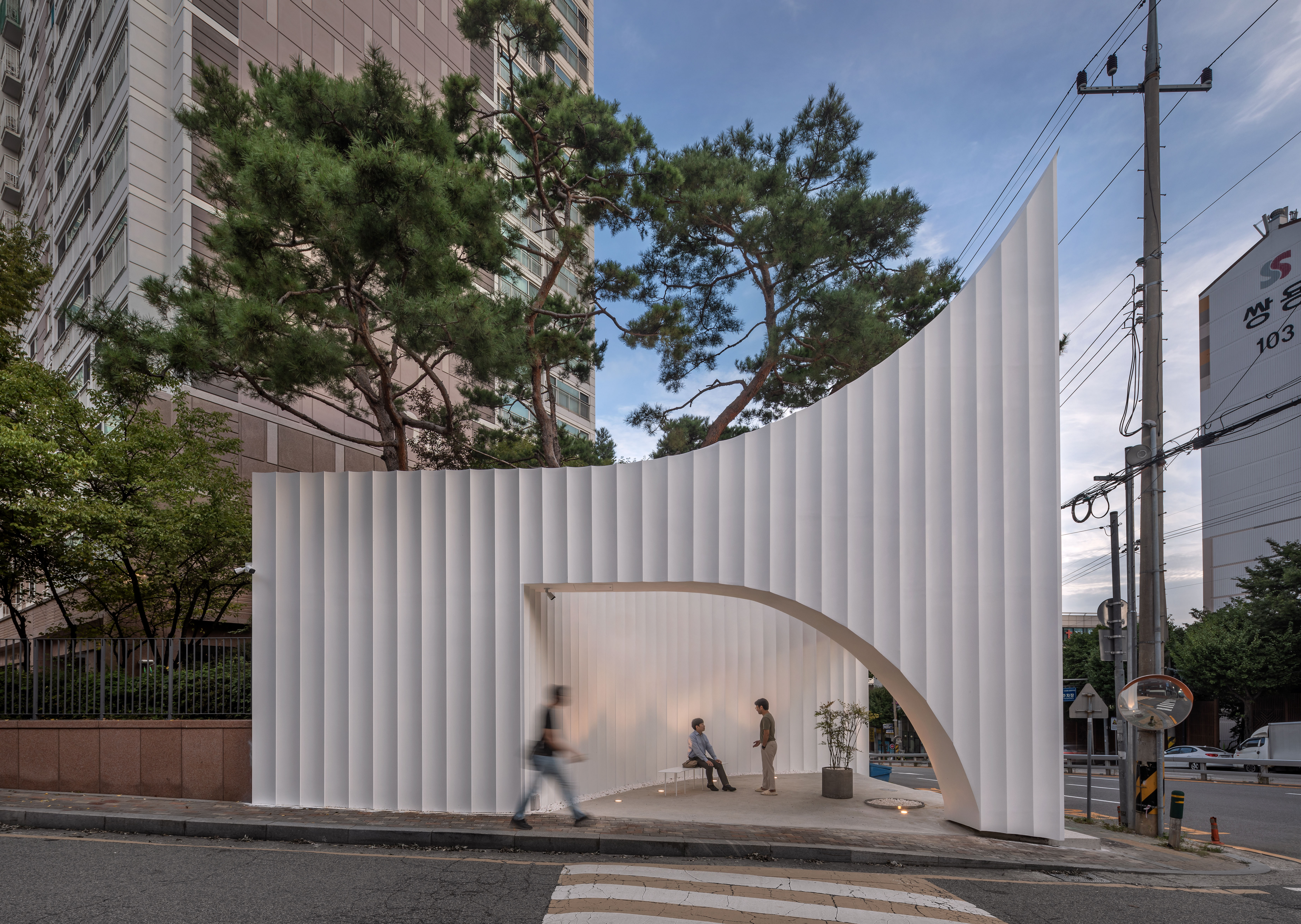 A pavilion that brings up the image of white wings was presented on the corner of a site facing the apartment complex in Gunpo, Gyeonggi-do. This structure appears with a form as if both wings are spreading out with the corners as the center, and became completed by extending from the walls of the apartment complex that is 40m long. The size of pavilion designed by installing a metal curved wall module on the front that is 12 meters wide and 9 meters high.