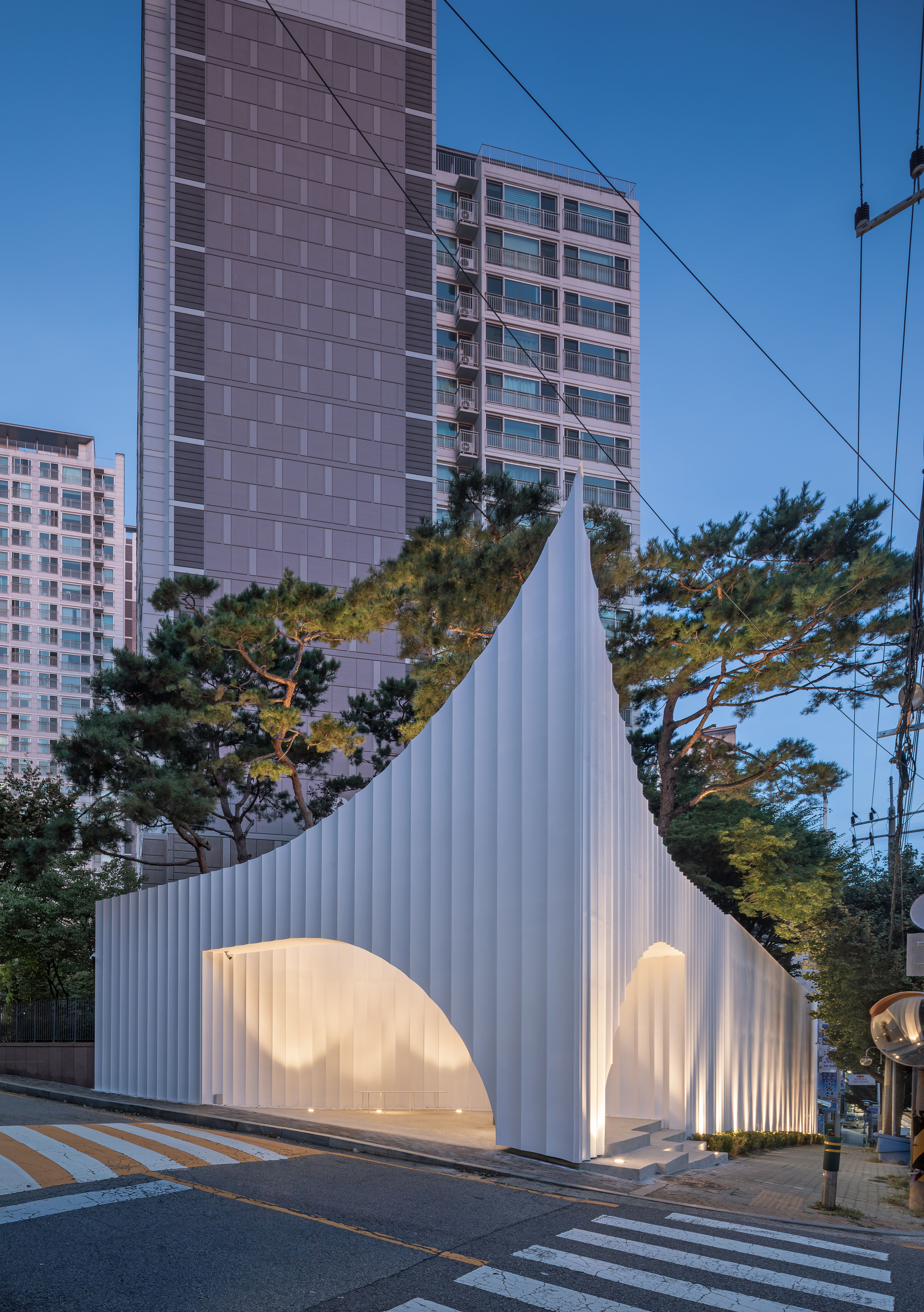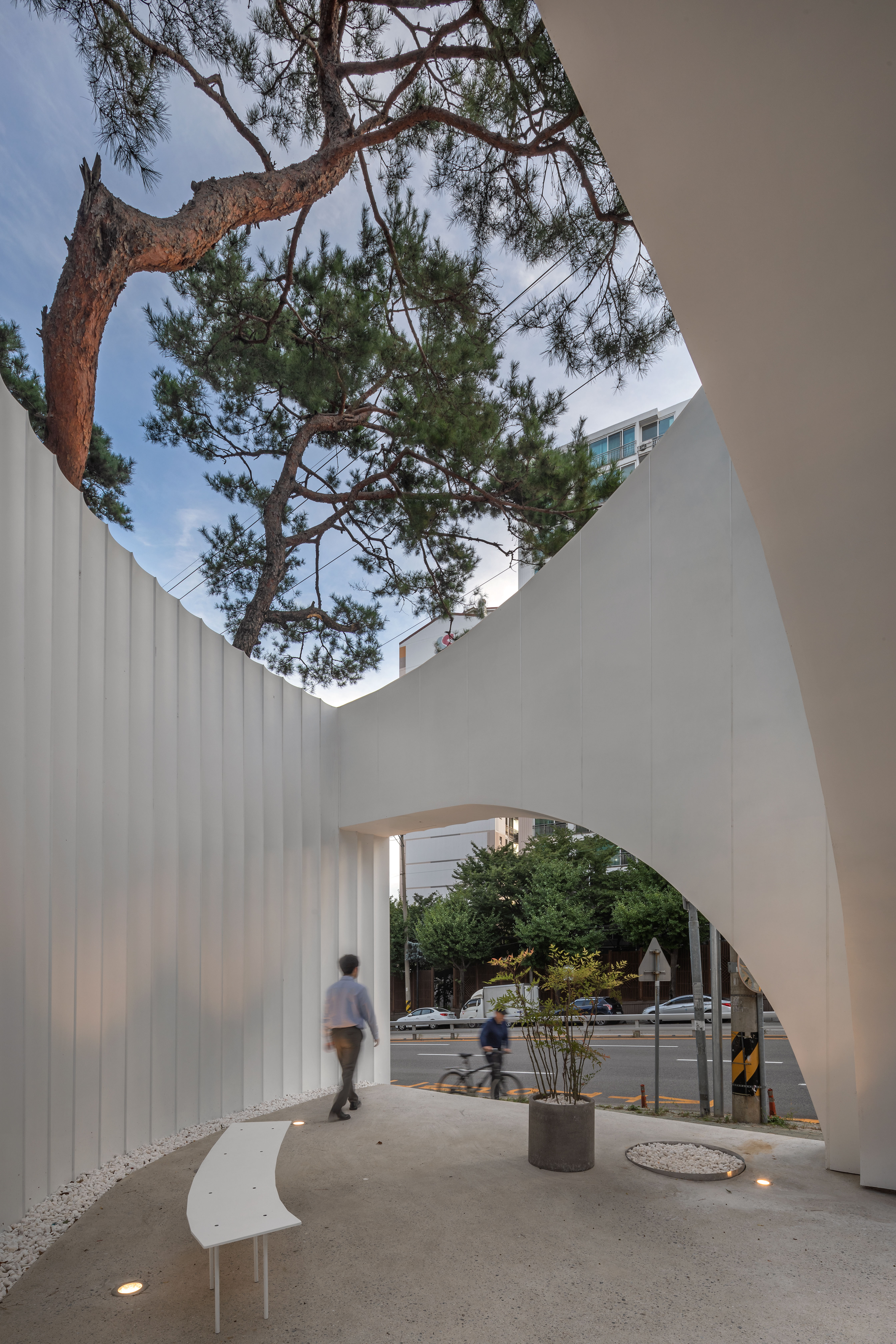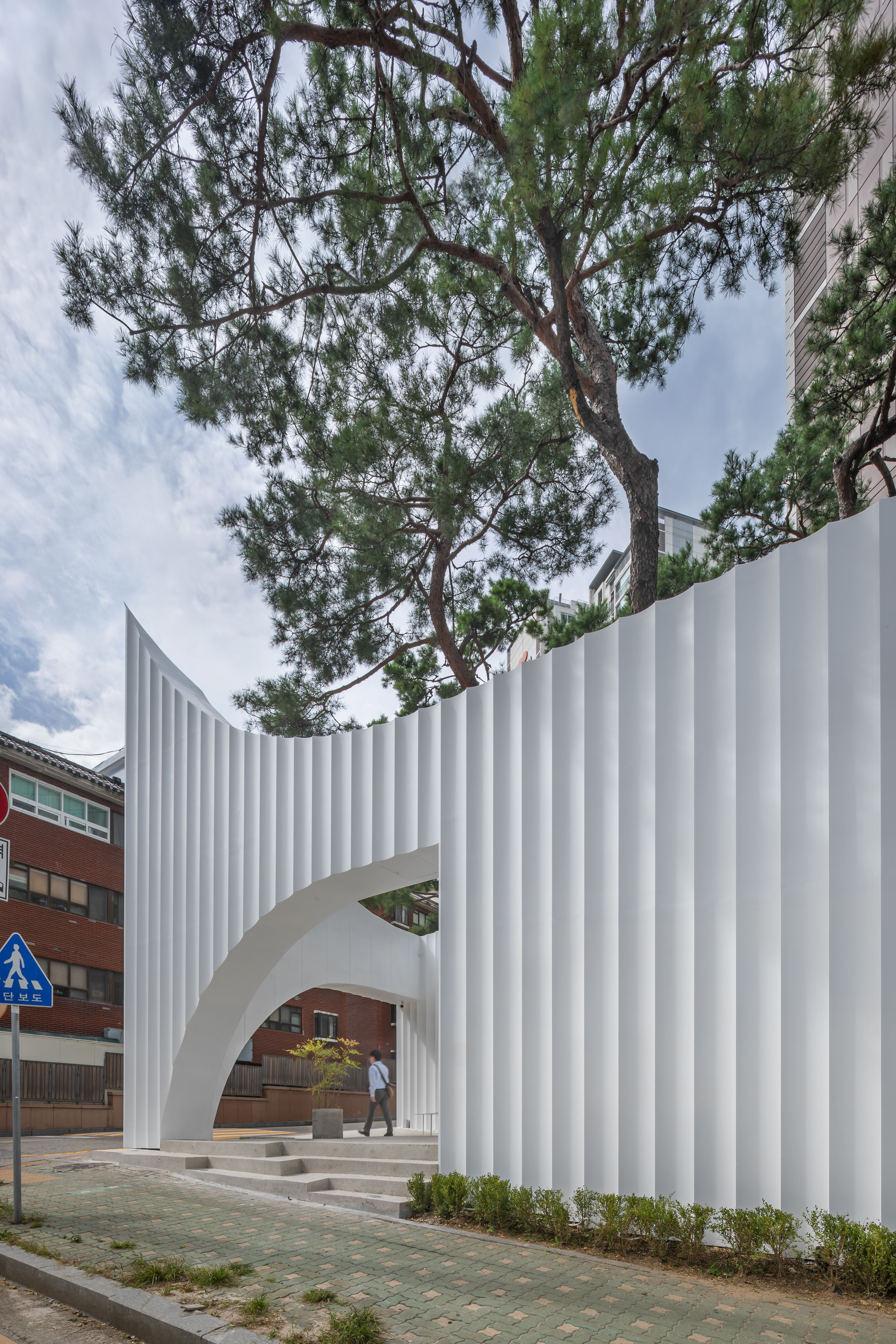 A pavilion that brings up the image of white wings was presented on the corner of a site facing the apartment complex in Gunpo, Gyeonggi-do. This structure appears with a form as if both wings are spreading out with the corners as the center, and became completed by extending from the walls of the apartment complex that is 40m long. The size of pavilion designed by installing a metal curved wall module on the front that is 12 meters wide and 9 meters high.