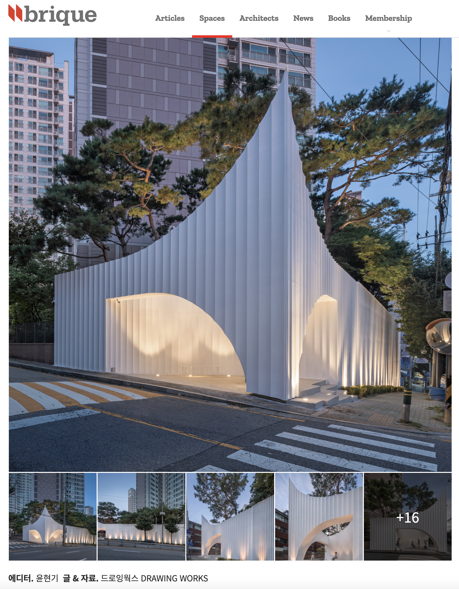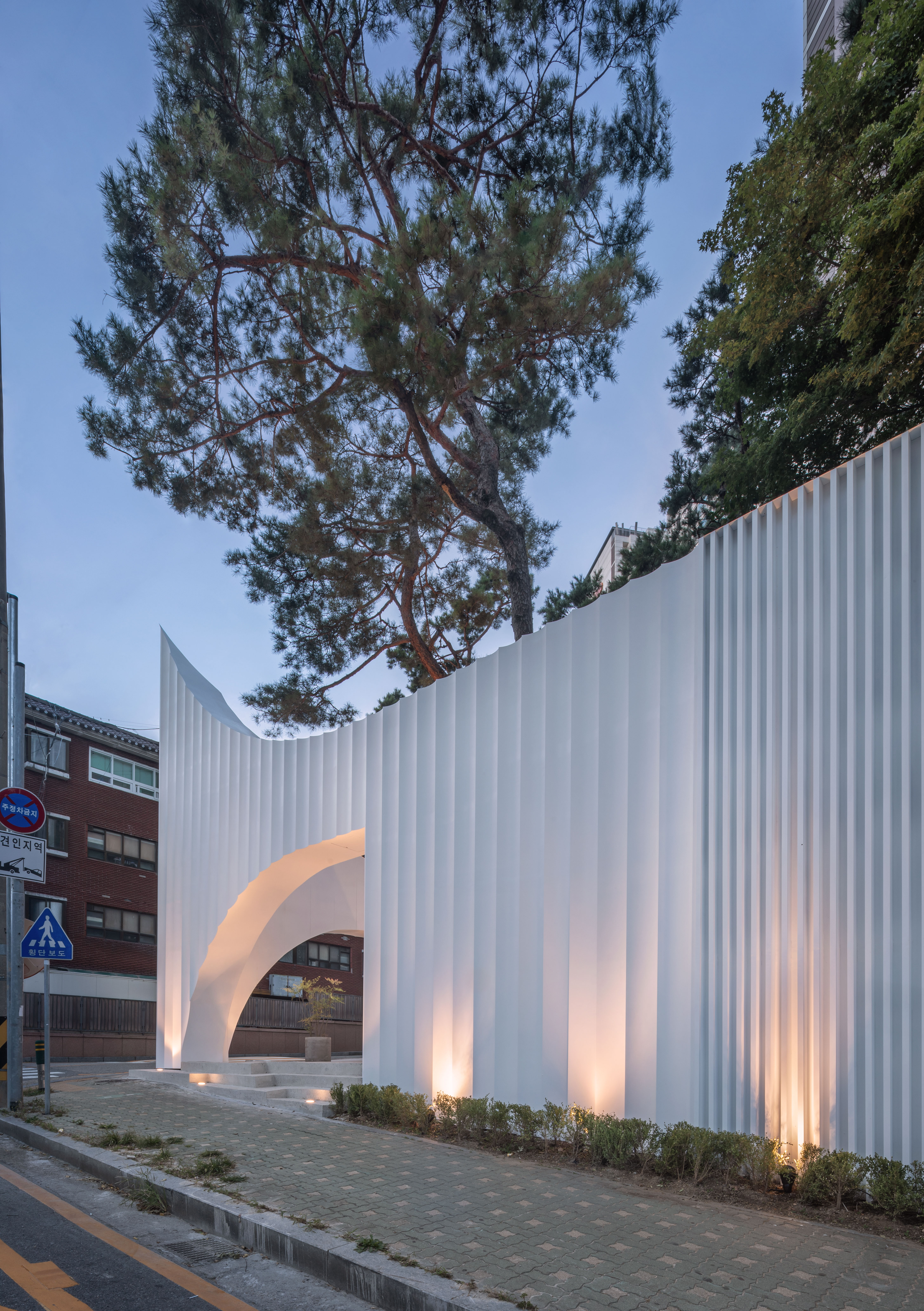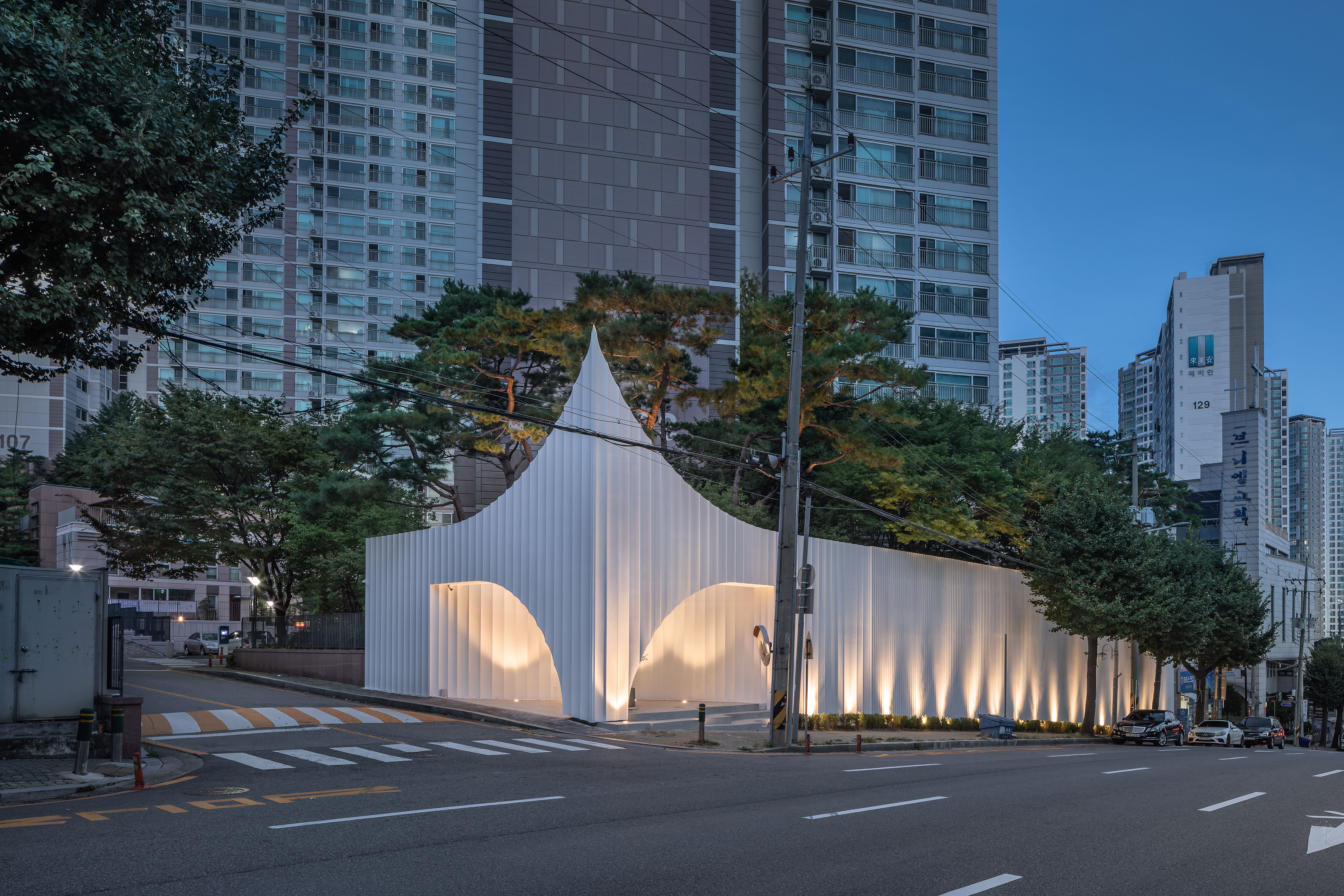 A pavilion that brings up the image of white wings was presented on the corner of a site facing the apartment complex in Gunpo, Gyeonggi-do. This structure appears with a form as if both wings are spreading out with the corners as the center, and became completed by extending from the walls of the apartment complex that is 40m long. The size of pavilion designed by installing a metal curved wall module on the front that is 12 meters wide and 9 meters high.