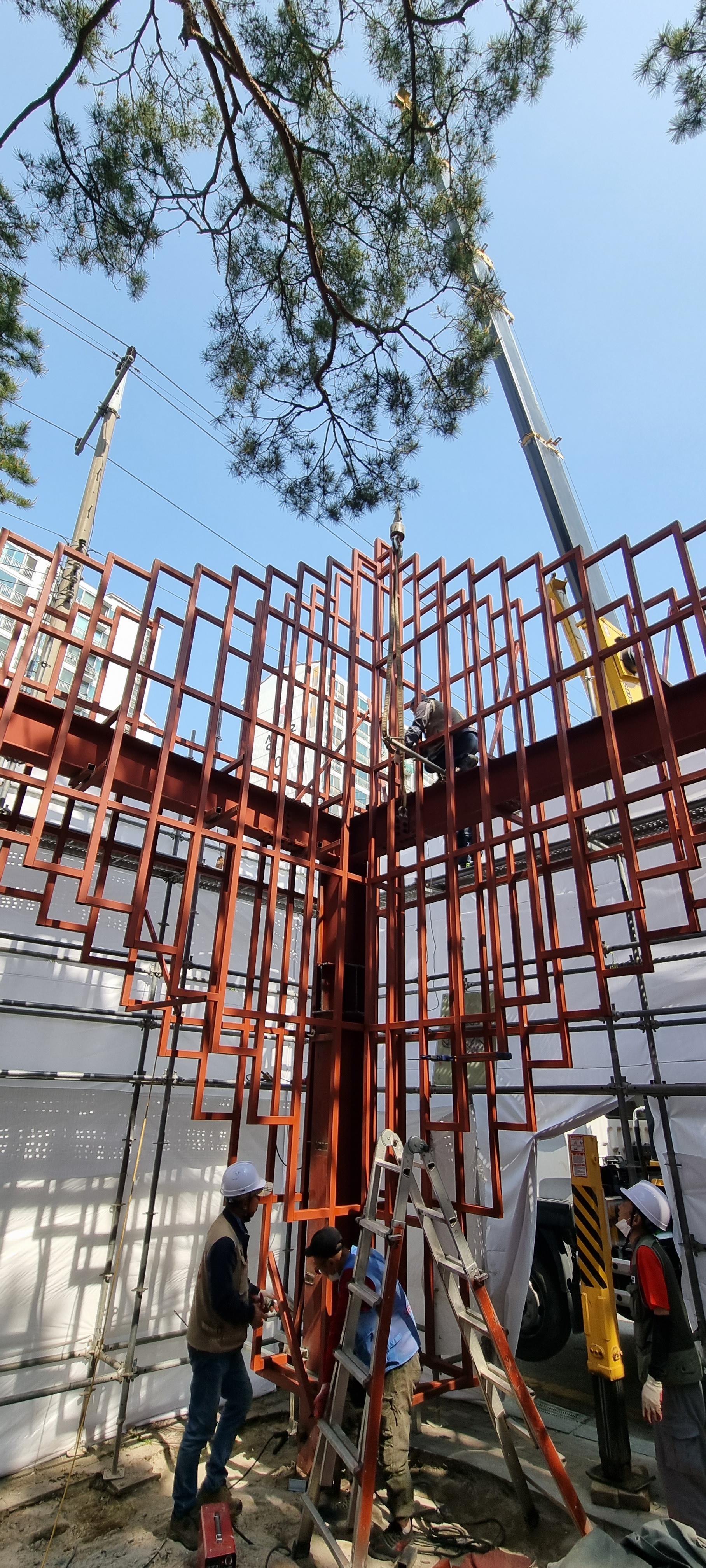 At first, this project began to produce the main entrance of the apartment complex. Although the apartment complex is next to a six-lane road, the gate structure (main entrance) could not be designed on the main road because of the condition of the arrangement and had to go around the village road to enter the apartment complex. For a while, a symbolic foundation was operated but it closed down because of the low yearly operating ratio and changed into a structure that protects the corners. However, the cognitive awareness was low so the representative association of the residents in the apartment requested to design a gate structure so that the apartment stands out just like other apartments. It was a conclusion that they came up with to enhance the property value of their apartment. Recently, this phenomenon is often raised as an aspect of collectivism in the media. After holding numerous meetings with the representative association of the residents, the intent was to design a measure that reflects the symbolism desired by the residents and also a facility that can be used by many while considering the village landscapes. Although the residents of the apartments are the owners of the land in the corner, it was anticipated to design a space open to the neighboring village residents and also keep passersby from thinking of it as private possessions. The ‘design service of the gate structure for 00 Apartment’ was redefined as ‘Sanbon Pavilion-White Wing’ and the pavilion form was put forward. The origin of the term ‘pavilion’ is ‘papilio’ in Latin meaning ‘butterflies.’ In our language, it carries the meaning of a ‘temporary structure.’ In urban spaces that are thoroughly filled and structured for residence, consumption, and leisure life, a pavilion is built without a purpose in the vacant space on the corner of the apartment to function as a margin space to give people a chance to enjoy leisure. It will offer an opportunity for the local residents to break away from the chaos of the city and enjoy rest for a moment.
