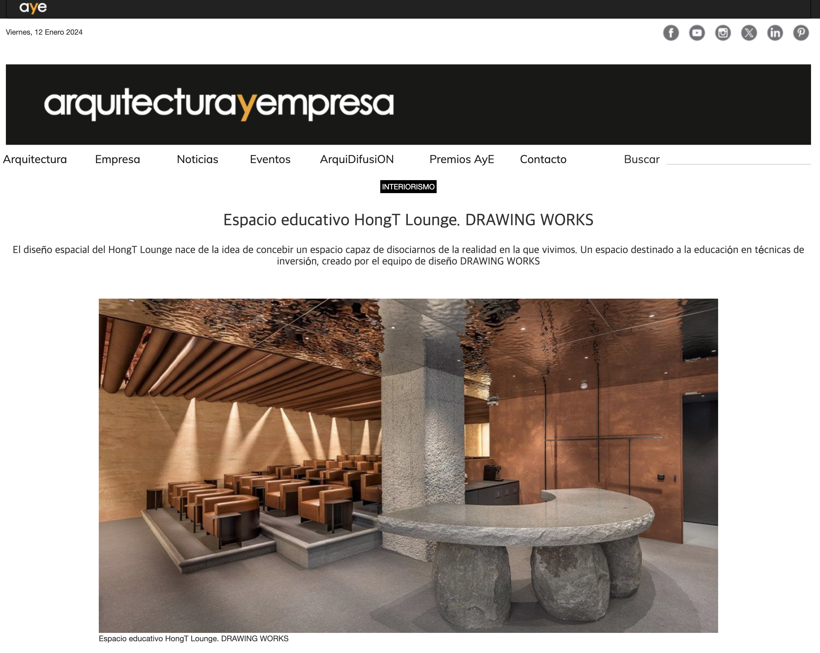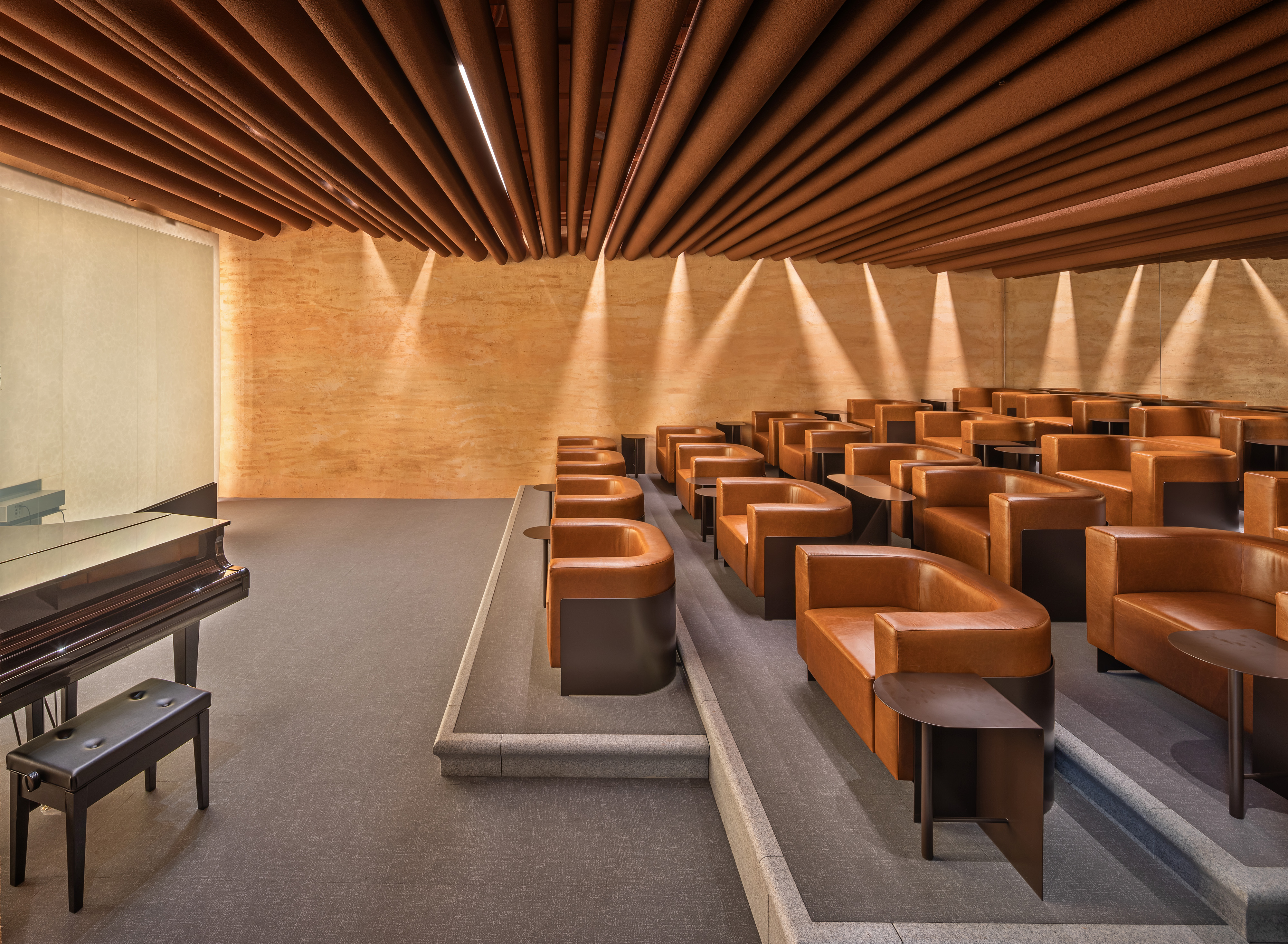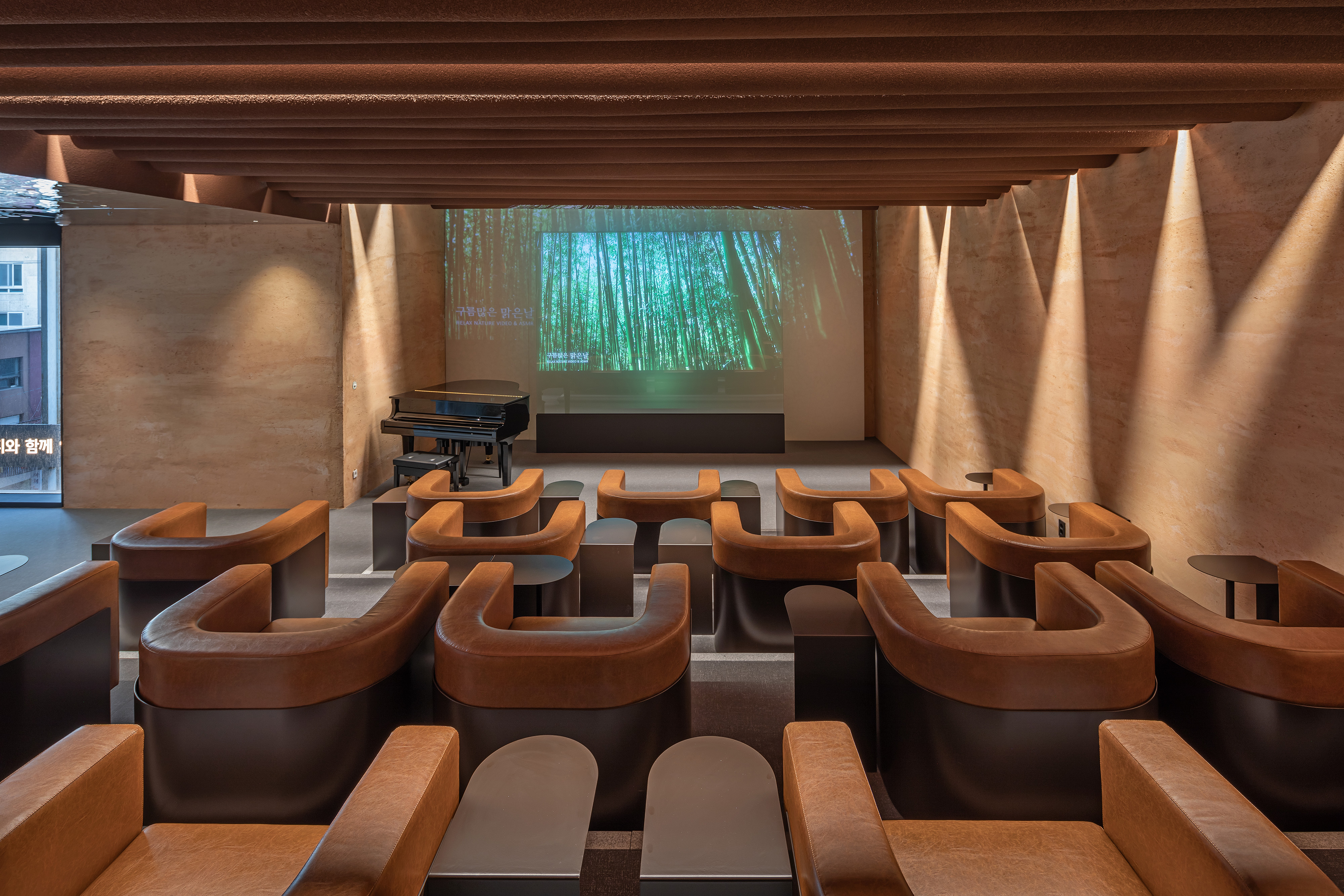The weight of the stone, the shimmer of the metal, the porosity of the earthen walls, the light streaming through the ceiling louvers, and the brilliance of the Alabasta lighting overwhelm the space. Each material is shaped with its own unique physicality and technique to create an atmosphere that is transcendent and cosmic in scope. For example, Director Christopher Nolan's Inception explores the time difference between dreams and reality, and another film Interstellar shows the difference between the subjective and physical passage of time by using the time difference between space and Earth. At the same time, he conveys scenes that keep the audience on the edge of their seats in suspense through the massive scale. The lounge space creates an overwhelming atmosphere by presenting the materiality and scale of materials and expands the territory of people in it while time passes imperceptibly. Although the pursuit of money is often associated with urgency and haste, the lounge was established to foster a culture of slowing down, relaxation, and alternative time usage. The entire area is split into two parts. The circular table, located upon entering the room, secures a unique atmosphere, and a weighty stone is also there. The stacked earthen walls and the filtered light through the ceiling's curved louvers in the lecture hall establish a captivating and jubilant display of color. As a result, the lecture hall becomes an expression of HongT's brand identity and narrative. We believe that this space illustrates a synesthetic perspective as an homage to a transcendent space, bridging the East and West.