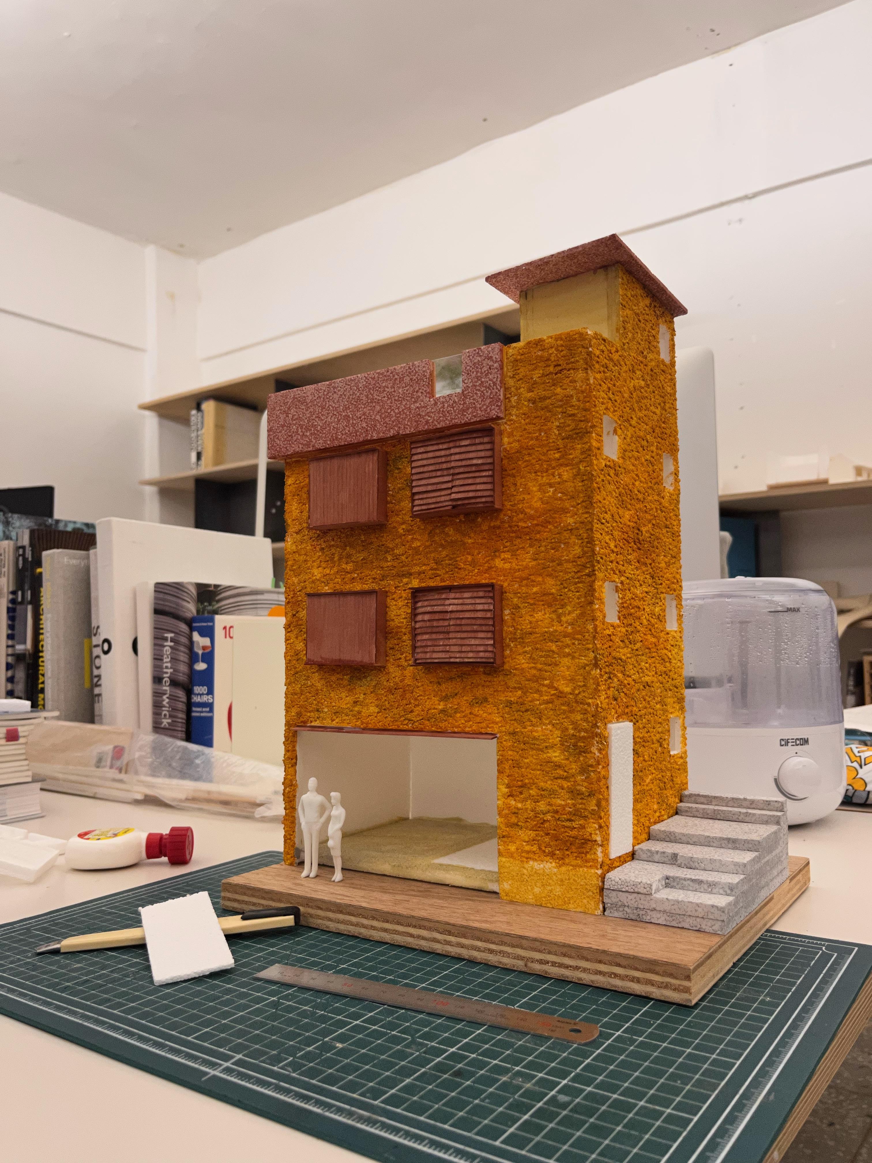 주 생활 공간은 작은데 창이 여럿 있어서 층별로 창은 하나씩만 두기로 했다. 더구나 맞은 편 집과 시선이 교차되어 생활에 불편하기에 외부에 창살을 설치해서 차단을 한다. 창살을 통해 밤에는 불빛이 새어 나온다.