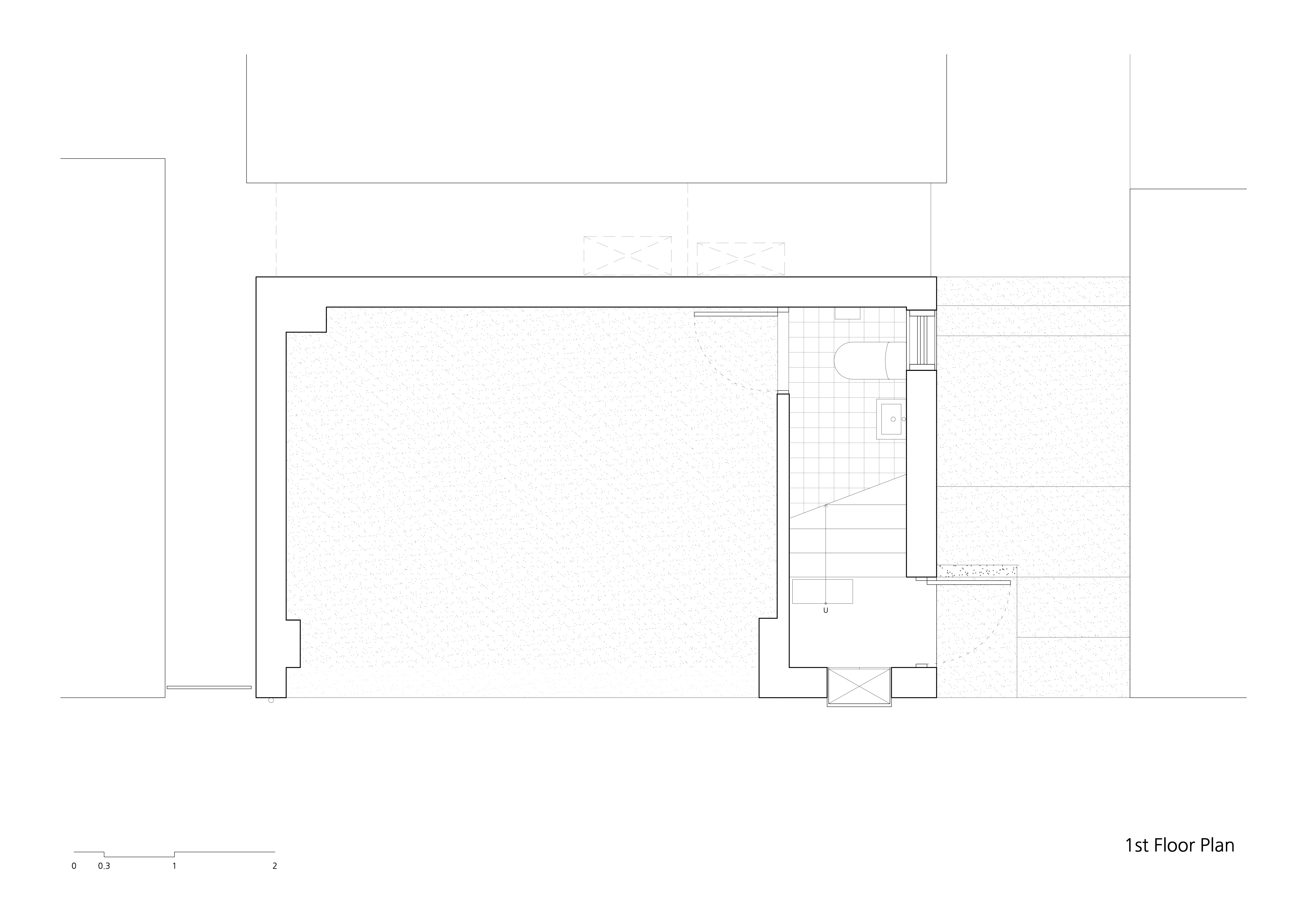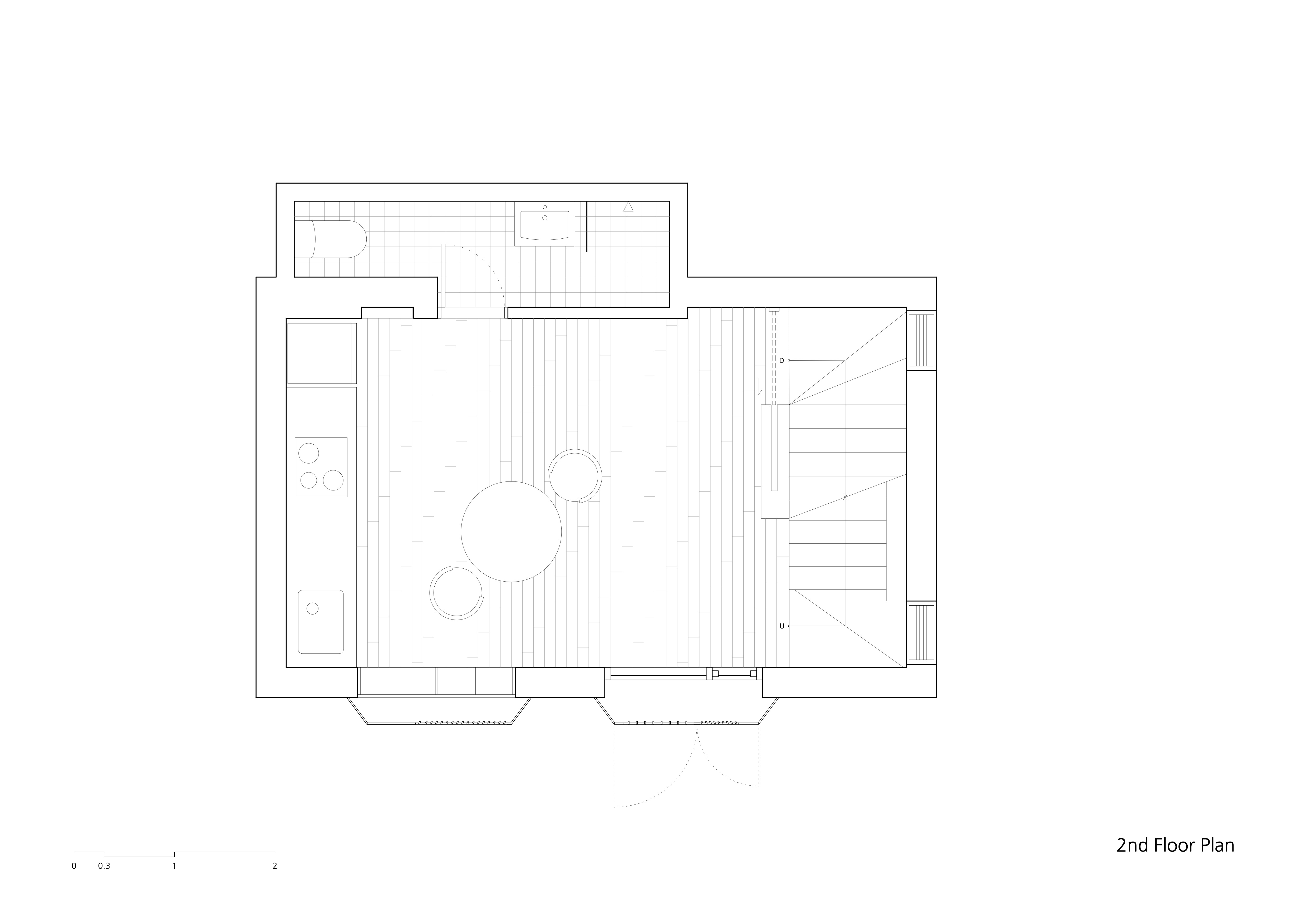 1층은 도로에서 직접 출입이 가능한 주차장이지만 작업실 또는 작은 갤러리로 이용 가능성이 있다. 좁은 길에 면한 4층 이내의 다세대 다가구주택이 이어지는 풍경에 골목 갤러리를 기획하여 일상속 예술을 실천하며 예술 속에서 살아가는 사람들이 많아지길 기대한다. 내부 공간은 협소한 주택이기에 계단실이 전층을 관통하며 공간을 연결한다. 1층 현관에서 2층으로 올라가면 거실겸 주방 그리고 화장실이 있다. 기존에 화장실이 있던 자리를 철거하여 주방 가구를 확장했고 화장실은 가장자리로 이동했다. 3층에는 침실이며 세탁실을 포함했다.