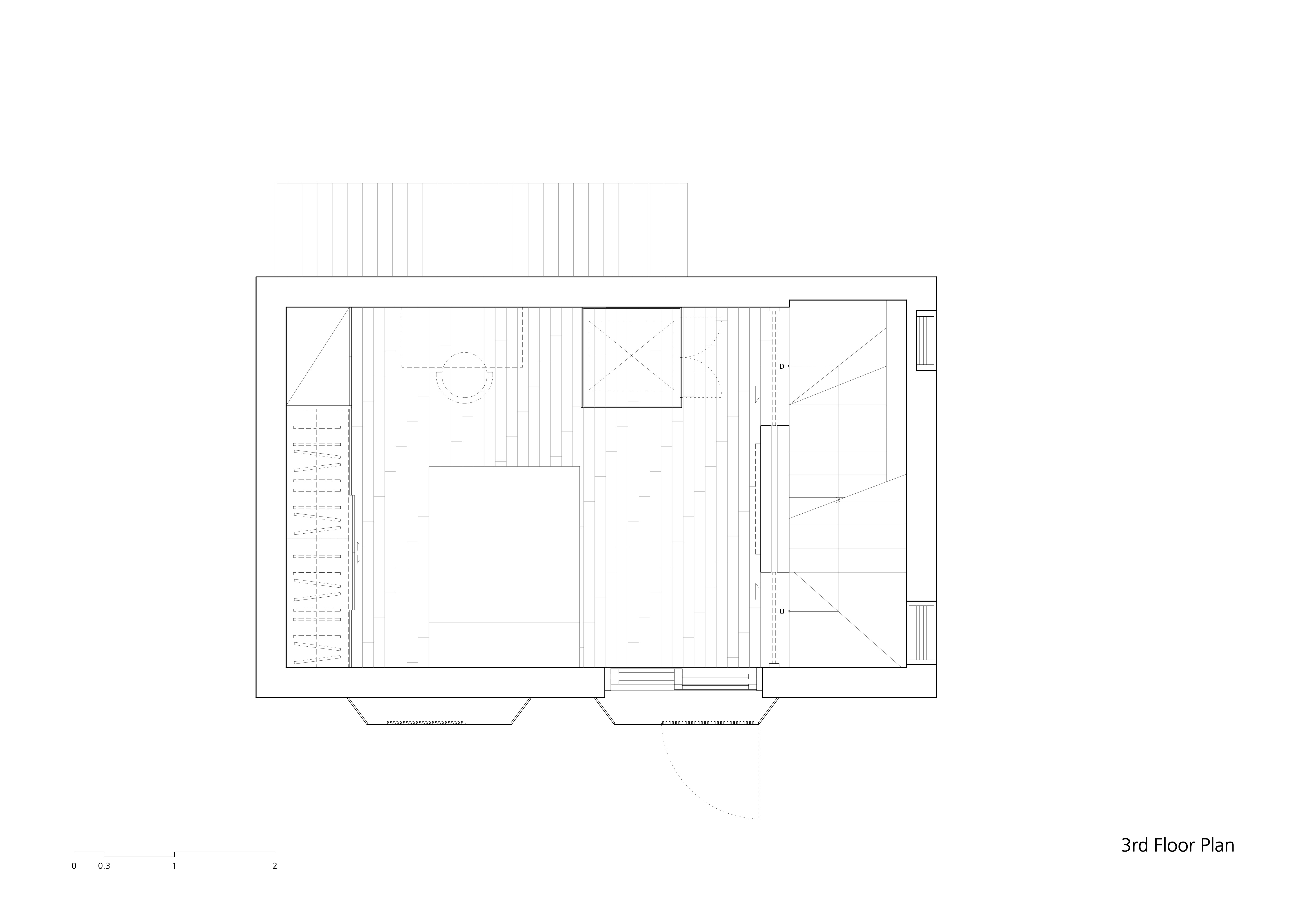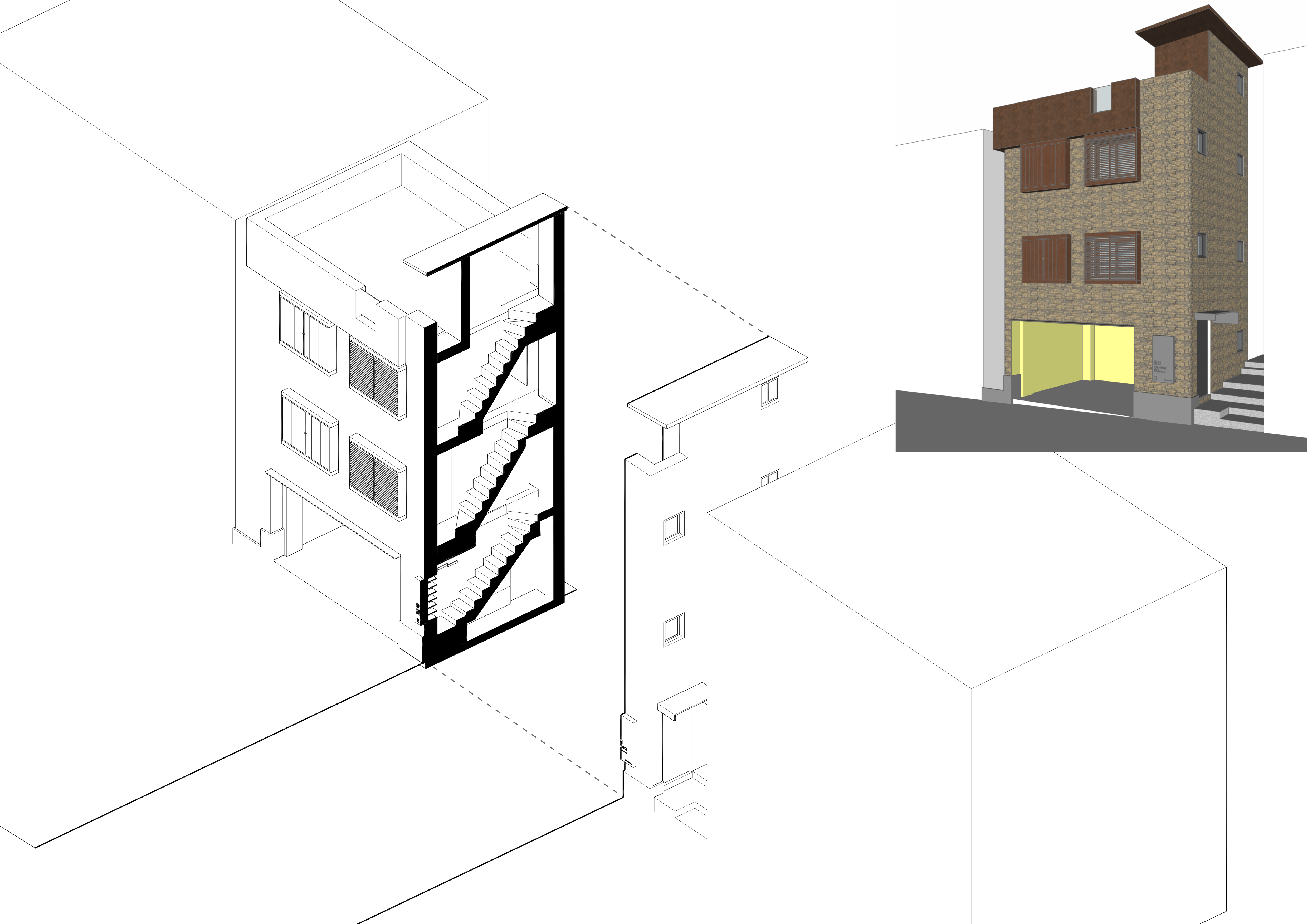 행촌동에 무명의 건축가가 집을 지어준다면 동네 사람들에게 통용될만한 모습을 보여줬어야 할것이다. 우리가 계획하는 대상은 성곽이 바로 곁에 있어 돌을 켜켜이 쌓은 마감 방식은 당시의 시대상을 담았고, 작은 필지에 지어진 평범한 주택이다. 납작하고 거친 돌을 켜켜이 쌓았지만 주로 노란색을 띄는 모습이 부드러운 인상을 보이며 매력적이었다. 그래서 우리는 이 집의 외형을 이루는 돌은 보존 가치가 있다고 생각했다. 또 하나의 특징을 가지는 외부 창호는 화강석을 세겹으로 하고 양 모서리를 빗각을 쳐서 창틀을 매달아 이중창의 역할을 하고 있었다. 행촌동에는 이런식으로 창을 만든 집들이 많이 눈에 띈다. 이 창 턱은 층별 면적이 작은 집이 주로 있는 마을의 특성상 소품을 올리는 등의 활용이 엿보이며 이웃과의 비교 의식, 그로인한 모방과 동화 심리가 강한 한국인의 국민성과 맞물려 동네 전체에 전파된 산물이다. 화강석에 설치된 샷시는 철거하고 켜켜이 겹쳐진 화강석과 형태를 따르는 목재 창호를 설치했다. 6m 도로를 사이에 두고 있는 다세대 주택과의 프라이버시 때문에라도 간살이 있는 형태의 목재창호는 필요했다. 당시의 건축 양식이라 할 만한 형태를 따르는 미학적 해결책으로 제시된 방법이다.