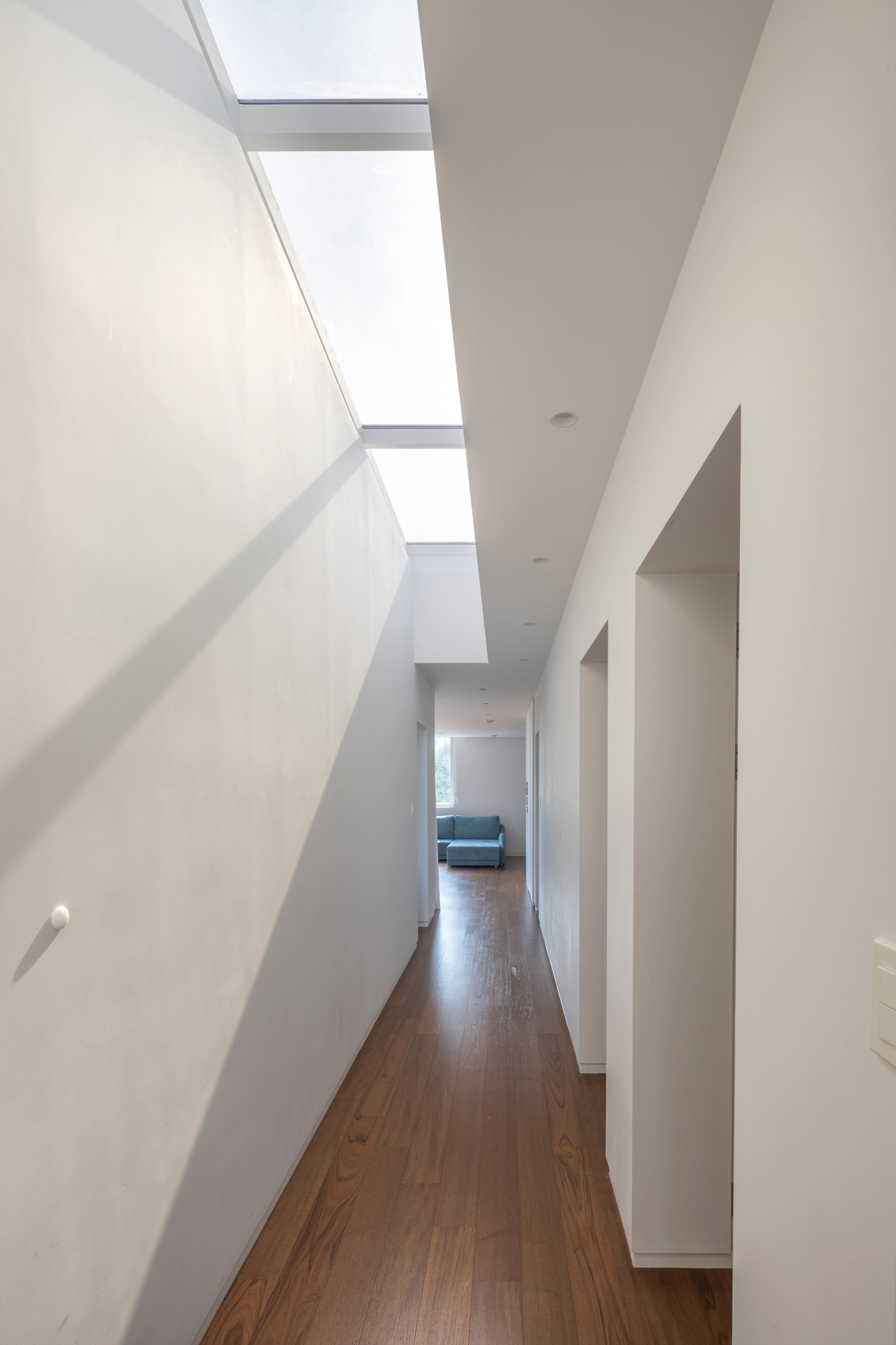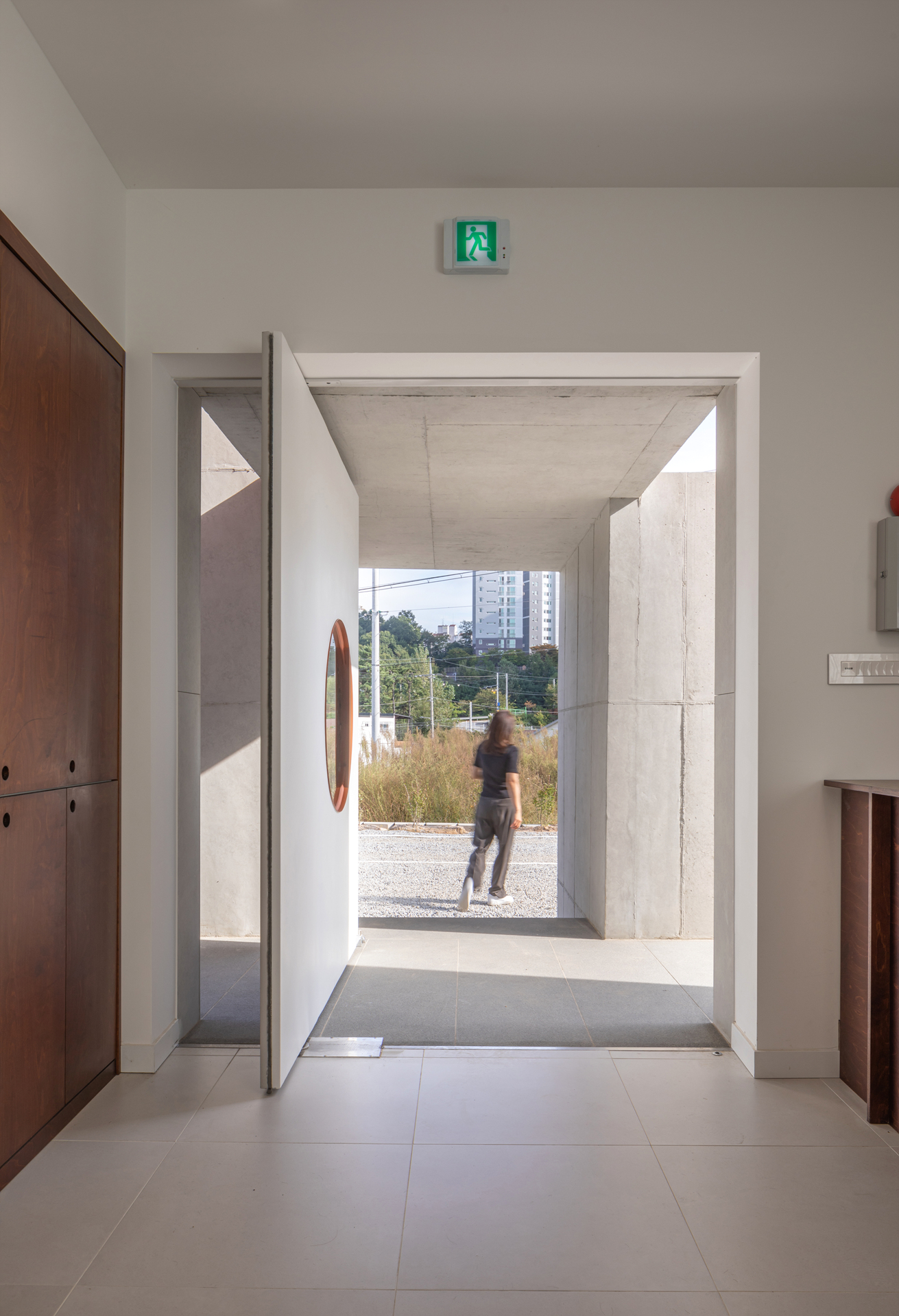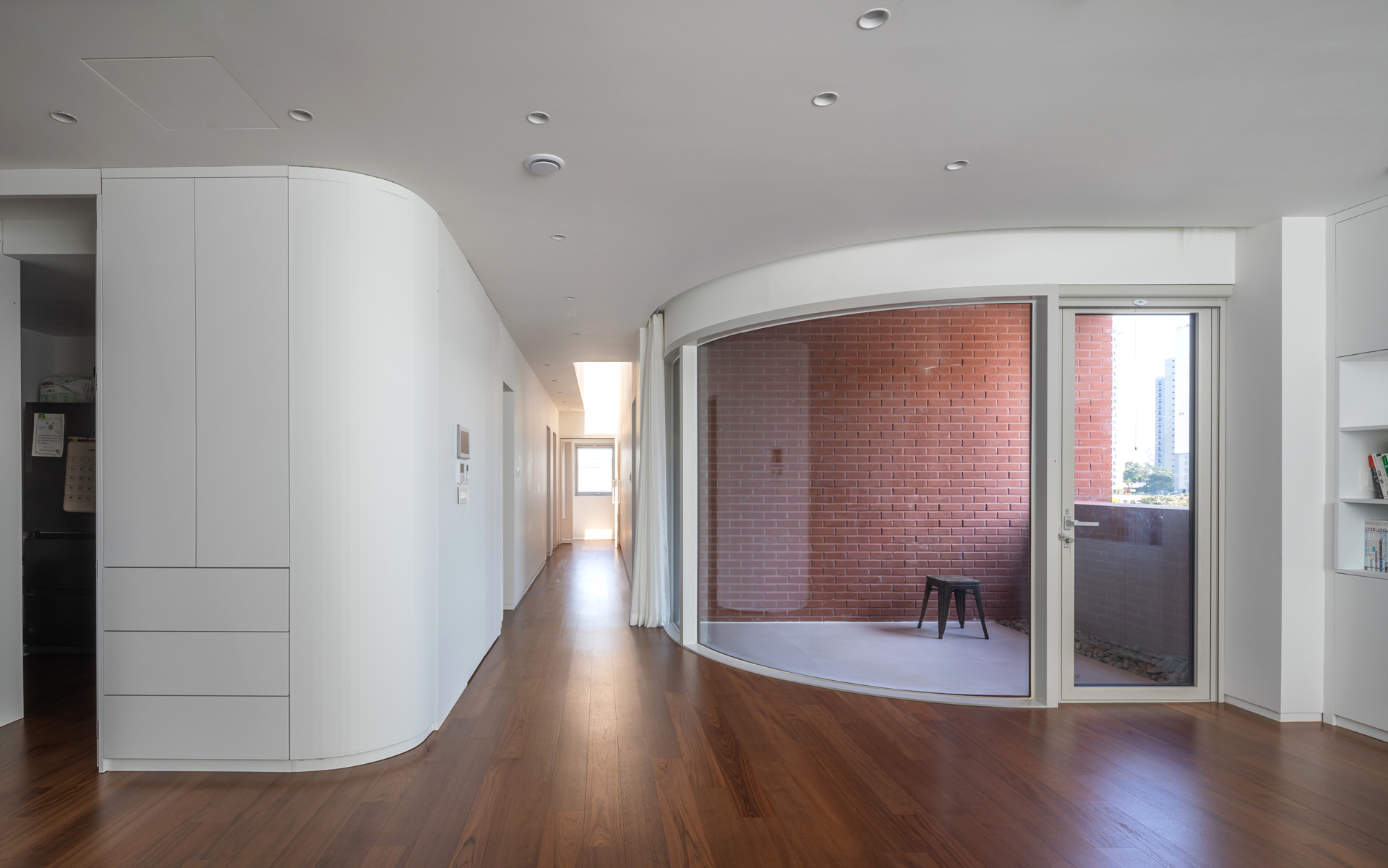 ‘에움길’이라는 이름이 시사하듯, 이 집은 지름길의 효율 대신 둘러가는 길의 풍요로움을 공간의 서사로 삼는다. 중앙 입구를 기점으로 1층의 일터와 2층의 삶터가 나뉘는 동선은 단순한 이동을 넘어 감각의 전이를 유도하는 건축적 산책로가 된다. 2층 주거 공간으로 진입하는 과정에서 거주자는 외부 복도를 따라 걸으며 하늘과 마주하게 되는데, 이는 일터에서 집으로 돌아오는 짧은 여정 속에서 심리적 정화를 경험하게 한다. 내부로 들어서면 방 세 칸이 마주하는 긴 복도가 나타나며, 이 복도 상부에 배치된 천창은 수직으로 떨어지는 빛과 그림자의 변주를 통해 공간에 현상학적 생명력을 부여한다.