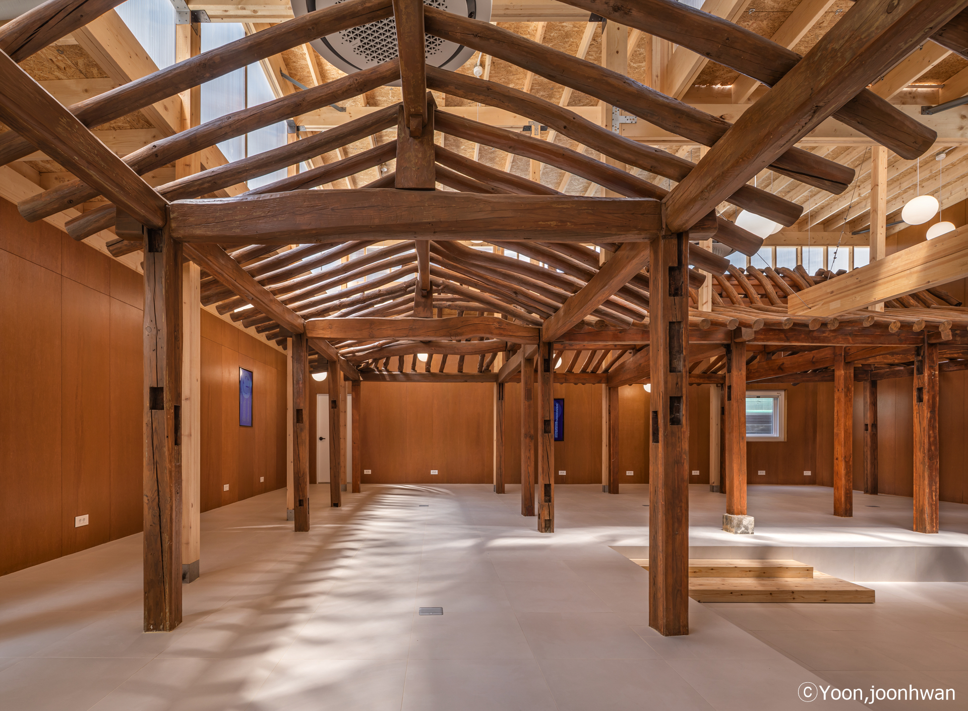 The renovated hanok (W2) is defined by two key elements: light and gaps. Preserving as much of the existing wooden structure as possible, the design introduces various gaps to allow natural light to penetrate deep into the interior. Like sunlight filtering under traditional eaves, the light casts a changing atmosphere across the space, adding depth and fluidity over the course of the day. Particularly, the voids created between layered roof structures serve not merely as structural gaps but as spatial thresholds through which the rhythms of the city and the passage of time permeate the building.