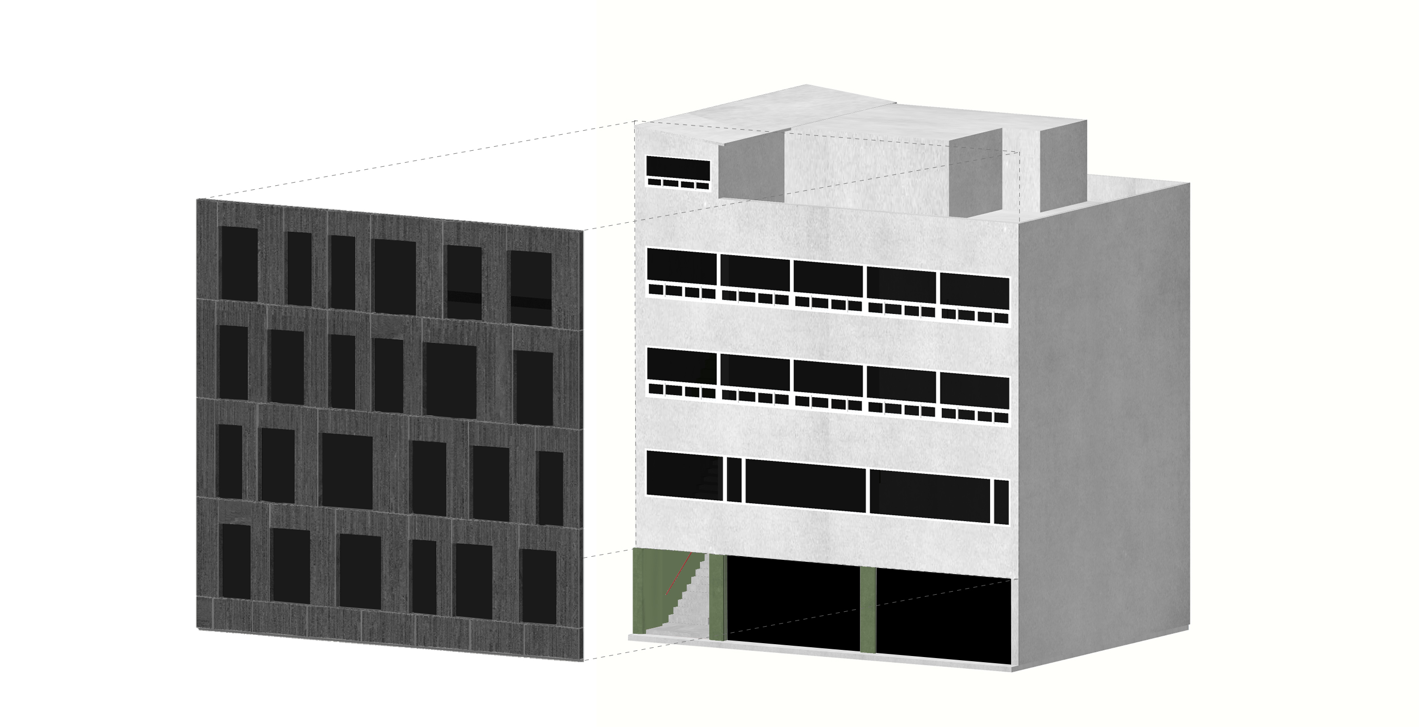 At the junction where the boulevard and backstreet intersect, an exterior stairwell resembling an alleyway has been inserted at the contact point of the two buildings. This stairwell operates as a gap - a transitional space that bridges the rupture between city and architecture while serving as a device for movement and flow. It transcends simple physical connection, weaving together the two buildings much like the historical alleys that once animated the old cityscape.
