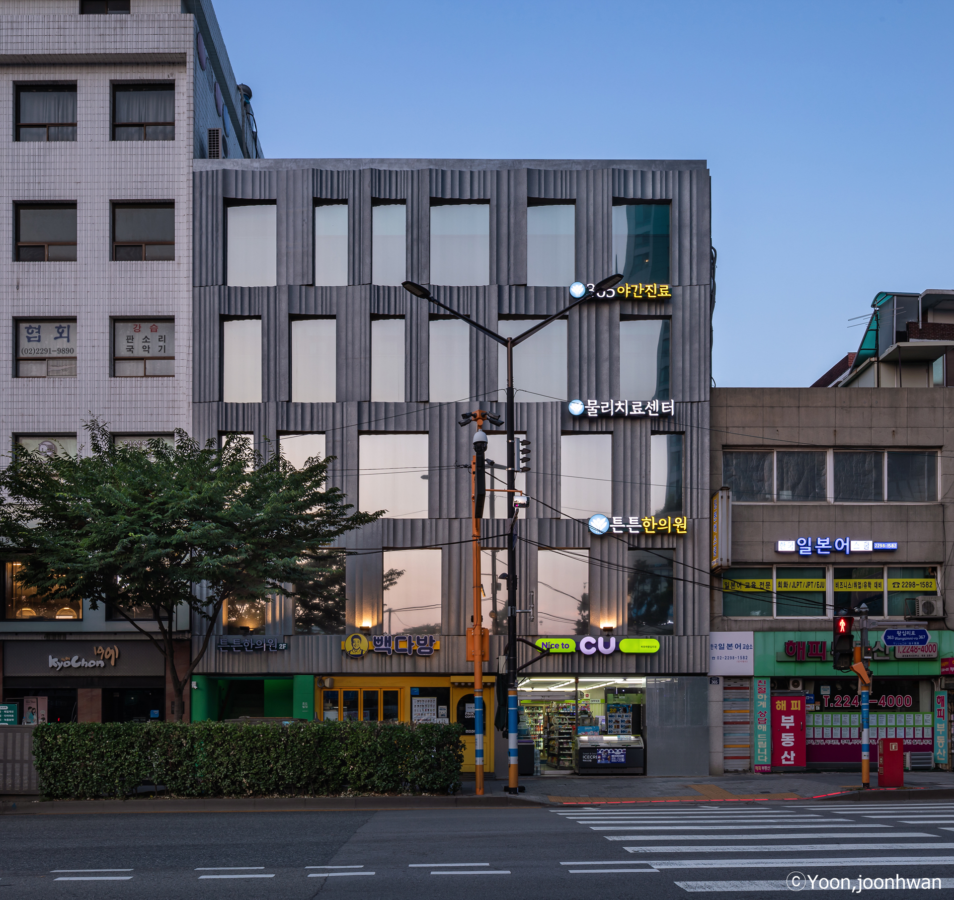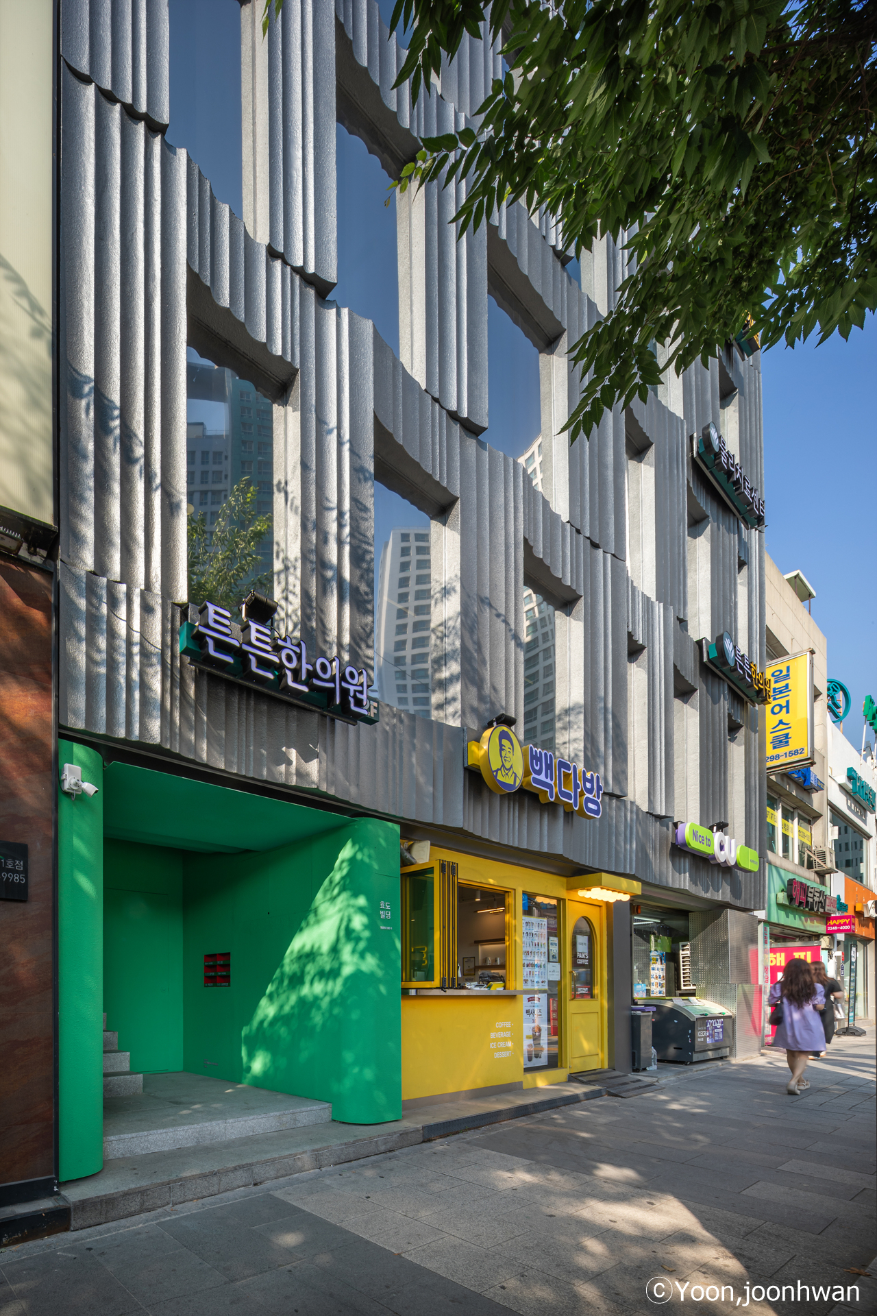 대로변 상가(W1)의 입면은 본 프로젝트의 가장 인상적인 장면 중 하나다. 우리는 사라진 한옥의 흔적을 되살리고자, 기와 지붕에서 모티프를 가져와 이를 추상적으로 해석한 입면 패널을 제작했다. 모듈화된 금속 패널은 공장에서 사전 제작하여 현장에서 조립하는 방식으로 설치되었으며, 이는 임차인 운영 중에도 공사가 가능하도록 한 전략적 선택이기도 했다.