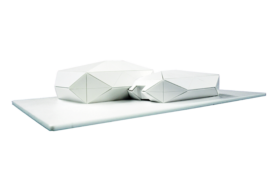 We were asked to redesign this small facility in the park with an area of 64,000 m2 after the importance of external design was pointed out and we suggested an image for the new external design expressing jewelry which is the comprehensive concept of the park. The envelope covering the two masses is framed with circular steel pipes and punching metal is attached to express the overlapped two jewelry boxes on the inclined ground by projecting the existing concrete box. It was impossible to read the context of the city, because it is a new city, but we completed imagining its current position, the function of this facility and future performance.