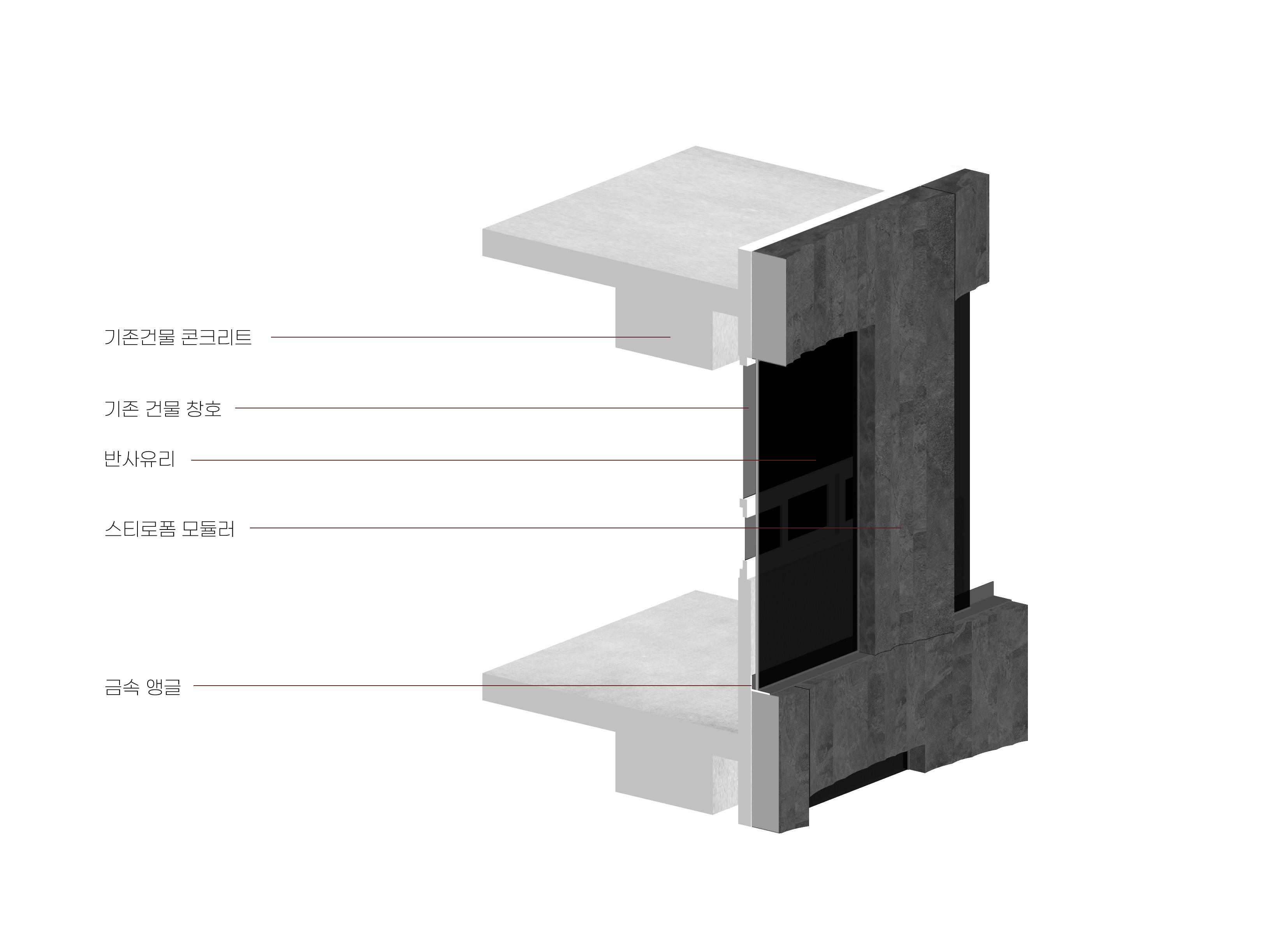 건물은 왕십리 대로변과 이면도로가 만나는 교차점에 위치하며, 이는 곧 과거 도시 조직과 신도시 흐름이 맞닿는 지점이기도 하다. 우리는 이 경계에 ‘골목길을 닮은 계단실’을 제안했다. 두 건물 사이에 외부 계단실을 두고, 이를 통해 도시와 건축 사이의 단절을 잇는 흐름의 장치로 삼았다.