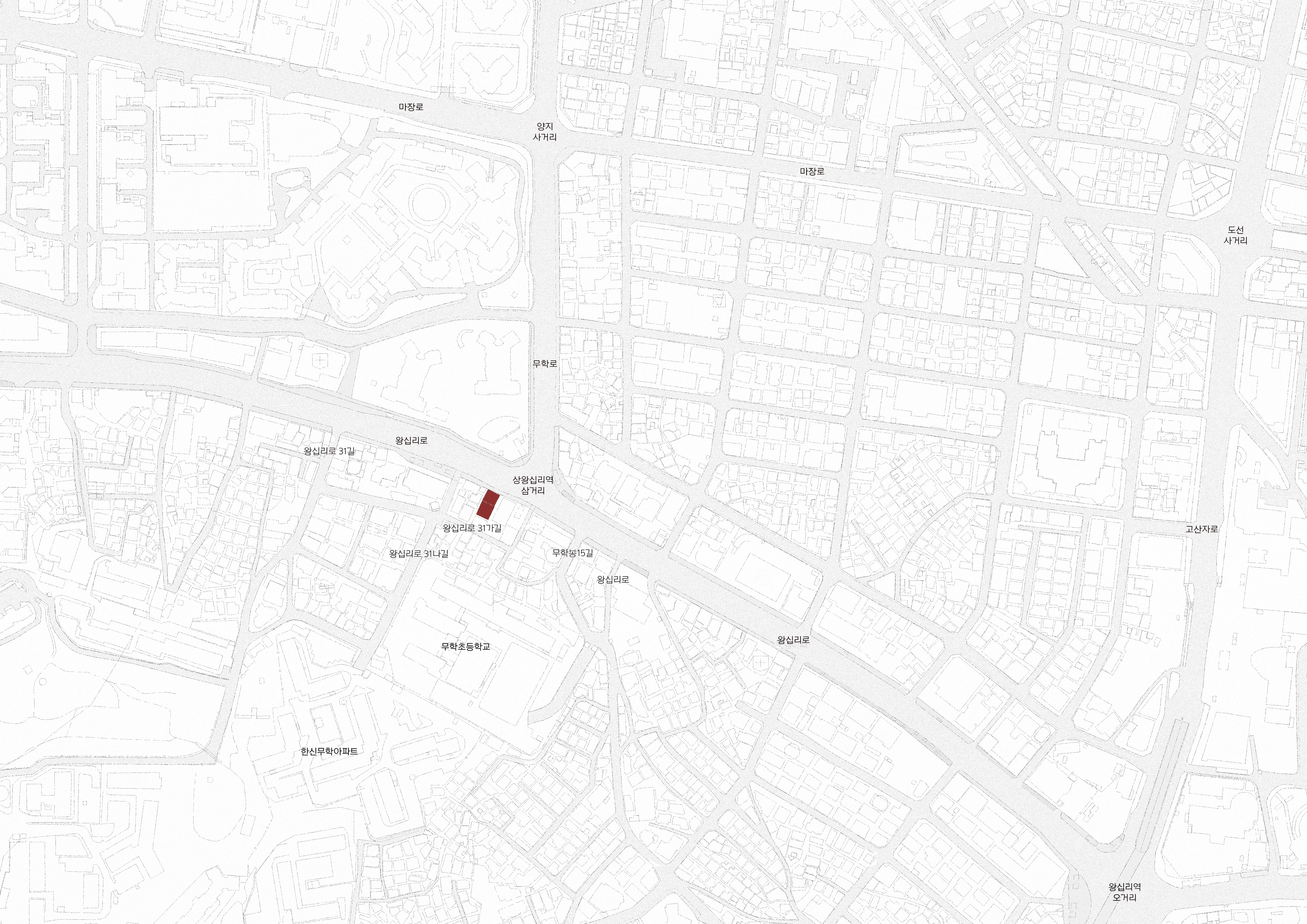 왕십리는 뉴타운 개발로 급격히 도시 구조가 재편된 지역이다. 대규모 아파트 단지들이 들어서며 과거의 흔적은 점차 흐려지고 있지만, 여전히 낡은 도시의 결이 남아 있는 장소이기도 하다. 이번 프로젝트는 한 필지 내에 위치한 두 개의 상반된 건축—1949년에 지어진 한옥(W2)과 1968년 증축된 5층 상가(W1)—이 공존하는 공간을 리노베이션하는 작업이었다.