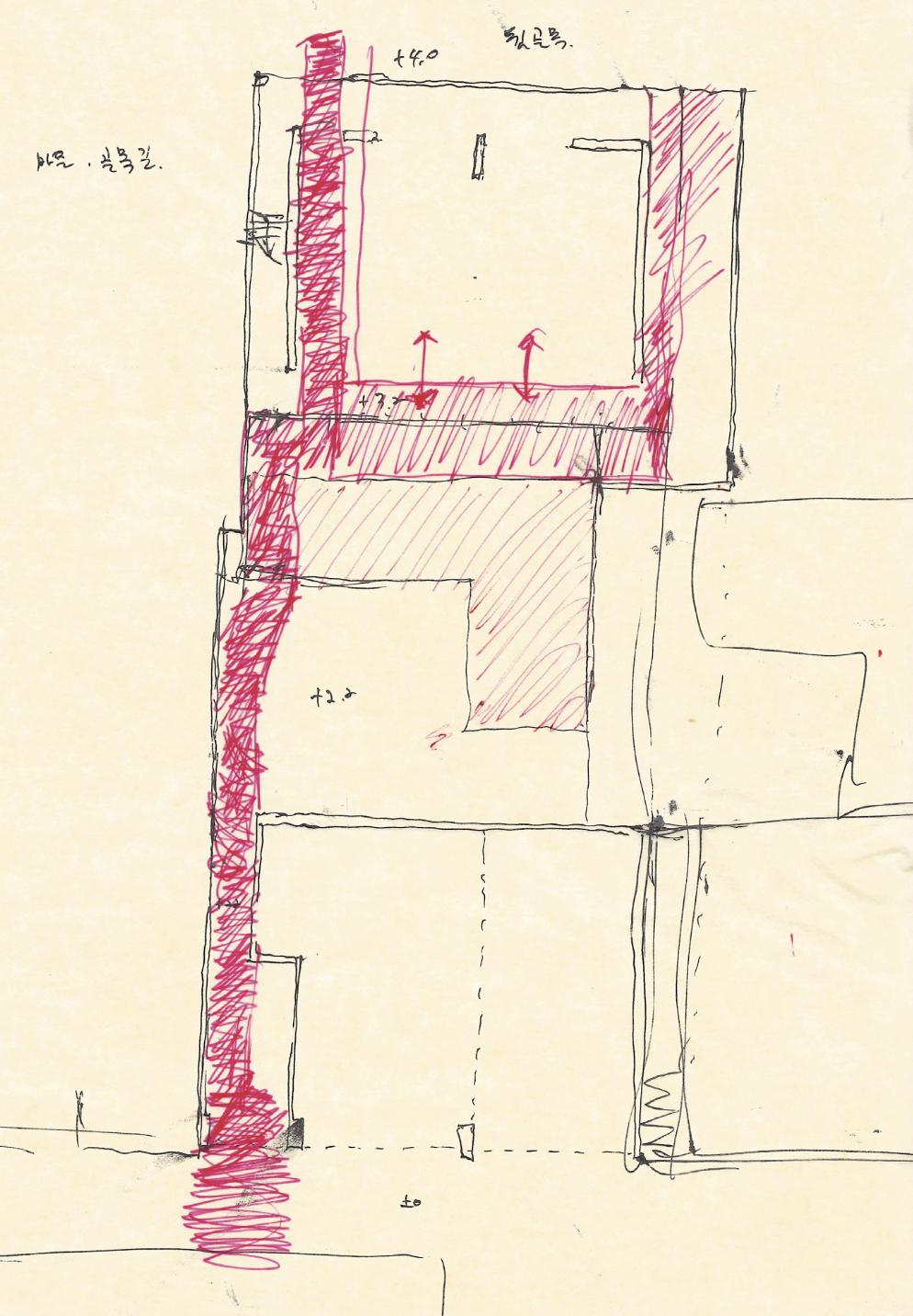 이 계단실은 물리적 연결을 넘어 도시의 경험을 확장하는 장소가 되었다. 좁은 틈 사이로 빛이 스며들고, 움직임이 흐르며, 도시의 리듬이 건축 안으로 스며드는 통로로 작동한다. 과거의 골목길처럼 유도된 동선은 사용자의 경험을 유연하게 만들며, 각기 다른 시대의 건물이 하나의 흐름 안에서 공존하도록 만든다.