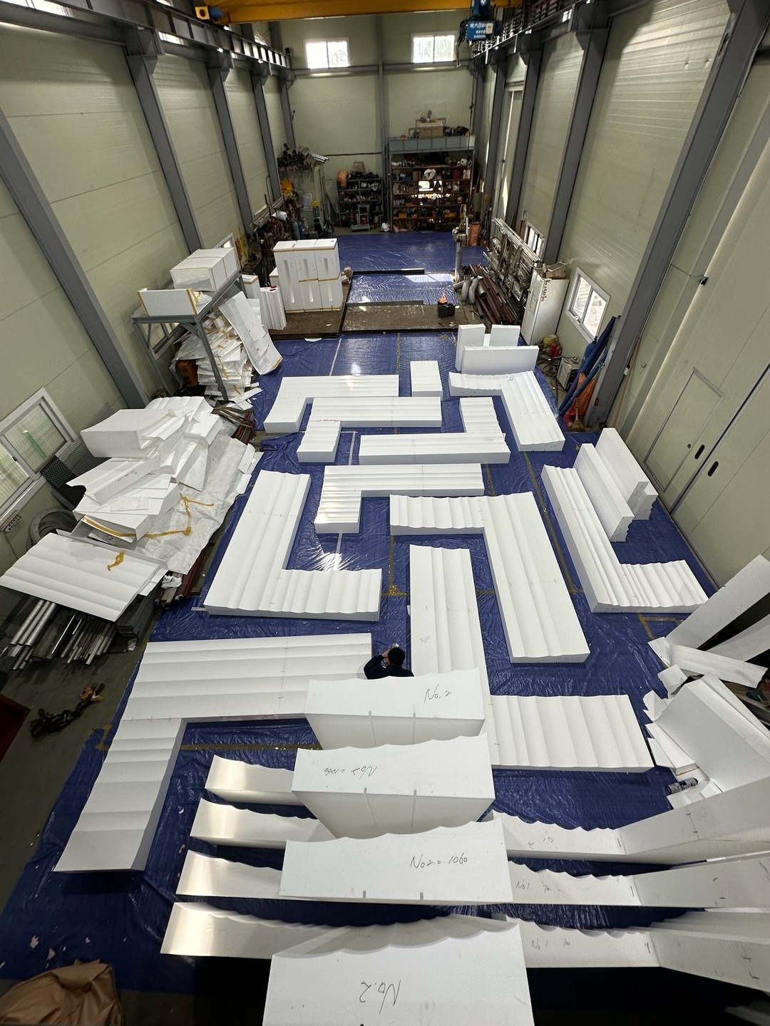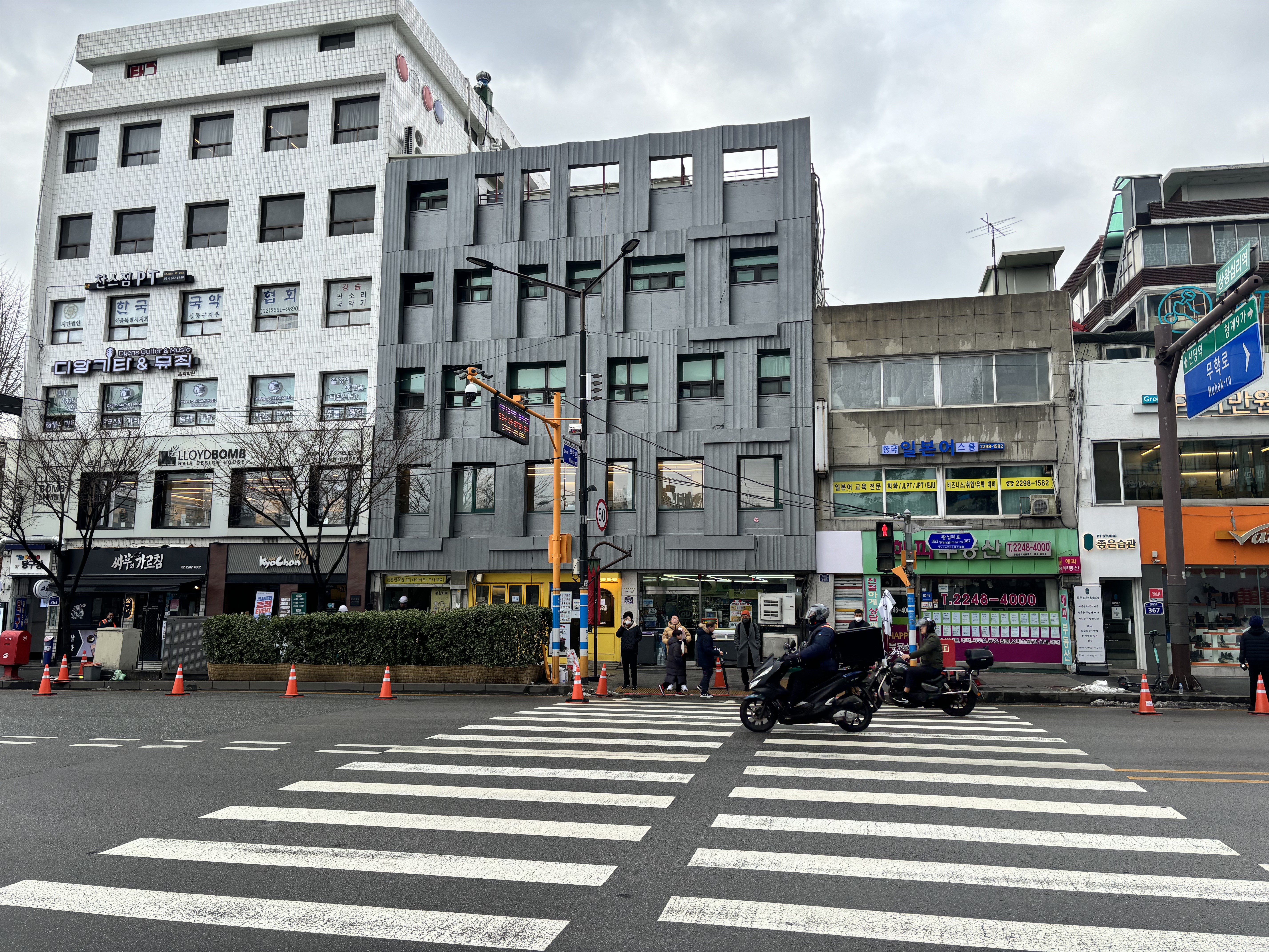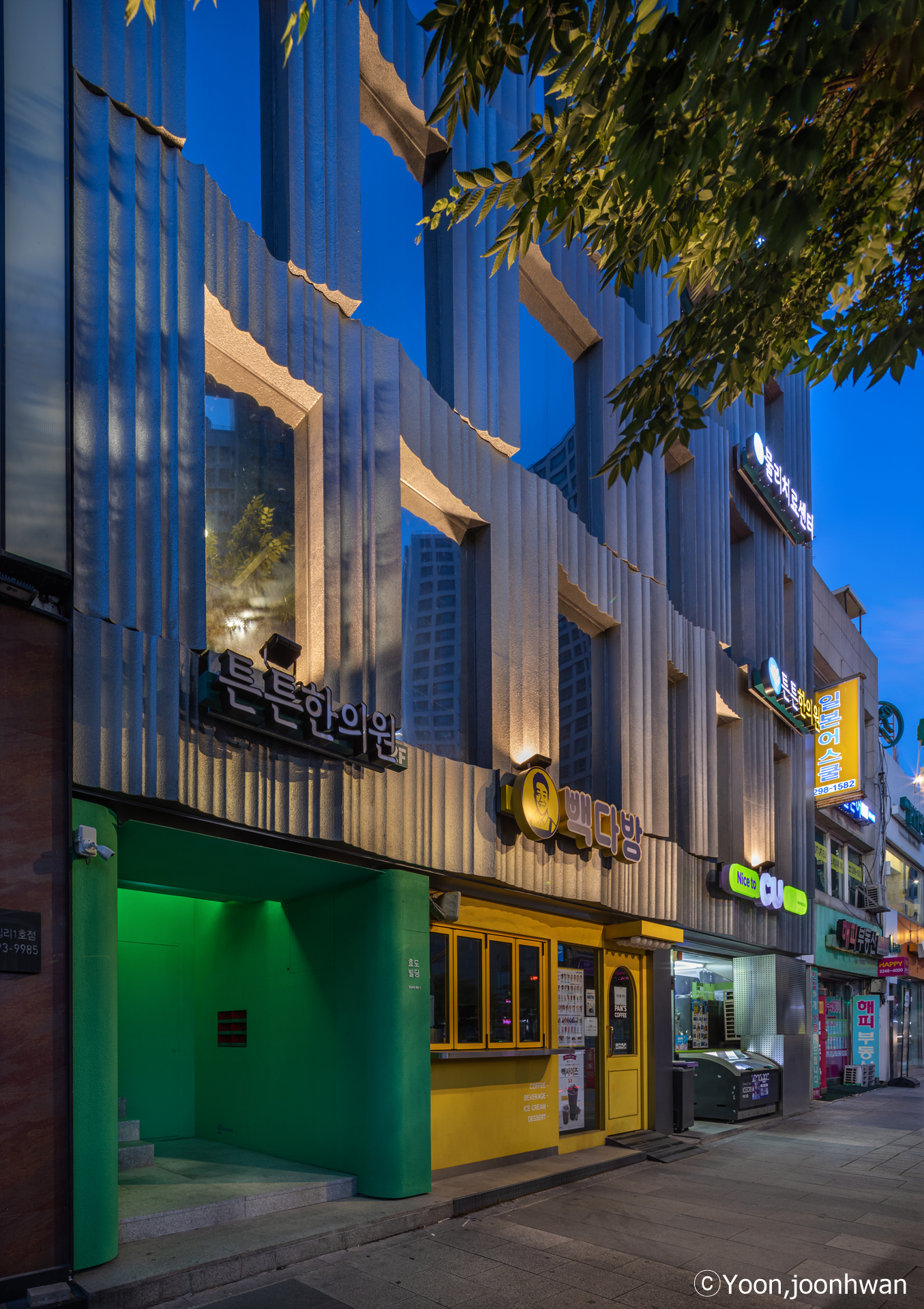 대로변 상가(W1)의 입면은 본 프로젝트의 가장 인상적인 장면 중 하나다. 우리는 사라진 한옥의 흔적을 되살리고자, 기와 지붕에서 모티프를 가져와 이를 추상적으로 해석한 입면 패널을 제작했다. 모듈화된 금속 패널은 공장에서 사전 제작하여 현장에서 조립하는 방식으로 설치되었으며, 이는 임차인 운영 중에도 공사가 가능하도록 한 전략적 선택이기도 했다.