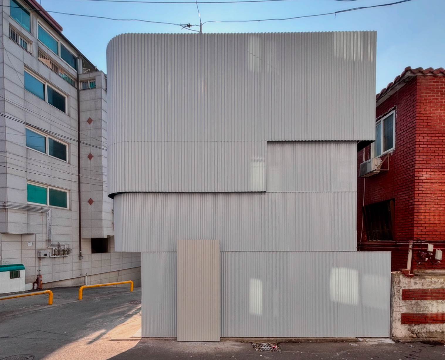 외장재는 저렴하면서도 내구성이 뛰어난 골강판을 사용했다. 기성 제작된 세 가지 규격의 골강판을 조합하여 획일적이기 쉬운 입면에 자연스러운 질감을 부여했다. 골의 규격을 다양하게 적용함으로써, 단조롭지 않으면서도 조화로운 외관을 완성했다. 이는 작은 변화만으로도 입면에 깊이감과 생동감을 부여하는 효과적인 방법이었다.