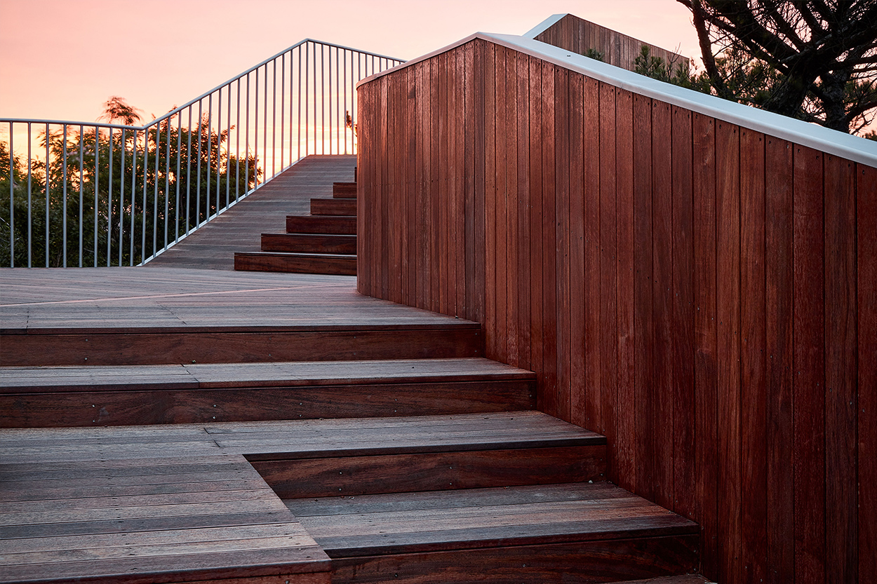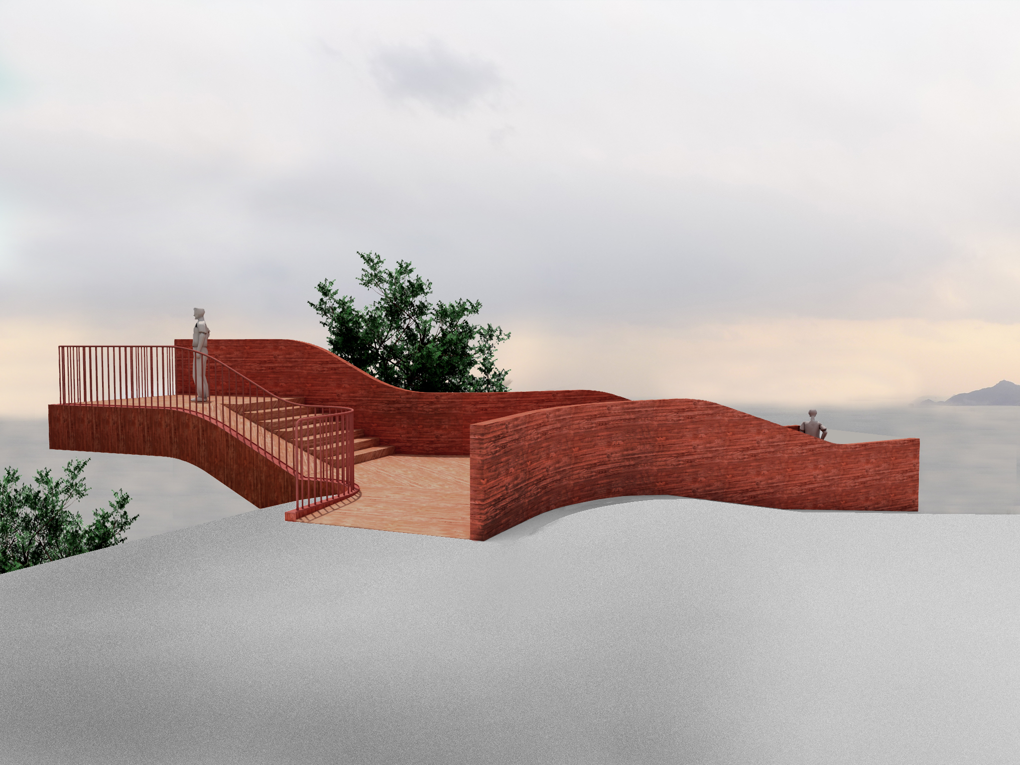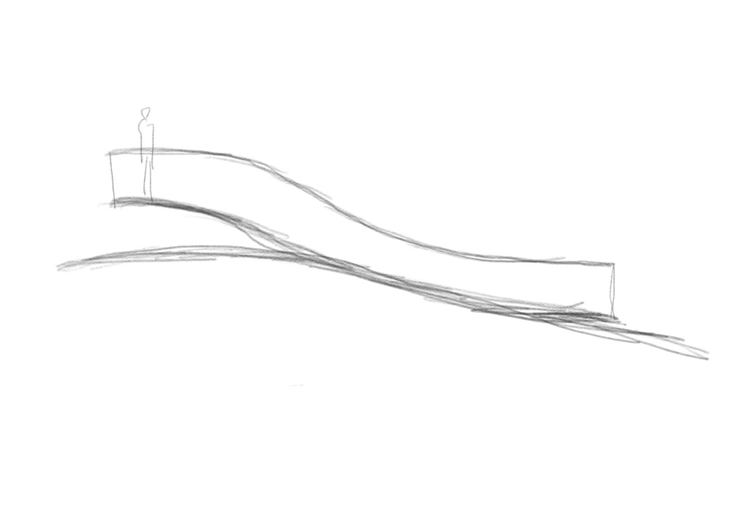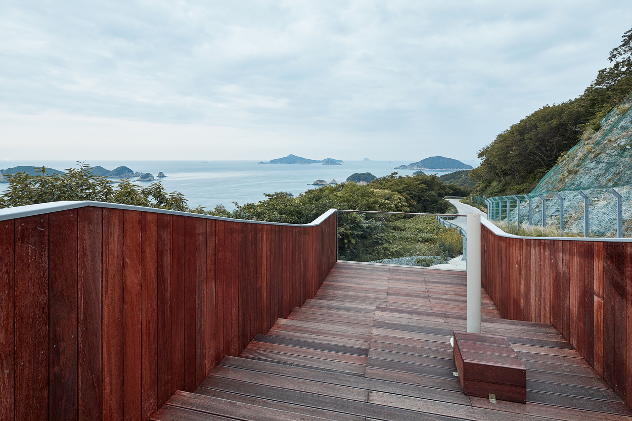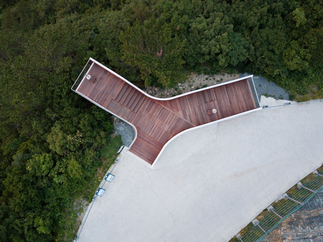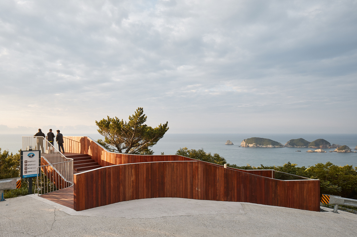 대상지는 남쪽 해안도로를 따라가는 세 곳의 전망 지점 중 한 곳이다. 절벽에 난 해안도로를 따라가다 보면 산이 굽이치고 바다가 교차되는 풍경이 보인다. 산과 바다가 대치하 듯 만나는 풍경이 이어질 때쯤 바다 고래처럼 거대한 섬들이 눈앞에 나타난다. 이 곳에 압도적 스케일의 섬과 무한한 깊이에 빠질 듯 한 바다가 한자리에 있다. 드넓은 수평선을 보며 지나온 방향의 아래에는 에메랄드빛의 몽돌해수욕장과 여기저기 돌무덤과 같은 섬이 펼쳐진다. 이 땅에 흐르는 듯 펼쳐지는 풍경을 즐길 수 있는 곳을 계획하기 시작했다. 땅의 형상은 도로 한 켠 삼각형의 선형으로 영역을 가지며 한 쪽이 경사진 곳이다. 우측에 섬을 보는 풍경과 좌측에 여차마을을 내려다보는 풍경이 가장 아름답다. 따라서 계획은 자연스레 지형을 따라 흐르는 듯 길게 늘어뜨린 데크를 놓고 우측은 지형을 따라 아래로 내려 스탠드형식을 갖추어 섬을 조망하도록 하고, 좌측은 들어올려 바다쪽으로 길게 내민 데크가 바다로 한걸음 다가가서 여차마을을 내려다보도록 했다. 경사진 지형을 활용해 데크 레벨을 다양하게 취하며 자연을 대하는 방식을 달리 가지도록 했다.
