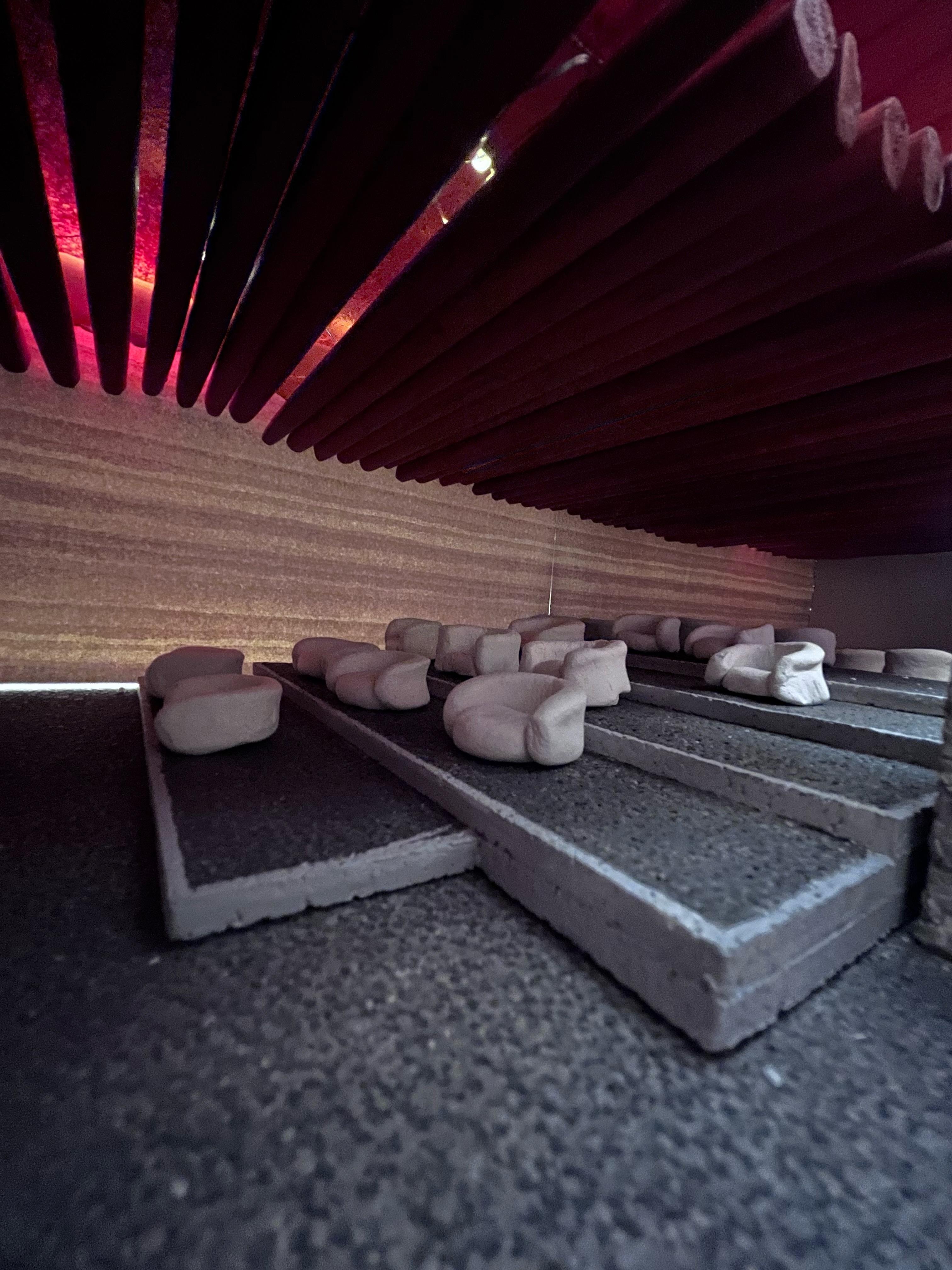돌덩어리의 무게감, 금속의 일렁임, 흙벽의 다공성, 천장 루버를 새어나오는 빛, 알라바스타의 황홀한 조명이 공간을 압도하게 된다. 각 재료는 고유의 물성과 구법으로 빚어져 우주와 같은 초월적인 분위기를 조우한다. 크리스토퍼놀란 감독의 영화를 예로 들면, 인셉션에서는 꿈속과 현실의 시간 차이를 다루고 인터스텔라에서는 우주와 지구의 시간 차이를 통해 개인의 주관적 시간의 흐름과 물리적 시간의 흐름이 다르다는 것을 보여준다. 그러면서도 거대한 스케일을 통해서 심리적인 압박감과 긴장감을 유지하게 하는 장면들을 담아 전달한다. 라운지의 공간은 재료의 물성과 스케일을 다루어 압도적인 분위기를 만들어내고 그 안의 사람들에게는 점유하는 영역을 넓혀주고 감지하지 못할 정도의 시간이 흐른다. 돈을 좇는 일은 성급하고 속도감이 빠르게 표현되기 마련이지만 반면 여유롭고 편안함을 가지며 시간을 다르게 쓰고자 의도하여 라운지를 조성했다.