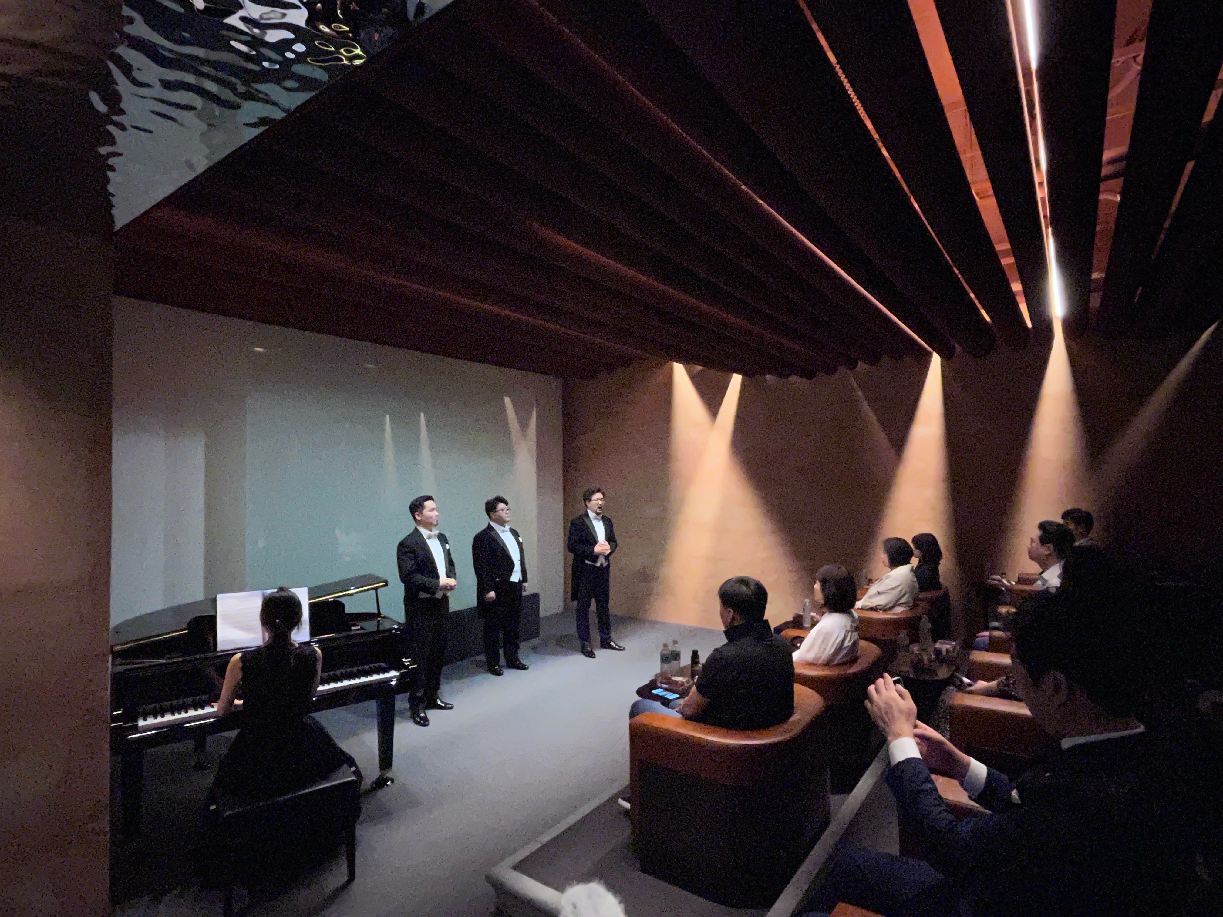 The weight of the stone, the shimmer of the metal, the porosity of the earthen walls, the light streaming through the ceiling louvers, and the brilliance of the Alabasta lighting overwhelm the space. Each material is shaped with its own unique physicality and technique to create an atmosphere that is transcendent and cosmic in scope. For example, Director Christopher Nolan's Inception explores the time difference between dreams and reality, and another film Interstellar shows the difference between the subjective and physical passage of time by using the time difference between space and Earth. At the same time, he conveys scenes that keep the audience on the edge of their seats in suspense through the massive scale. The lounge space creates an overwhelming atmosphere by presenting the materiality and scale of materials and expands the territory of people in it while time passes imperceptibly. Although the pursuit of money is often associated with urgency and haste, the lounge was established to foster a culture of slowing down, relaxation, and alternative time usage. The entire area is split into two parts. The circular table, located upon entering the room, secures a unique atmosphere, and a weighty stone is also there. The stacked earthen walls and the filtered light through the ceiling's curved louvers in the lecture hall establish a captivating and jubilant display of color. As a result, the lecture hall becomes an expression of HongT's brand identity and narrative. We believe that this space illustrates a synesthetic perspective as an homage to a transcendent space, bridging the East and West.