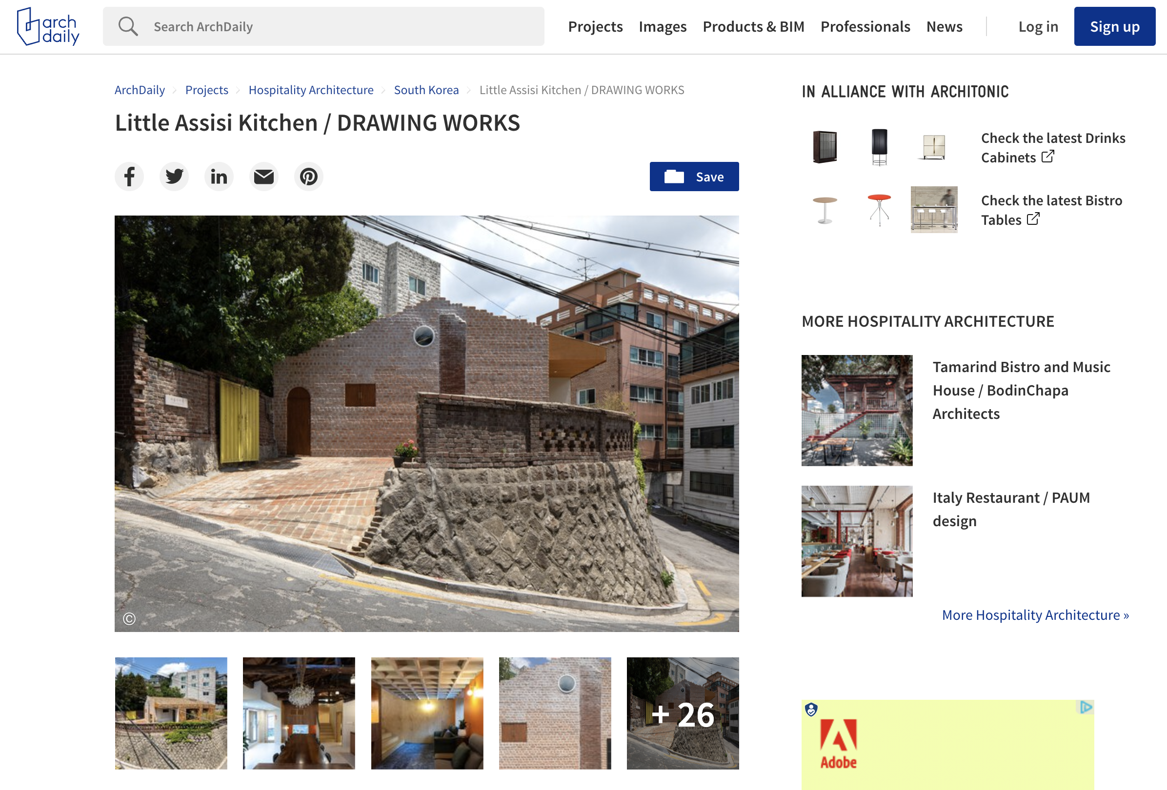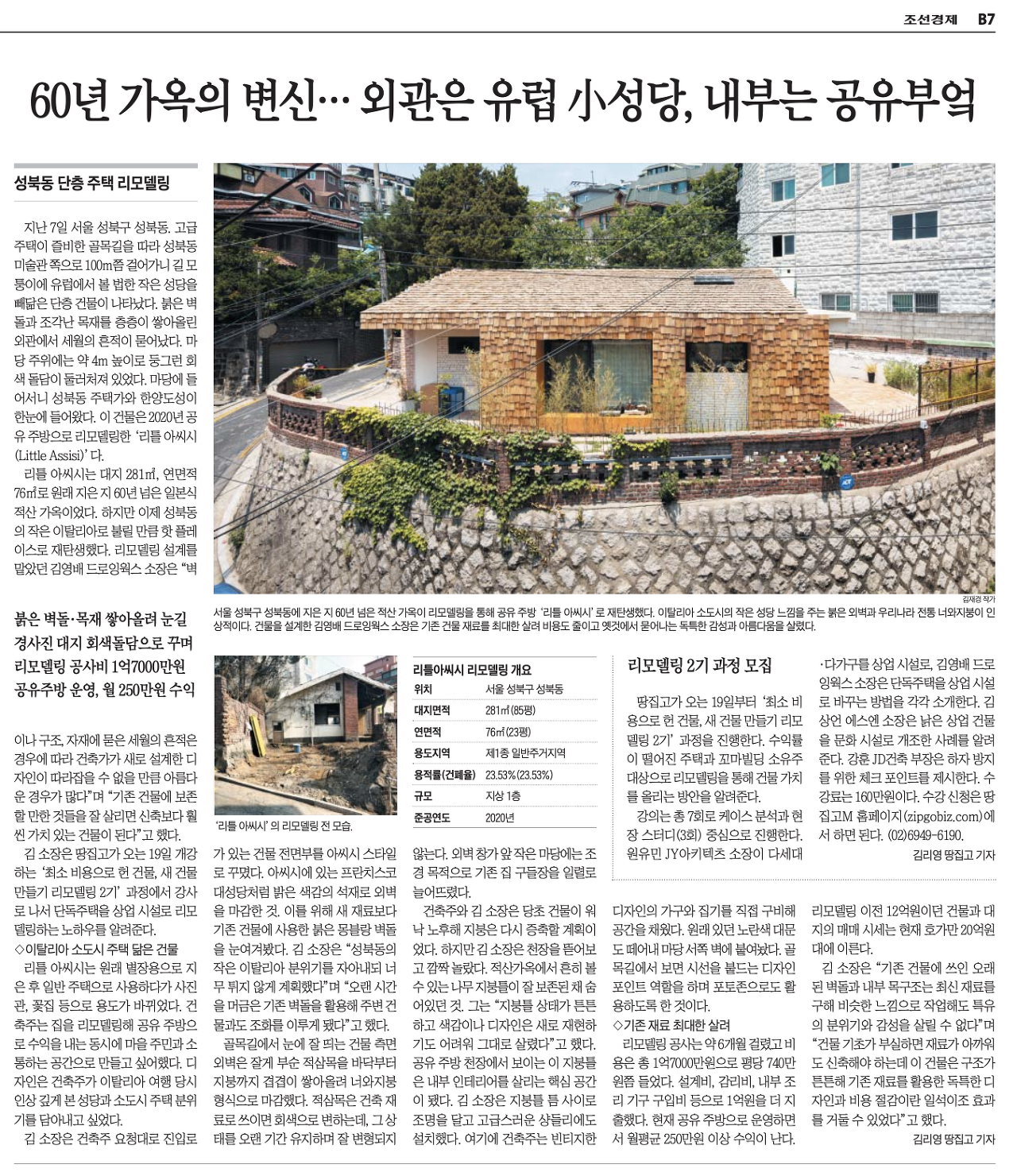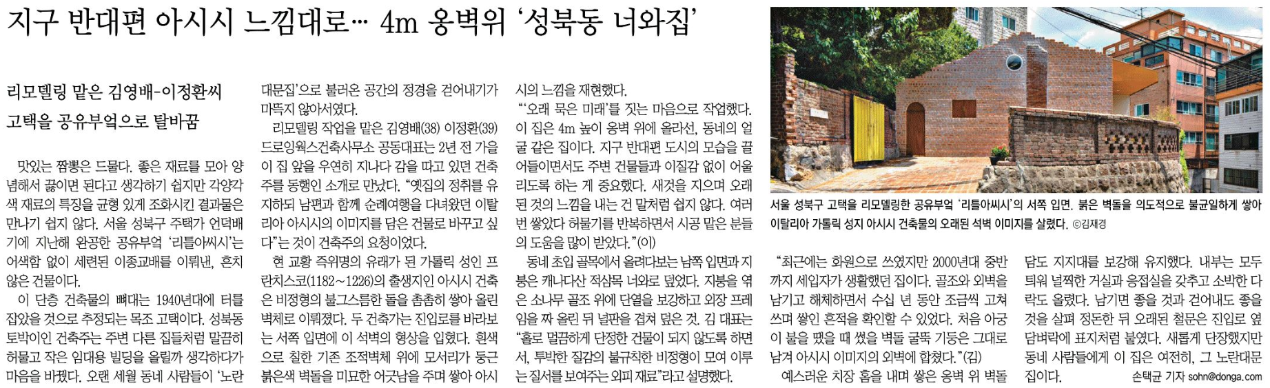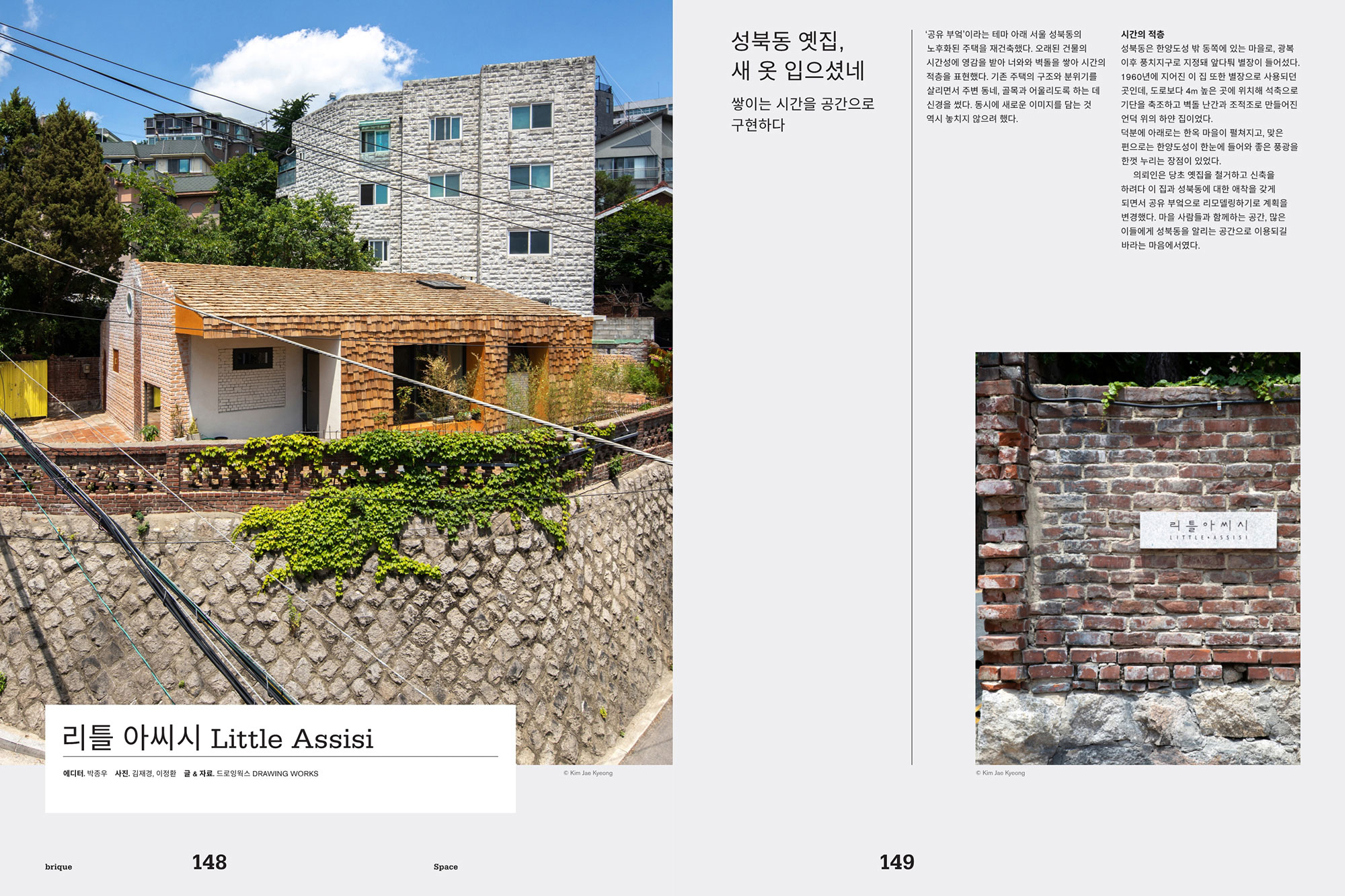 공유부엌이라는 테마 아래 성북동의 노후화된 주택 공간을 재건축했다. 오래된 건물의 시간성에 영감을 받아 너와와 벽돌 등을 쌓아 시간의 적층을 표현했다. 기존 주택의 구조와 분위기를 그대로 살리면서 주변 동네와 골목에 어울리게끔 하였다. 동시에 새로운 이미지를 심는 것 역시 놓치지 않았다.