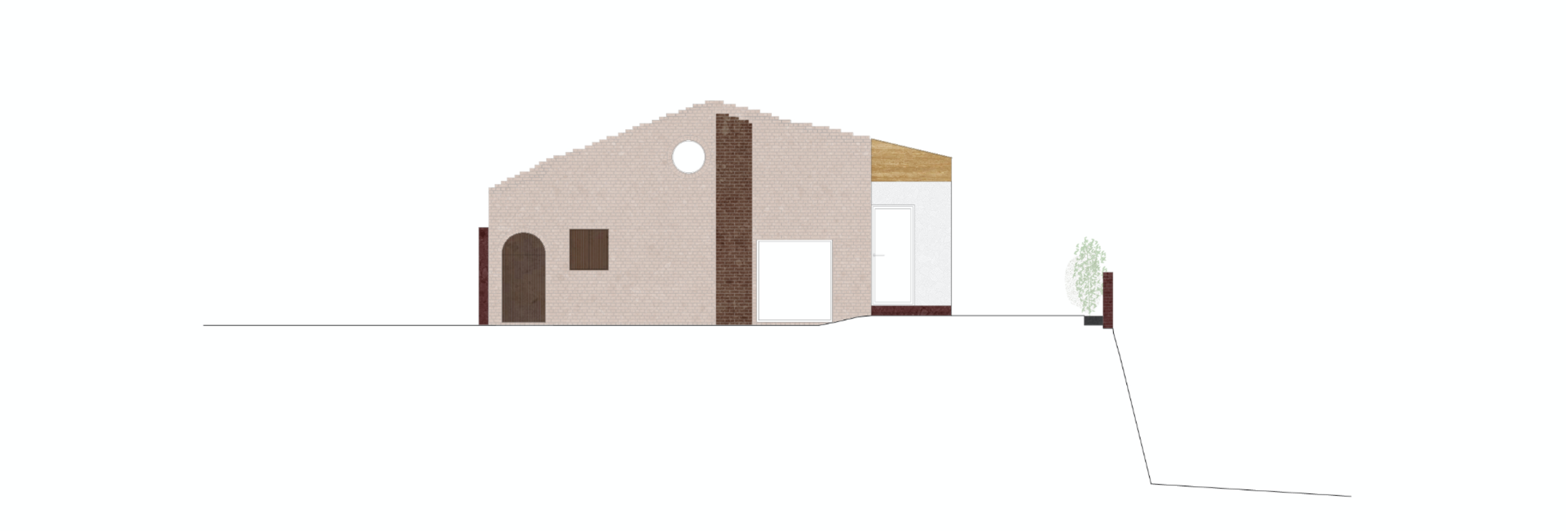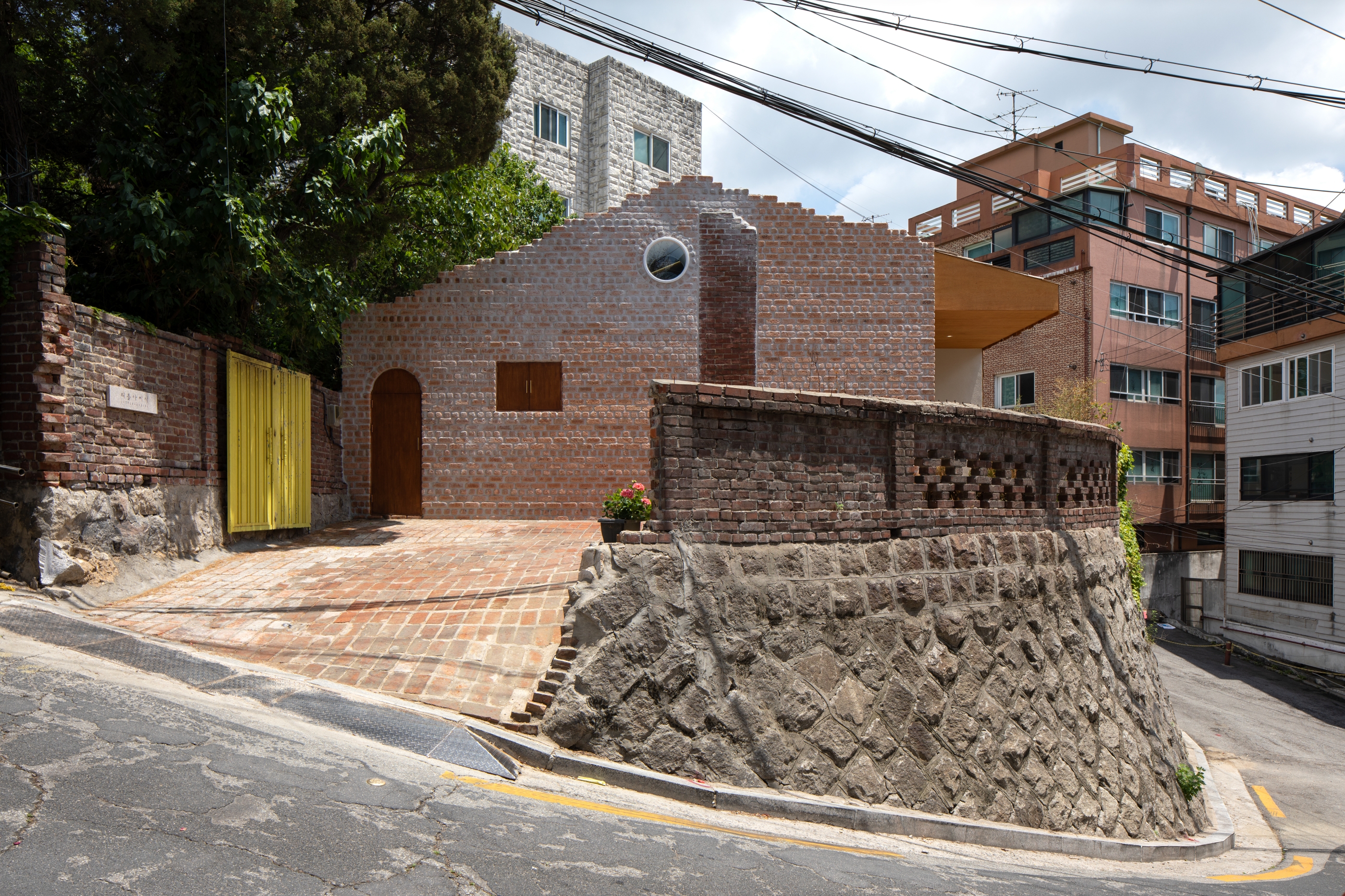 첫번째는 골목길에서 보이는 측면은 벽돌(몽블랑)을 적용해 오랜 시간의 깊이를 가진 물성과 분위기를 담아내며, 한편으로는 아씨시의 분위기를 느끼고 싶어했기에 주택이 골목길에 접한 입면과 마당은 벽돌을 쌓아서 만들었다. 주변 집들도 벽돌과 타일로 마감되어 있어 골목길의 분위기와 어울리며, 마치 오래된 미래를 만들어 관조적인 태도로 공존하는듯한 모습이다.