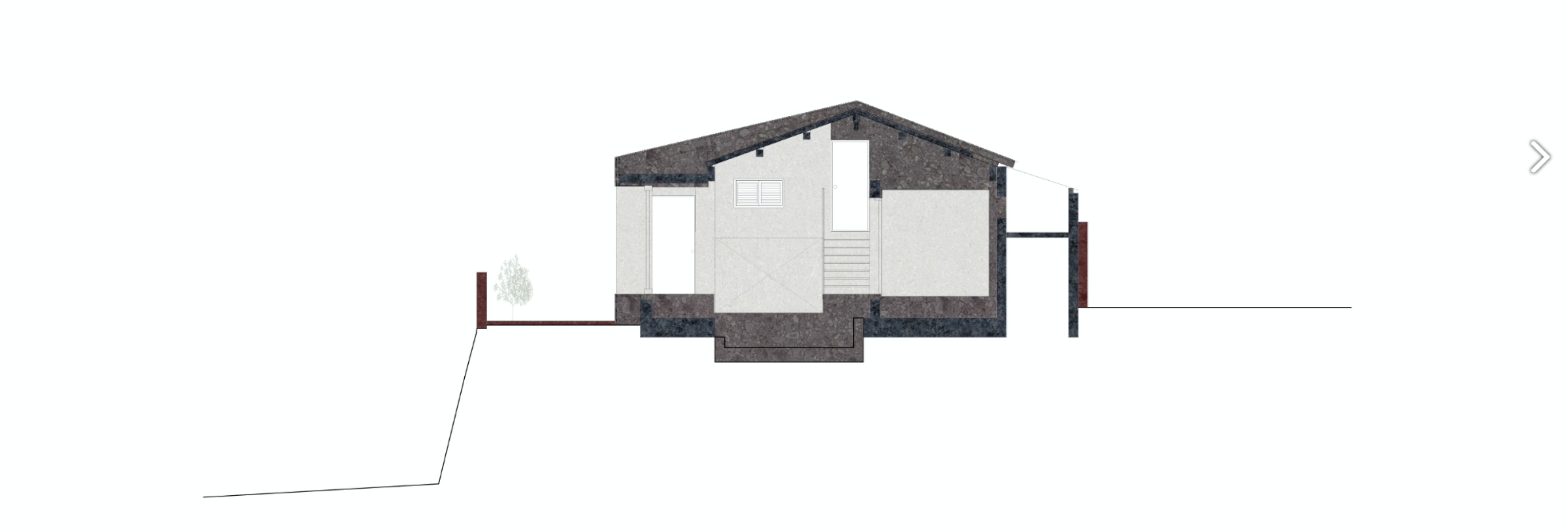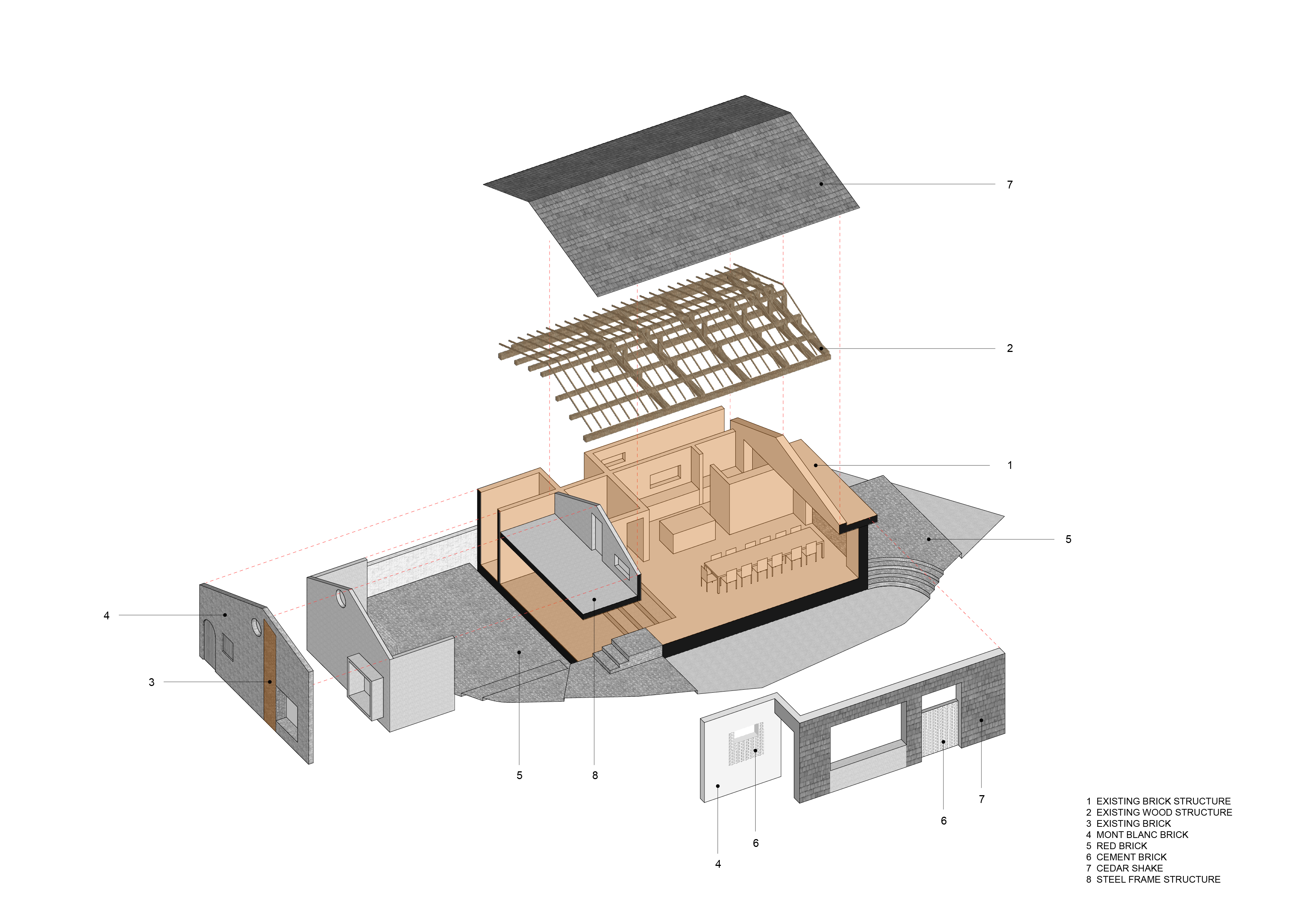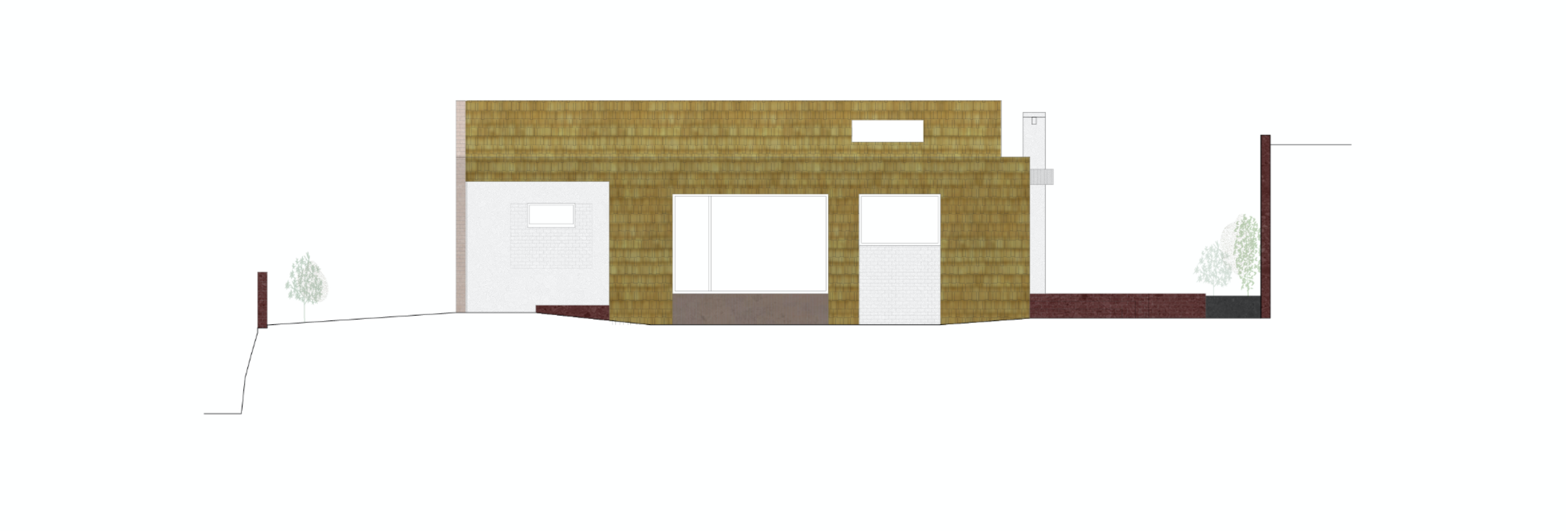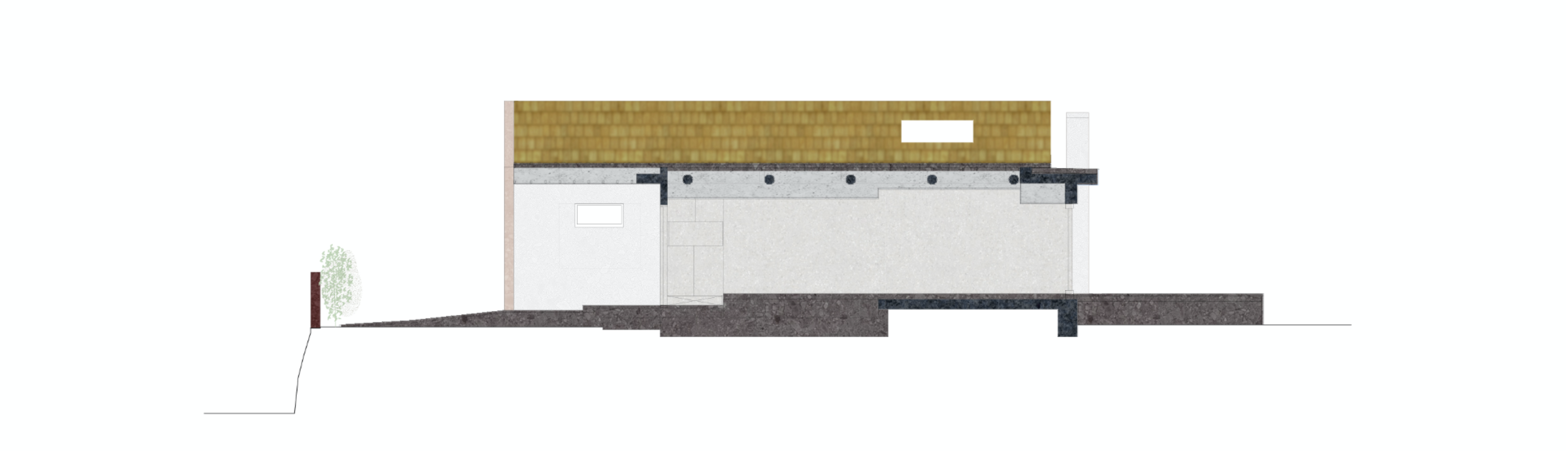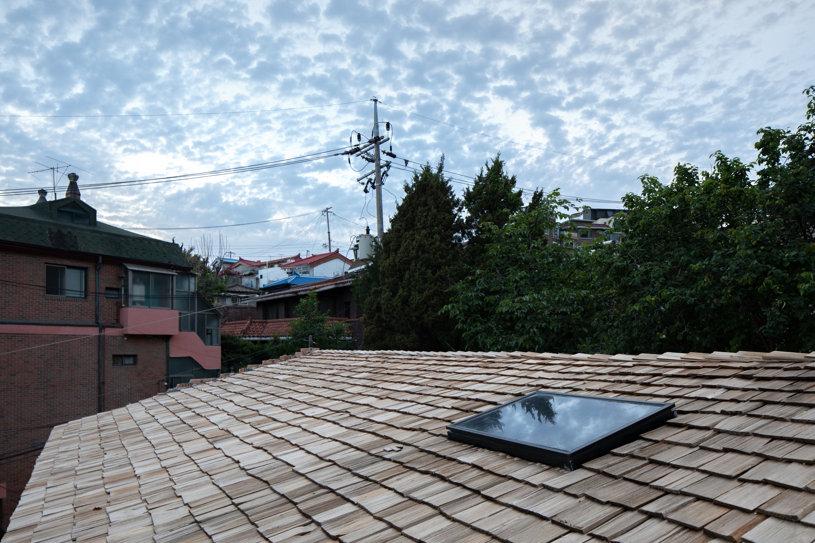 두번째는 골목길을 들어서는 원경에서 보이는 정면을 새로운 재료인 시다쉐이크(적삼목)로 계획했다. 언덕에 위치했기에 석축으로 만들어진 기단과 그위에 벽돌 난간은 이 집을 향하는 길에 멀리서도 눈에 띄는 모습이다. 파편이 조합되어 자연스럽게 재료의 시간을 축적하듯 새로운 입면의 재료 또한 그러한 방식이어야 했다. 따라서 기존의 재료의 구법에서 착안하여 정면과 지붕을 시다쉐이크로 시공했다.