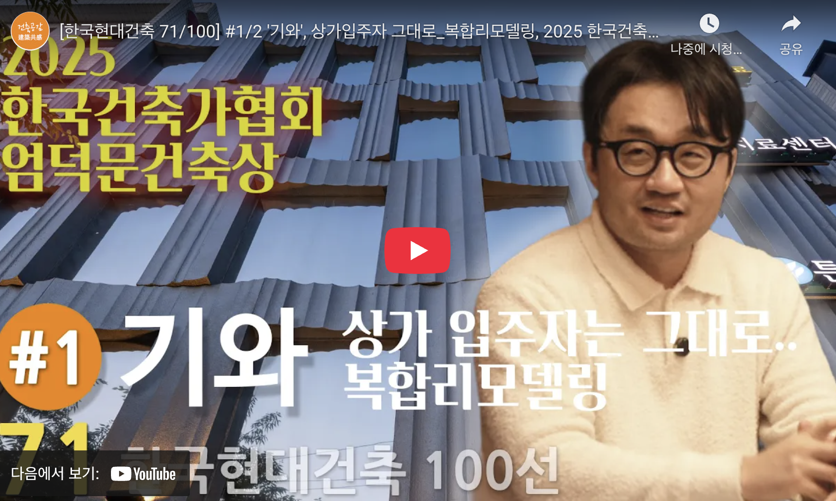2026. 1. 28 유튜브 채널 '건축공감' 인터뷰영상 [한국현대건축 100선] 본 영상은 지난해, '2025년 한국건축가협회 특별상' 부문, [엄덕문건축상]을 수상한 작품입니다. 한 필지 내에 존재하는 오래되어 폐기된 한옥(과거 무당집)과 상가건물의 리모델링 의뢰를 받았고, 각기 건립된 시기도 다르고, 존재형식도 다른 두 건물을 '기와'란 테마를 가지고 일관성있는 디자인을 진행했습니다. 과거-현재-미래를 살피고 도시의 맥락을 고려하면서, 기존 한옥에 대한 특별한 공간구성을 통해 멋진 작품을 구현했다고 생각합니다. 유튜브 채널 '건축공감' 은 건축문화컨텐츠 공유채널입니다. ENTERNAL LINK 1 ENTERNAL LINK 2 |