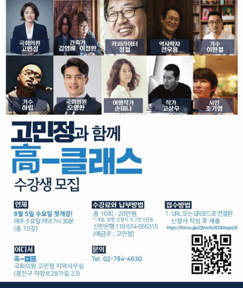 국회의원 고민정과 함께하는 '高 클래스’ 에 연사로 강연을 합니다. '高 클래스’는 우리 사회의 변화를 이끄는 10명의 연사와 함께 정치, 문화, 사회, 예술, 역사 등 다양한 분야의 인사이트를 공유하고자 합니다.