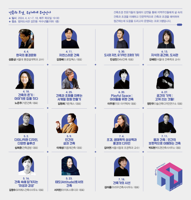 수성문화재단 범어도서관은 2024년 상반기 건축조경인문학 '건축과 조경, 우리에게 무엇인가' 강연을 4월 4일부터 7월 18일까지 매주 목요일 오후 7시에 진행한다.
