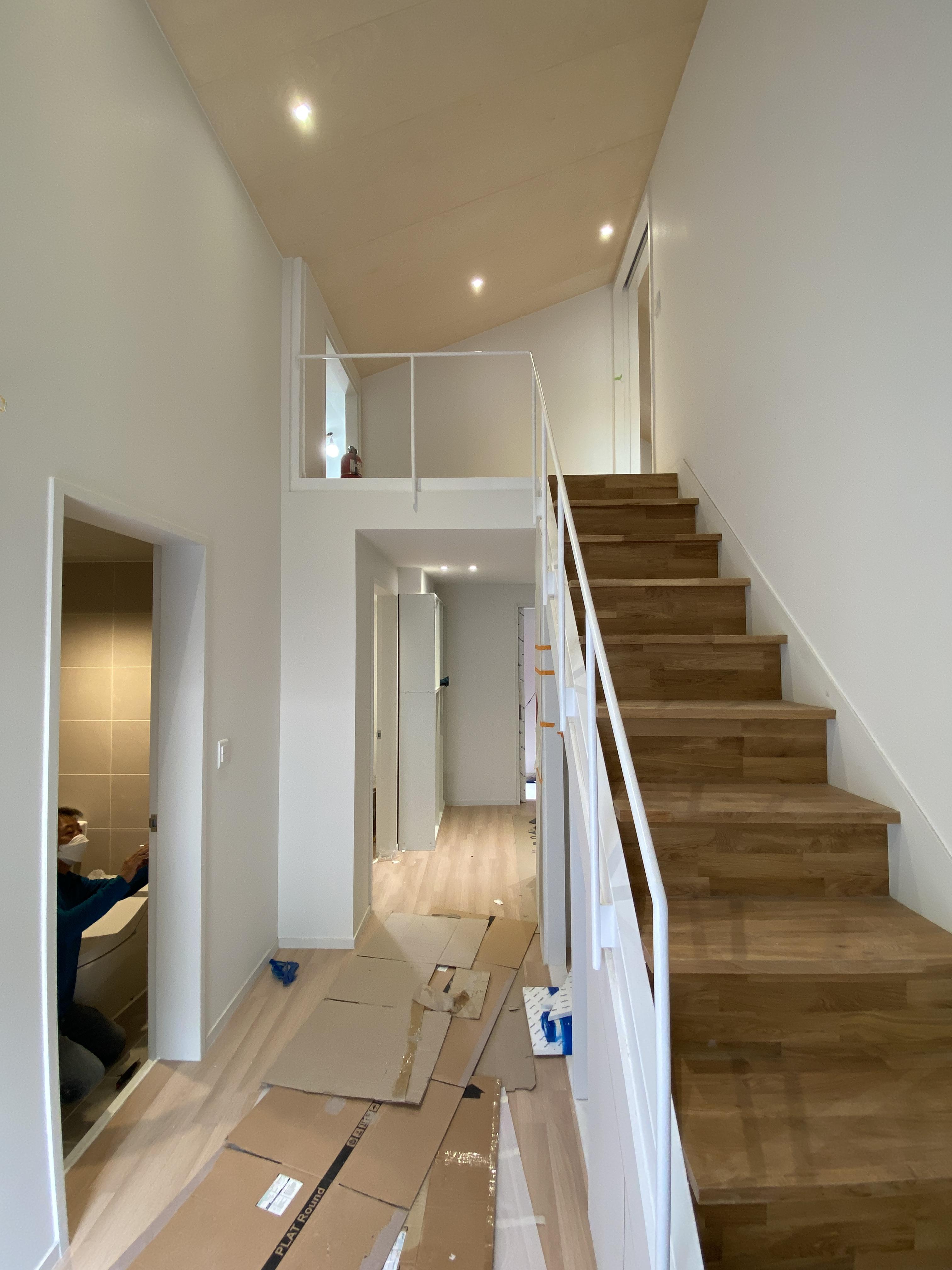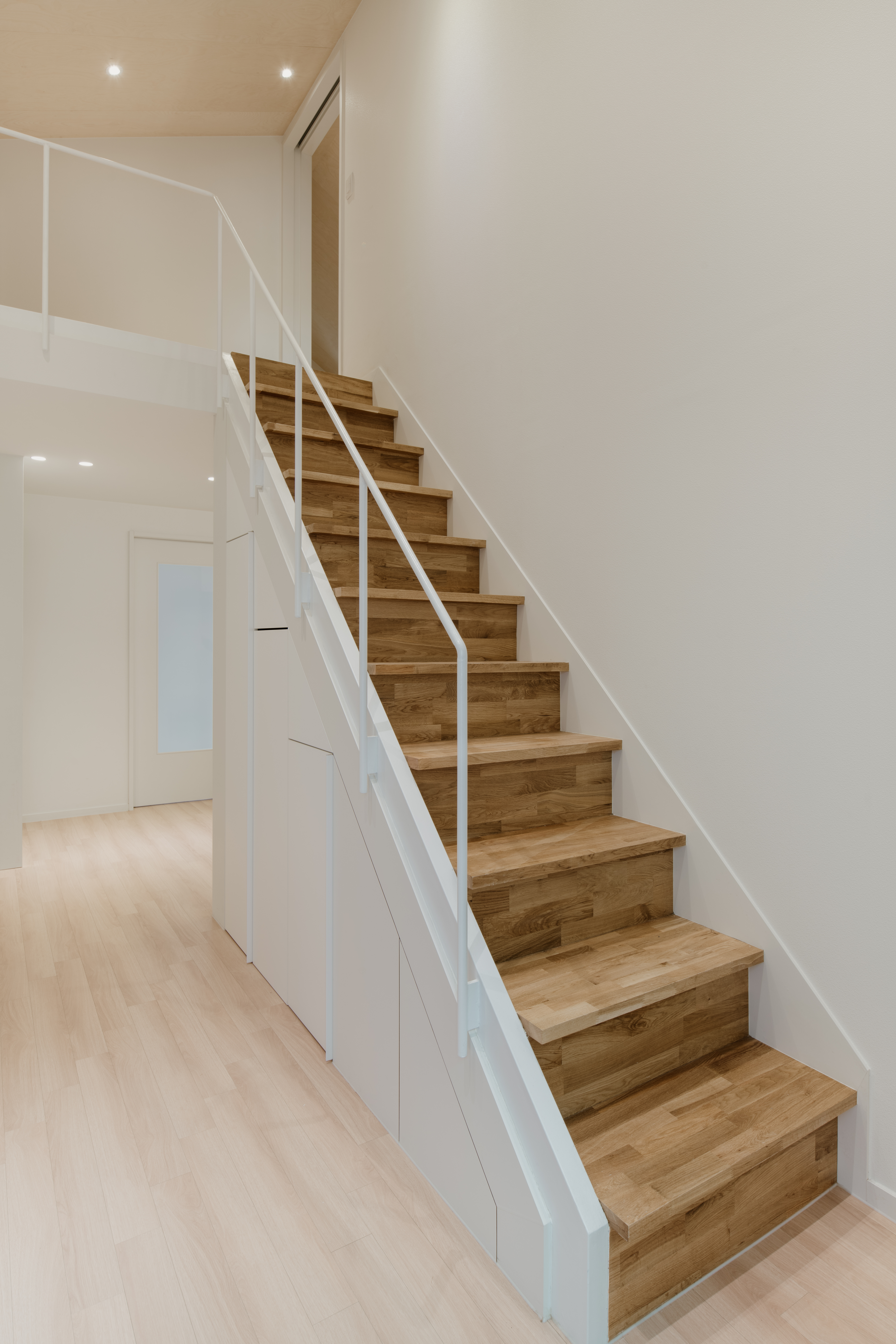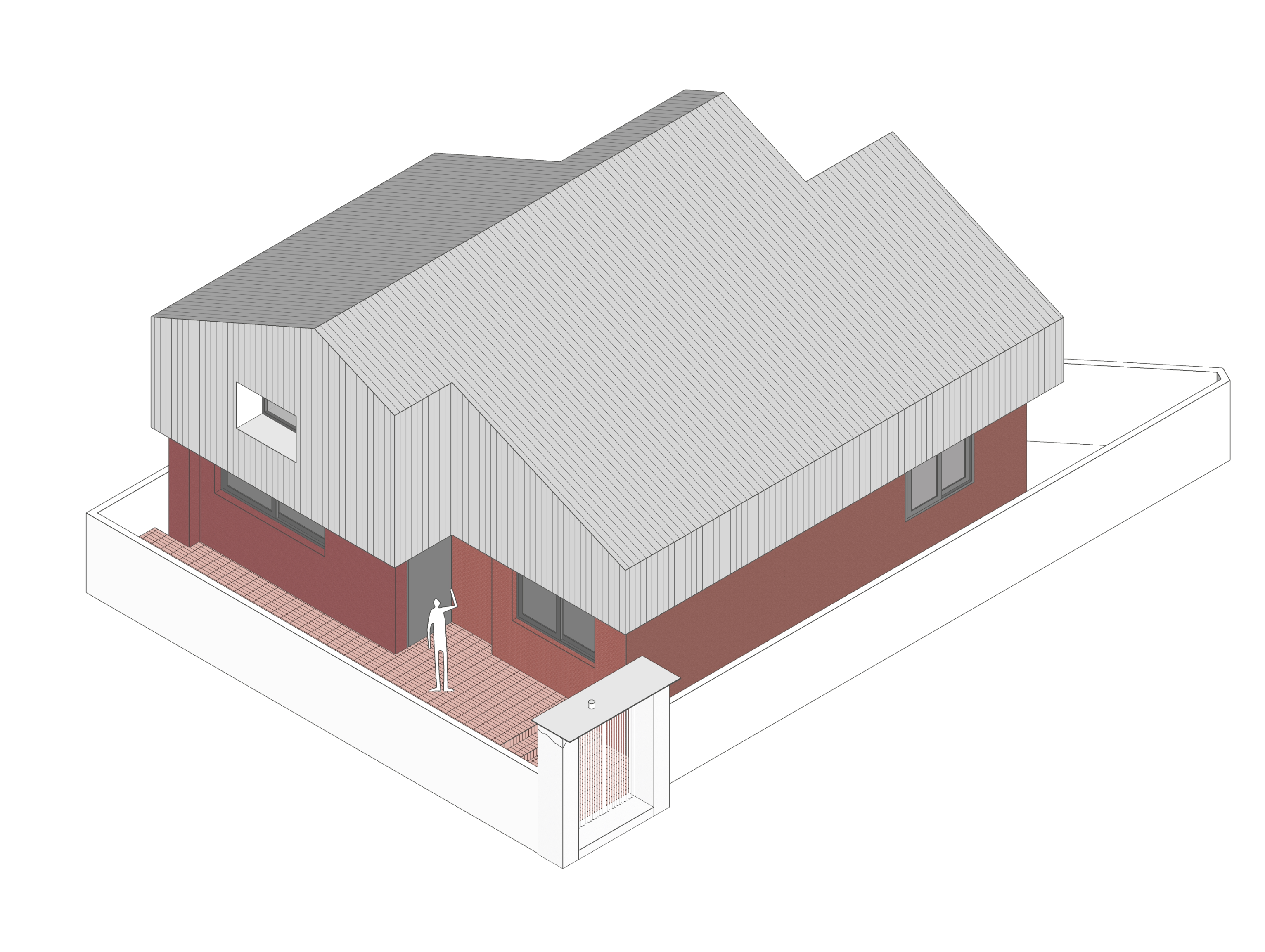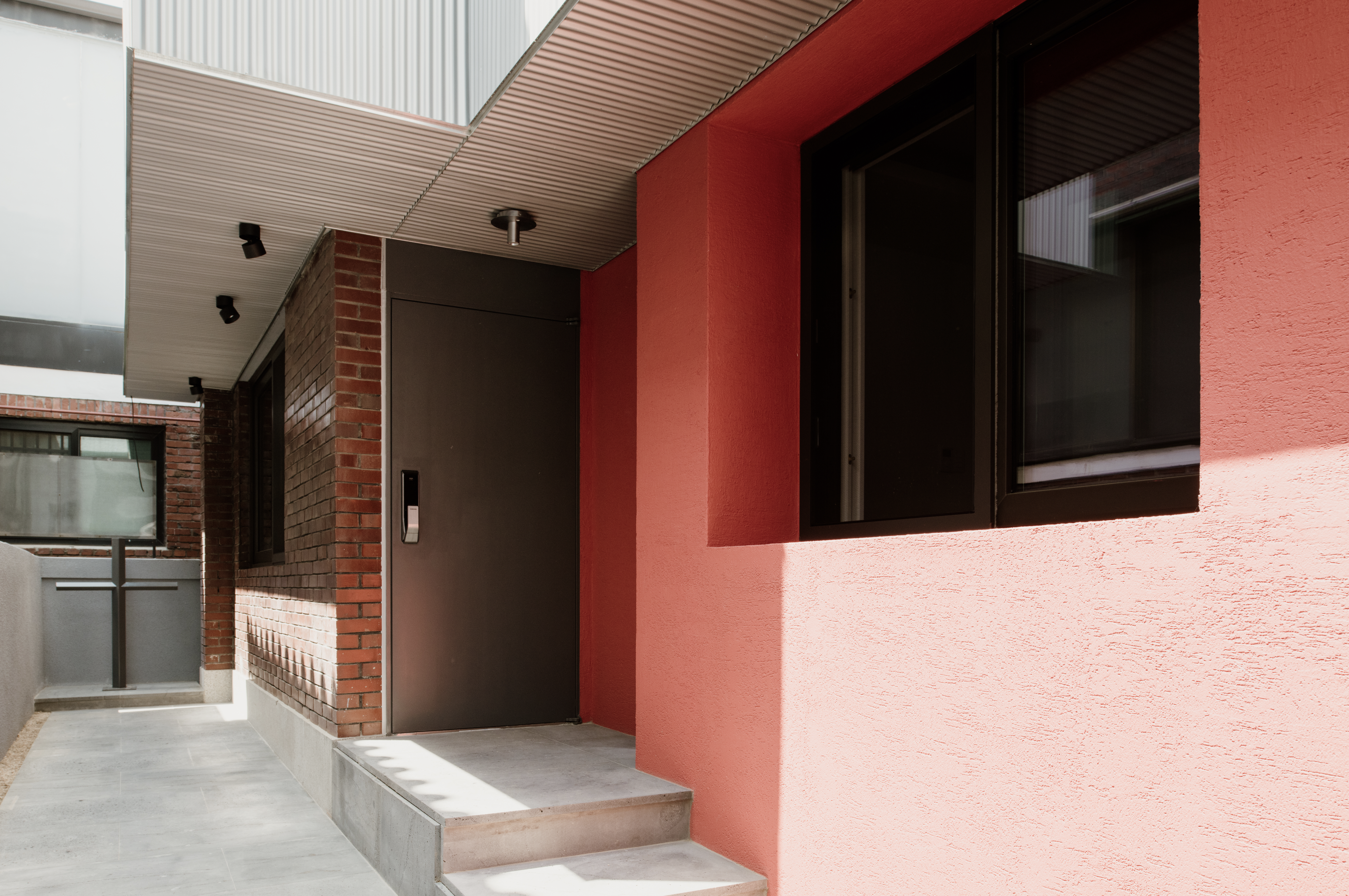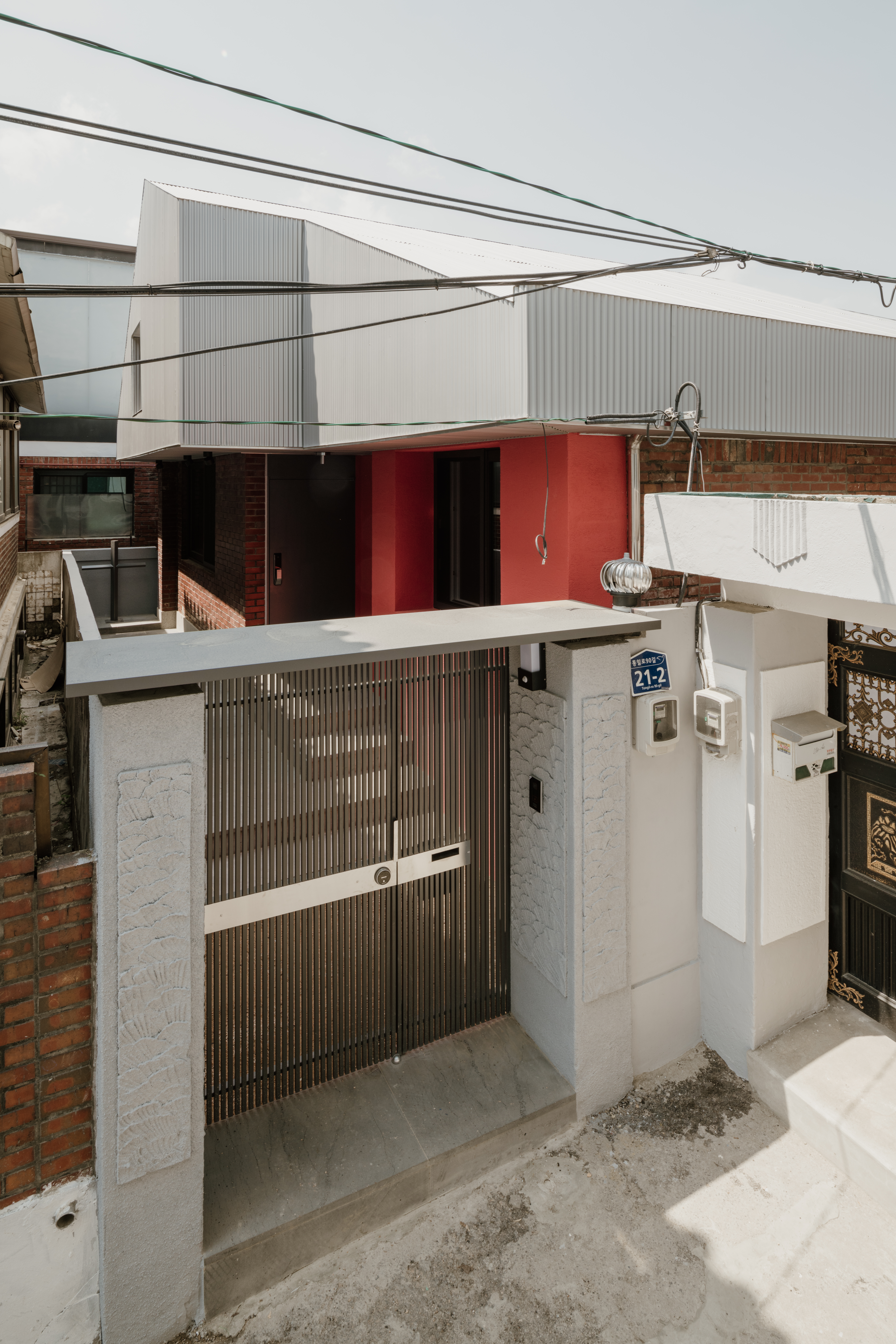 건축주는 중년의 대학교수로 아파트 생활을 해오다 자녀들과 함께 주택에 살아보기로 결심하고 이 집을 매입해 리모델링하게 되었다. 구옥은 애초에 1층 면적이 약 15평에, 다락이 9평 정도밖에 되지 않는 작은 집이었다. 증축할 정도의 예산은 아니었기에 다락방은 건축주가 사용하고 1층에 자녀들 방을 하나씩 두기로 하고 리모델링이 진행됐다. 외관은 옛집의 벽돌을 일부분 그대로 가져가되, 강 렬한 레드 컬러와 금속 지붕을 얹어 모던한 느낌을 더했다. 거실은 주방과 연결되게 배치하였고 아 일랜드 싱크대 뒤쪽으로는 다용도실을 배치해 생활의 편의성도 높였다. 이렇게 50여 년의 세월의 더께가 쌓인 구옥이 식구들만을 위한 소박하고 편안한, 작지만 완성도 있는 공간으로 재탄생했다.