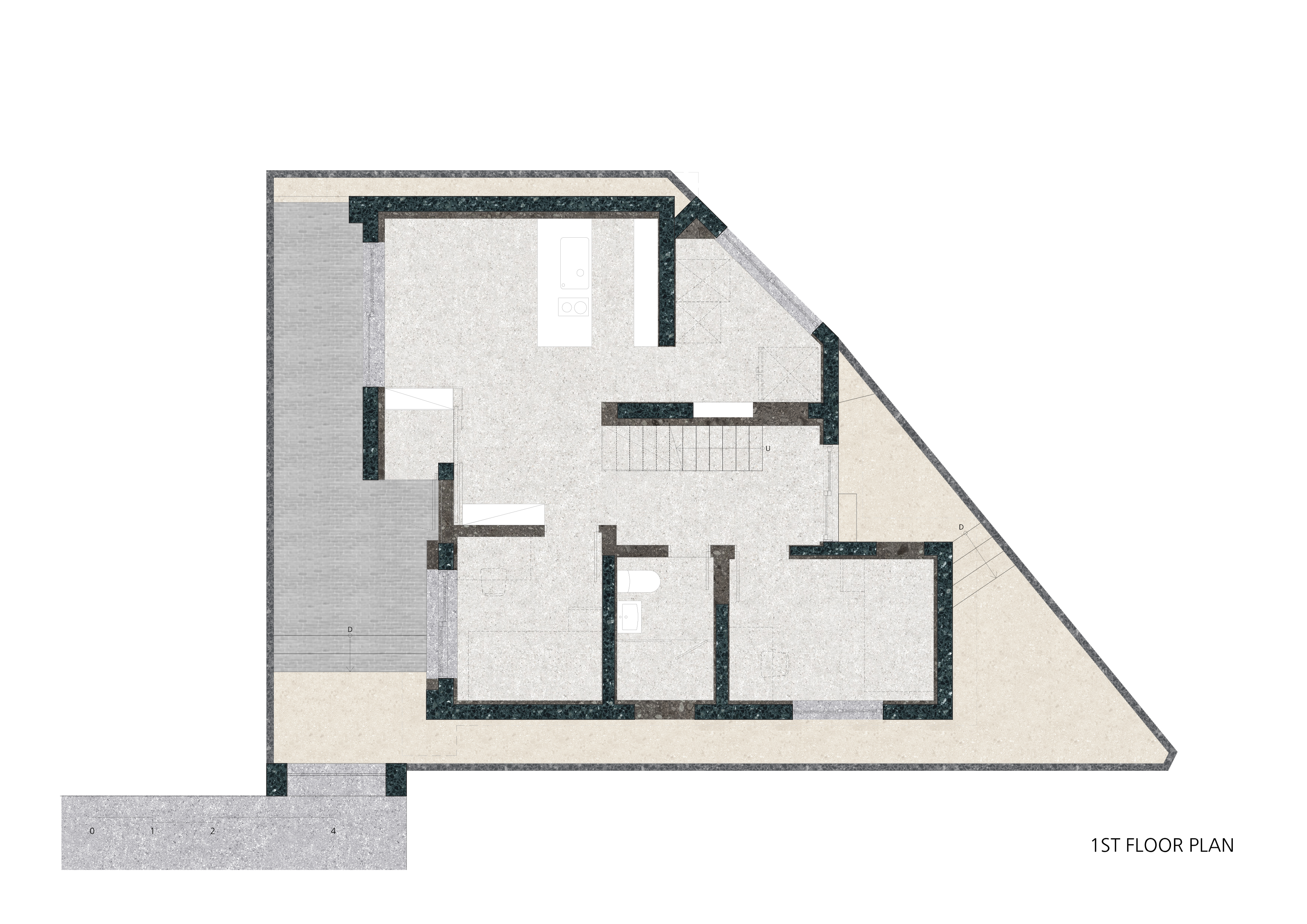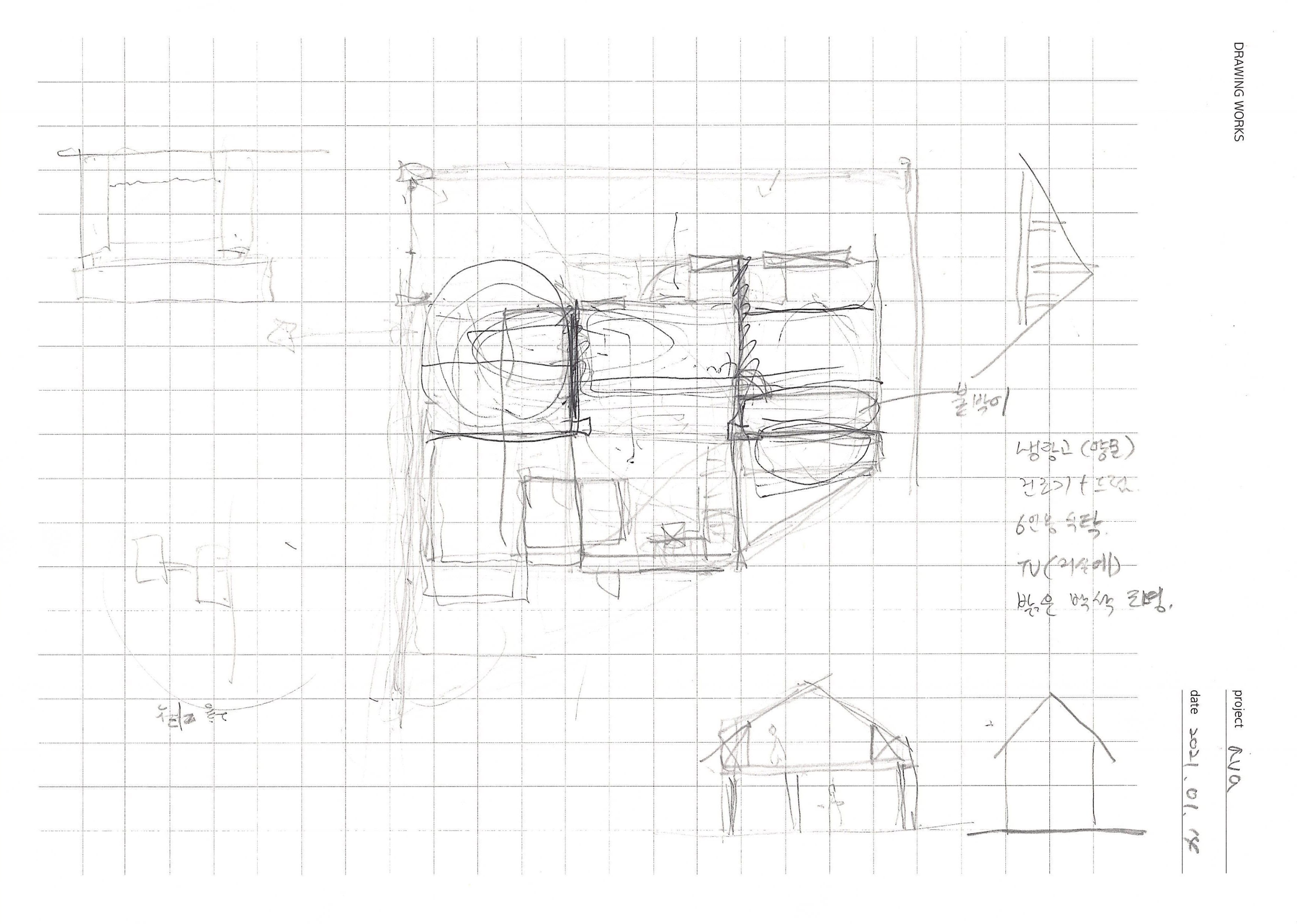 기존 주택은 1973년 지어진 단층 주택이며 유약 벽돌과 화강석 마감, 기와 경사지붕이 특징이었다. 주택일대는개발이활발하지못해주택형식등에서시대상을고스란히담고있는곳이많았다.이 집은 막다른 골목에 위치해 차량 진입이 어려웠고 옆집과의 이격거리가 좁아 일조가 우수하지 못했 다.또한이시대에지어진집들은정부정책으로지하를두어방공대피소의역할을하도록했는데 지하수 유입과 위생상의 문제로 해결책이 필요했던 리모델링 프로젝트였다.