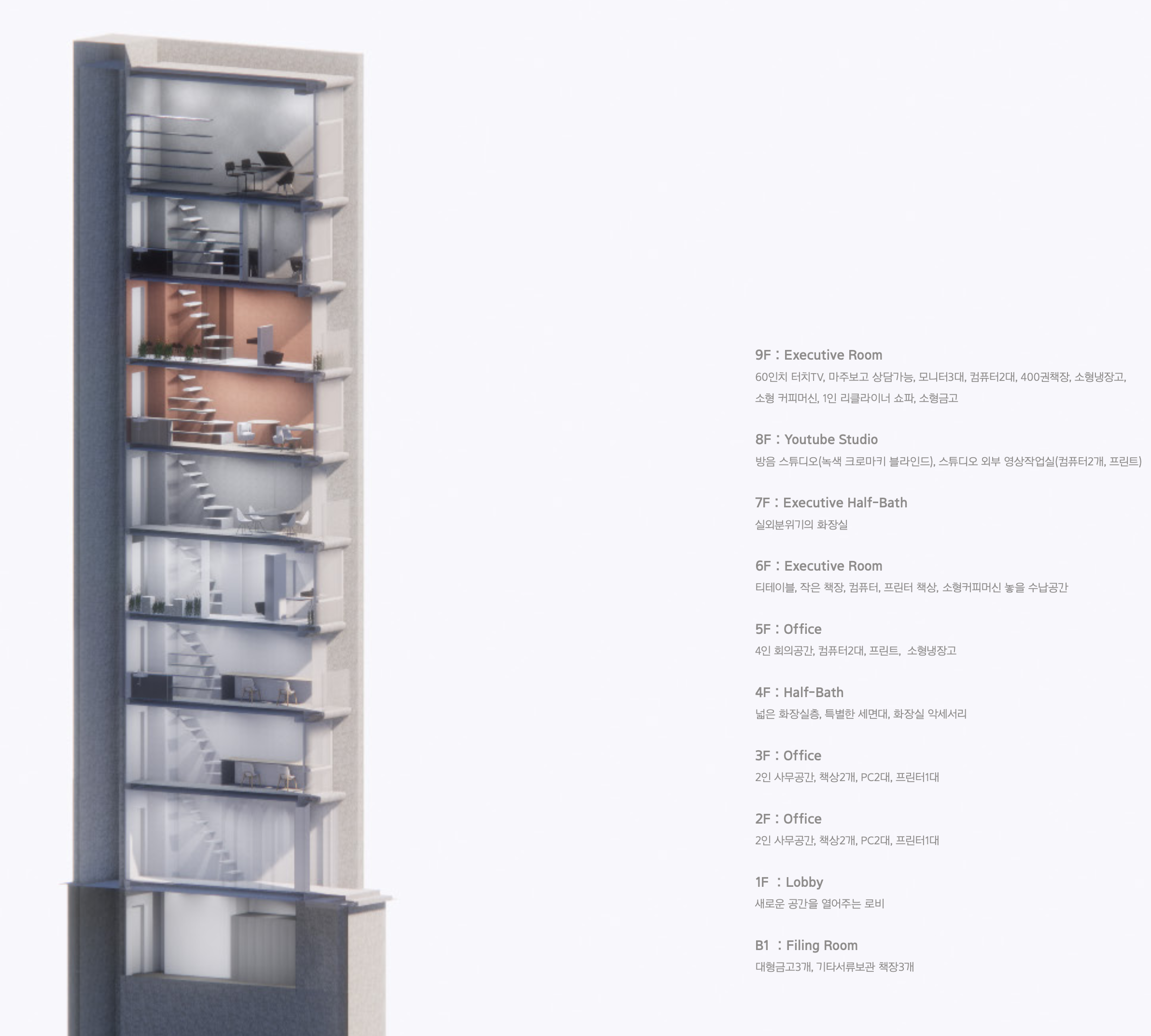 폭 2.2m 길이 9m의 공간에 안쪽에는 4인승 엘레베이터가 있다. 이 공간은 상업지역의 용적률을 최대한 활용하기 위해 높이 25m, 지하1층 지상9층으로 지어진다. 6m 폭의 좁은 길에서 고개를 들어올려 봐야 그 끝을 볼 수 있을 정도이니, 사람 의 존재가 약하게 느껴질 정도이다. 자연은 인간에게 풍요와 안식을 주기도하지만 깊고 빼곡한 숲속에서 느끼는 고독과 높은 절벽이 주는 경외 심, 세찬 바람과 거센 흔들림은 공포감을 주기도 한다. 위대한 자연으로부터 경이로움을 느끼듯 이 땅에 빌딩숲 사이의 틈에 세워진 벽체 사이 틈은 공간이 되어 그 스케일에서부터 압도적인 분위기를 전한다. 도시의 틈은 유휴지로 남을 수 있었으나 주변 빌딩숲의 반열에 올라 공간, 빛, 구조체의 원초적인 본질을 탐닉하게 한다.