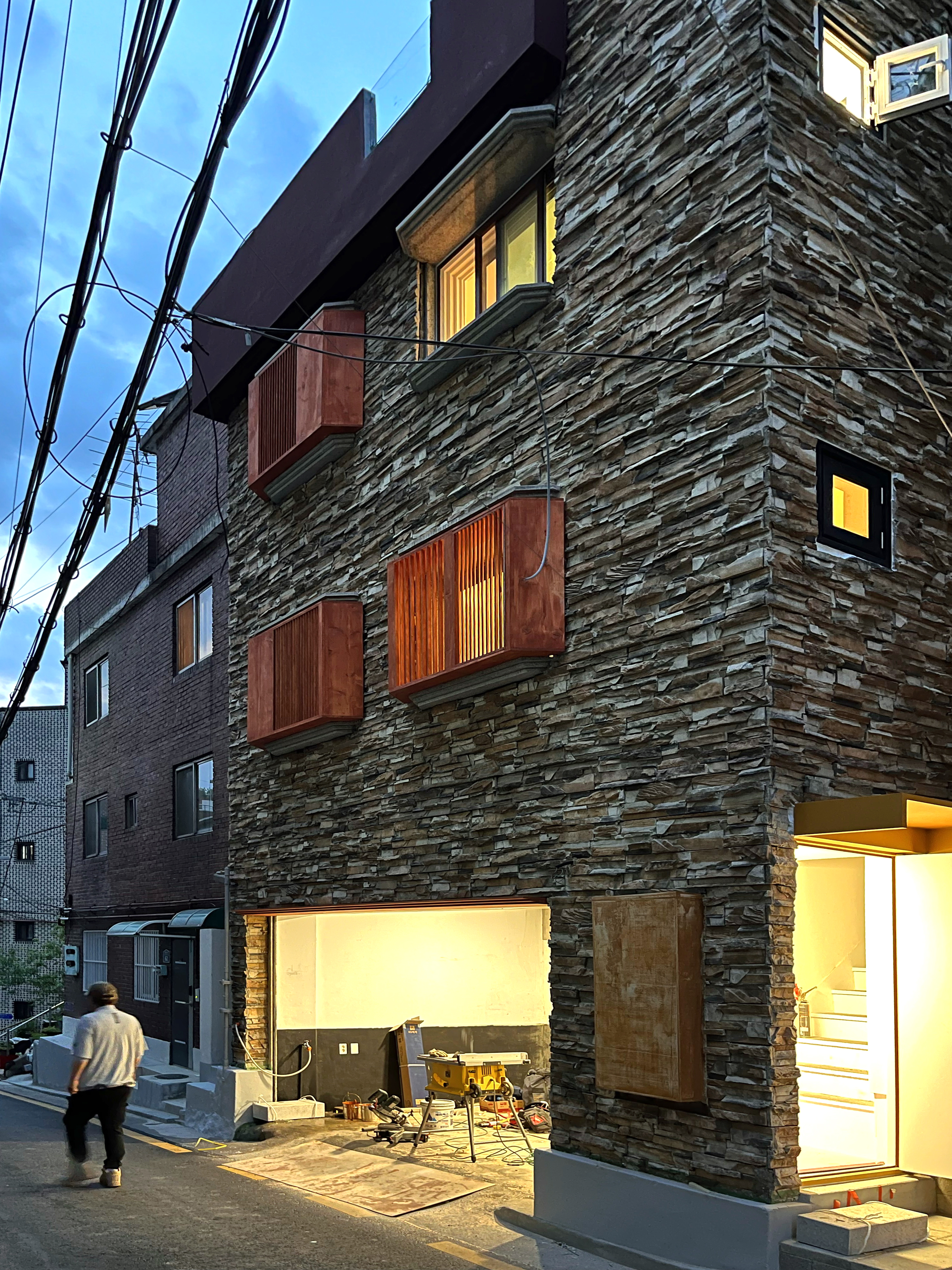 행촌동에 무명의 건축가가 집을 지어준다면 동네 사람들에게 통용될만한 모습을 보여줬어야 할것이다. 우리가 계획하는 대상은 성곽이 바로 곁에 있어 돌을 켜켜이 쌓은 마감 방식은 당시의 시대상을 담았고, 작은 필지에 지어진 평범한 주택이다. 납작하고 거친 돌을 켜켜이 쌓았지만 주로 노란색을 띄는 모습이 부드러운 인상을 보이며 매력적이었다. 그래서 우리는 이 집의 외형을 이루는 돌은 보존 가치가 있다고 생각했다. 또 하나의 특징을 가지는 외부 창호는 화강석을 세겹으로 하고 양 모서리를 빗각을 쳐서 창틀을 매달아 이중창의 역할을 하고 있었다. 행촌동에는 이런식으로 창을 만든 집들이 많이 눈에 띈다. 이 창 턱은 층별 면적이 작은 집이 주로 있는 마을의 특성상 소품을 올리는 등의 활용이 엿보이며 이웃과의 비교 의식, 그로인한 모방과 동화 심리가 강한 한국인의 국민성과 맞물려 동네 전체에 전파된 산물이다. 화강석에 설치된 샷시는 철거하고 켜켜이 겹쳐진 화강석과 형태를 따르는 목재 창호를 설치했다. 6m 도로를 사이에 두고 있는 다세대 주택과의 프라이버시 때문에라도 간살이 있는 형태의 목재창호는 필요했다. 당시의 건축 양식이라 할 만한 형태를 따르는 미학적 해결책으로 제시된 방법이다.