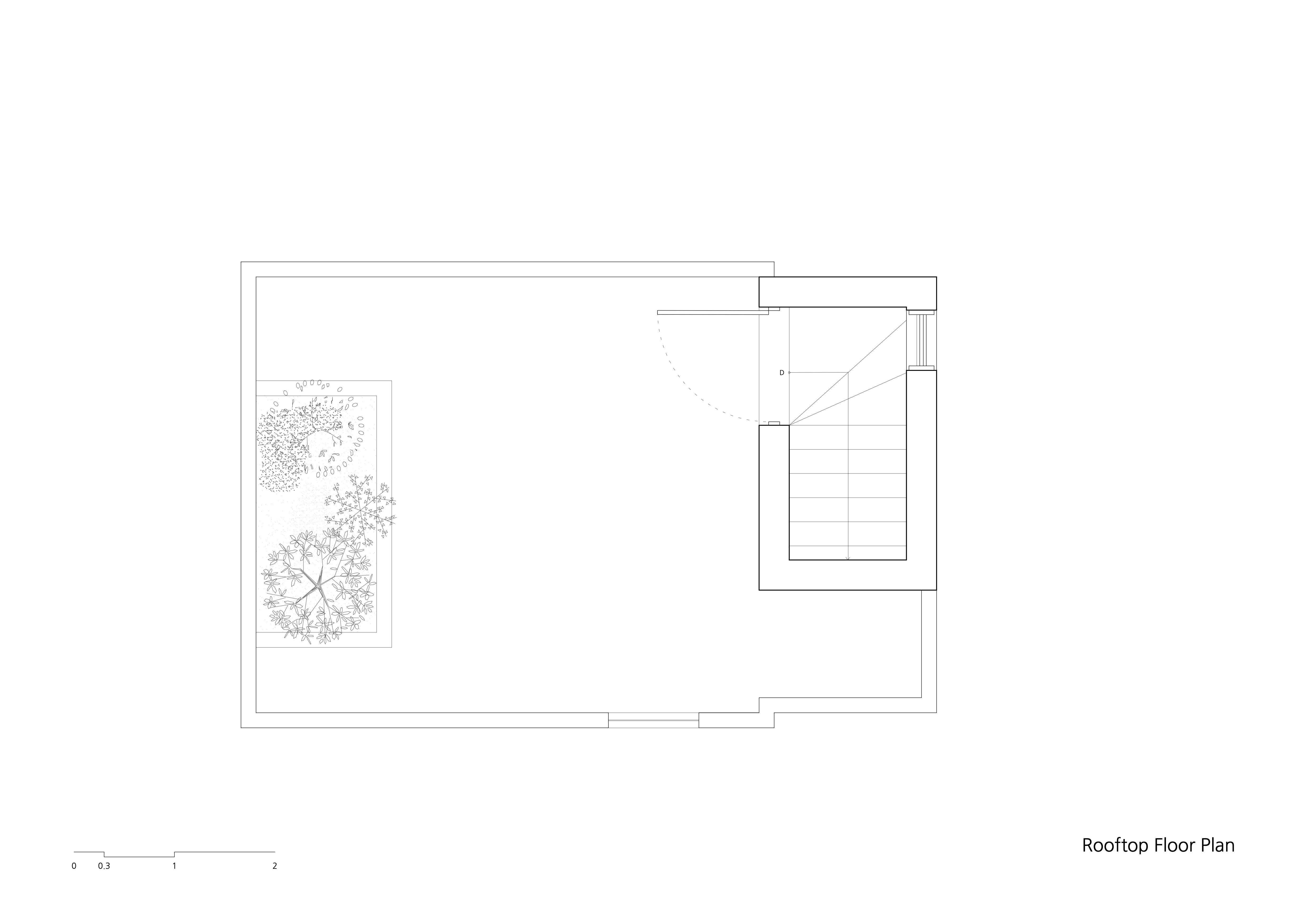 1층은 도로에서 직접 출입이 가능한 주차장이지만 작업실 또는 작은 갤러리로 이용 가능성이 있다. 좁은 길에 면한 4층 이내의 다세대 다가구주택이 이어지는 풍경에 골목 갤러리를 기획하여 일상속 예술을 실천하며 예술 속에서 살아가는 사람들이 많아지길 기대한다. 내부 공간은 협소한 주택이기에 계단실이 전층을 관통하며 공간을 연결한다. 1층 현관에서 2층으로 올라가면 거실겸 주방 그리고 화장실이 있다. 기존에 화장실이 있던 자리를 철거하여 주방 가구를 확장했고 화장실은 가장자리로 이동했다. 3층에는 침실이며 세탁실을 포함했다.