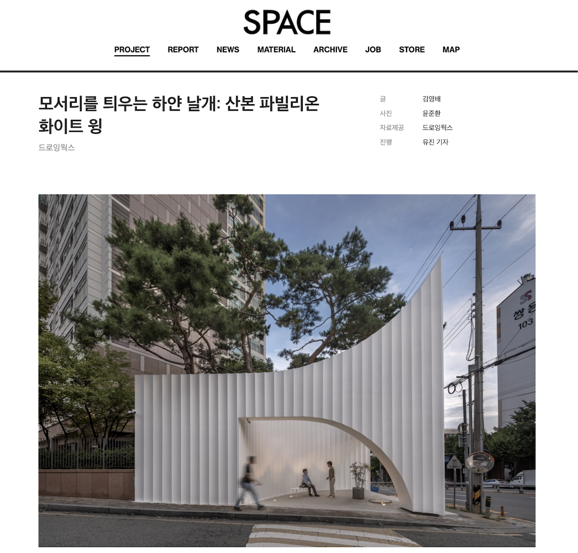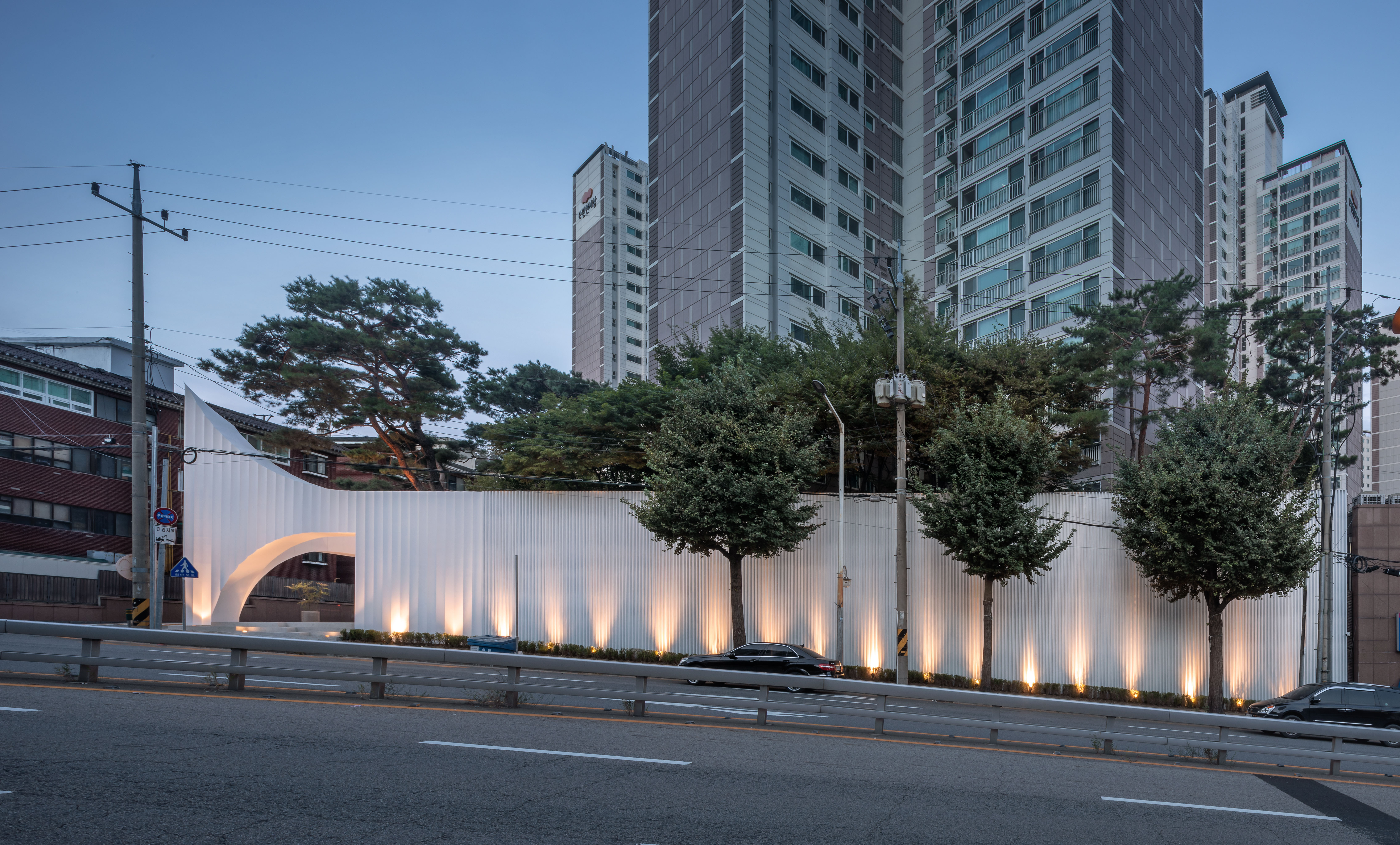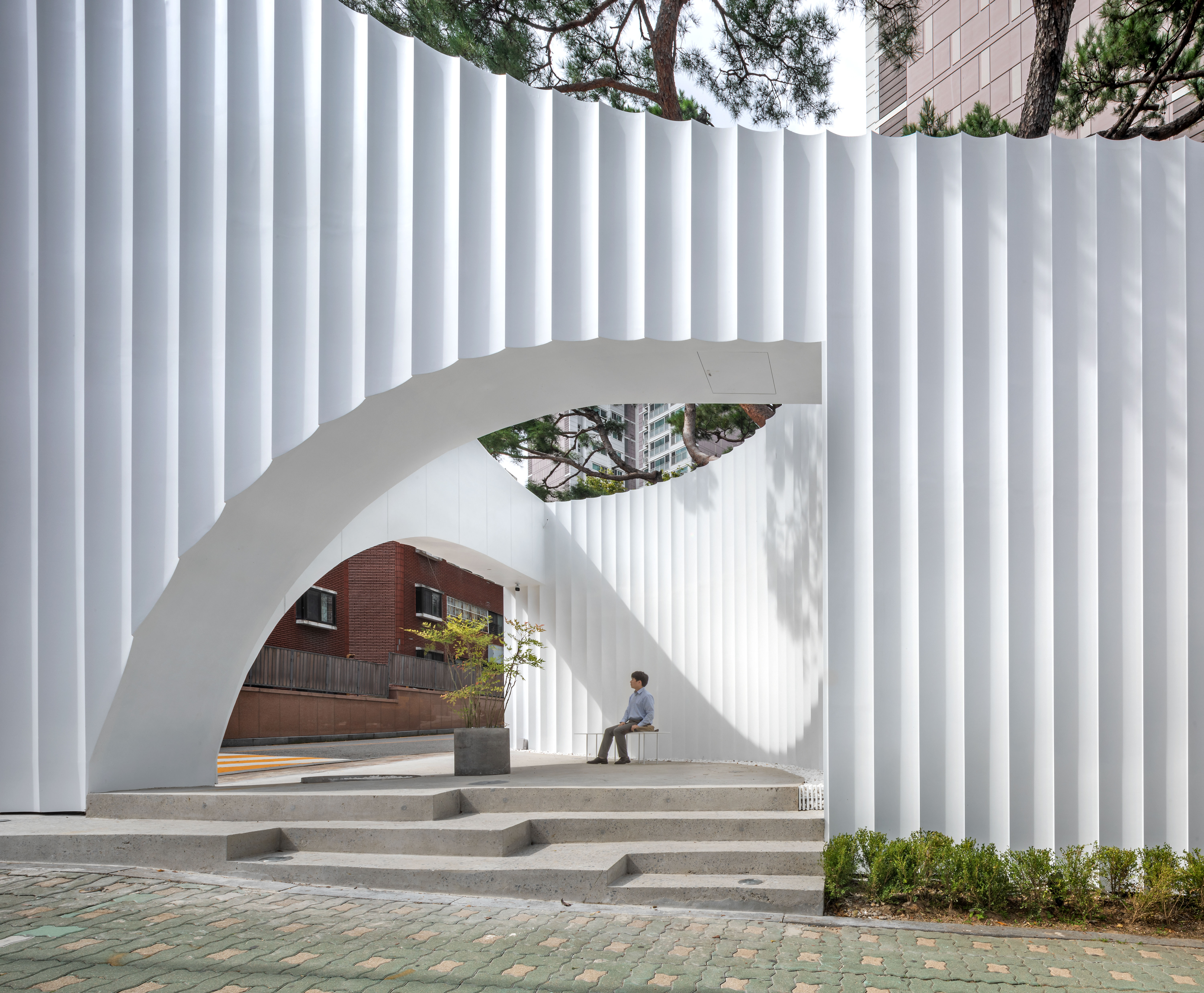 A pavilion that brings up the image of white wings was presented on the corner of a site facing the apartment complex in Gunpo, Gyeonggi-do. This structure appears with a form as if both wings are spreading out with the corners as the center, and became completed by extending from the walls of the apartment complex that is 40m long. The size of pavilion designed by installing a metal curved wall module on the front that is 12 meters wide and 9 meters high.
