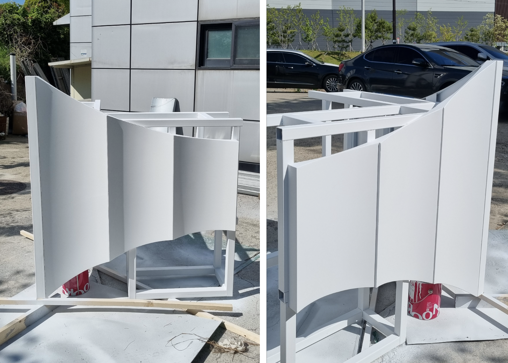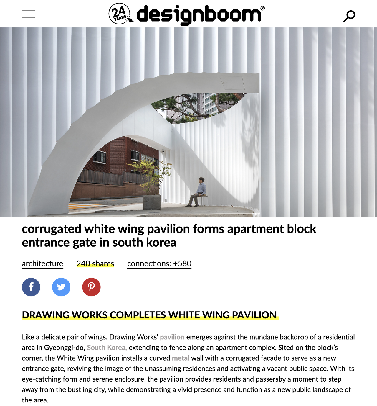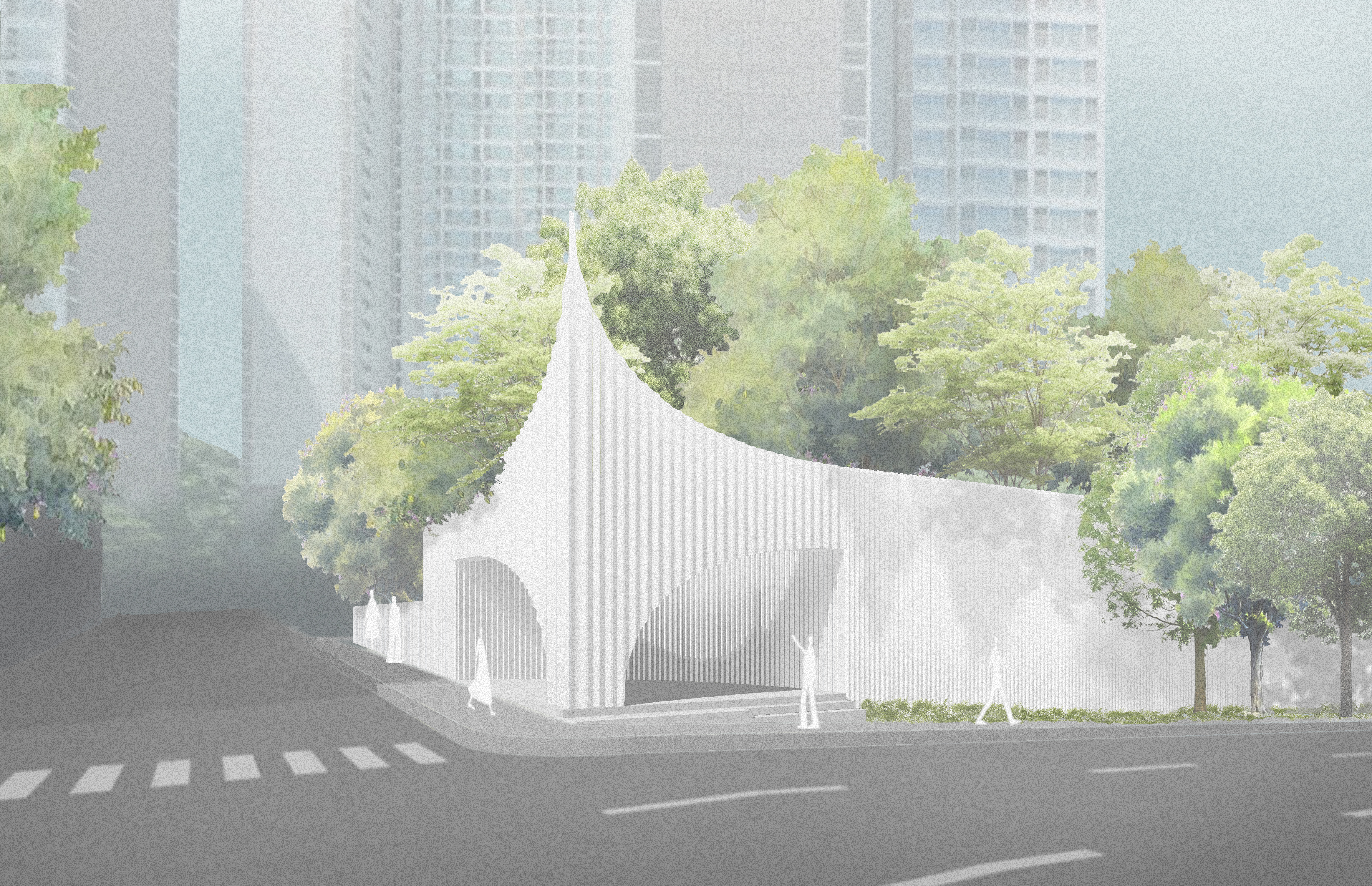 A pavilion that brings up the image of white wings was presented on the corner of a site facing the apartment complex in Gunpo, Gyeonggi-do. This structure appears with a form as if both wings are spreading out with the corners as the center, and became completed by extending from the walls of the apartment complex that is 40m long. The size of pavilion designed by installing a metal curved wall module on the front that is 12 meters wide and 9 meters high.