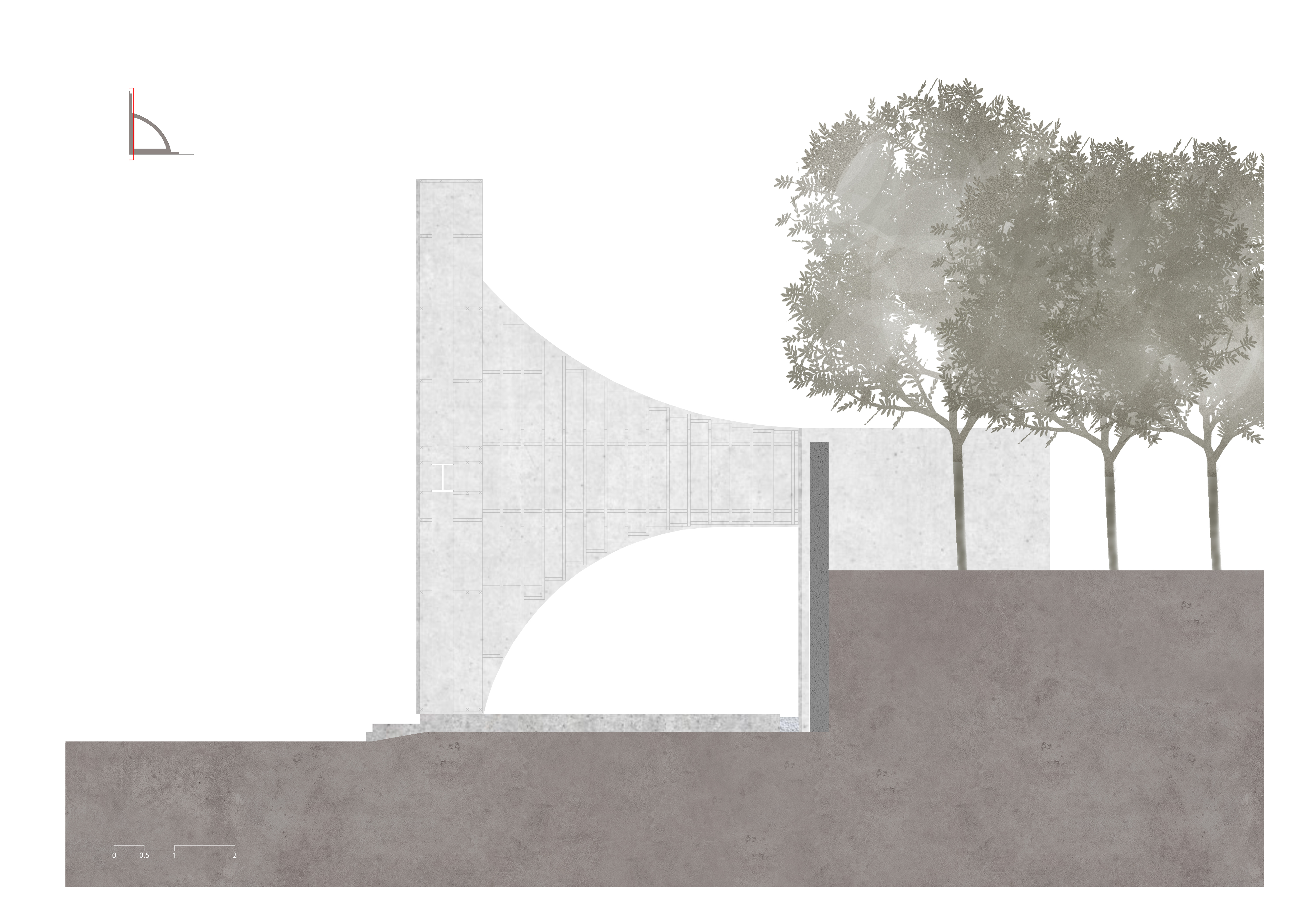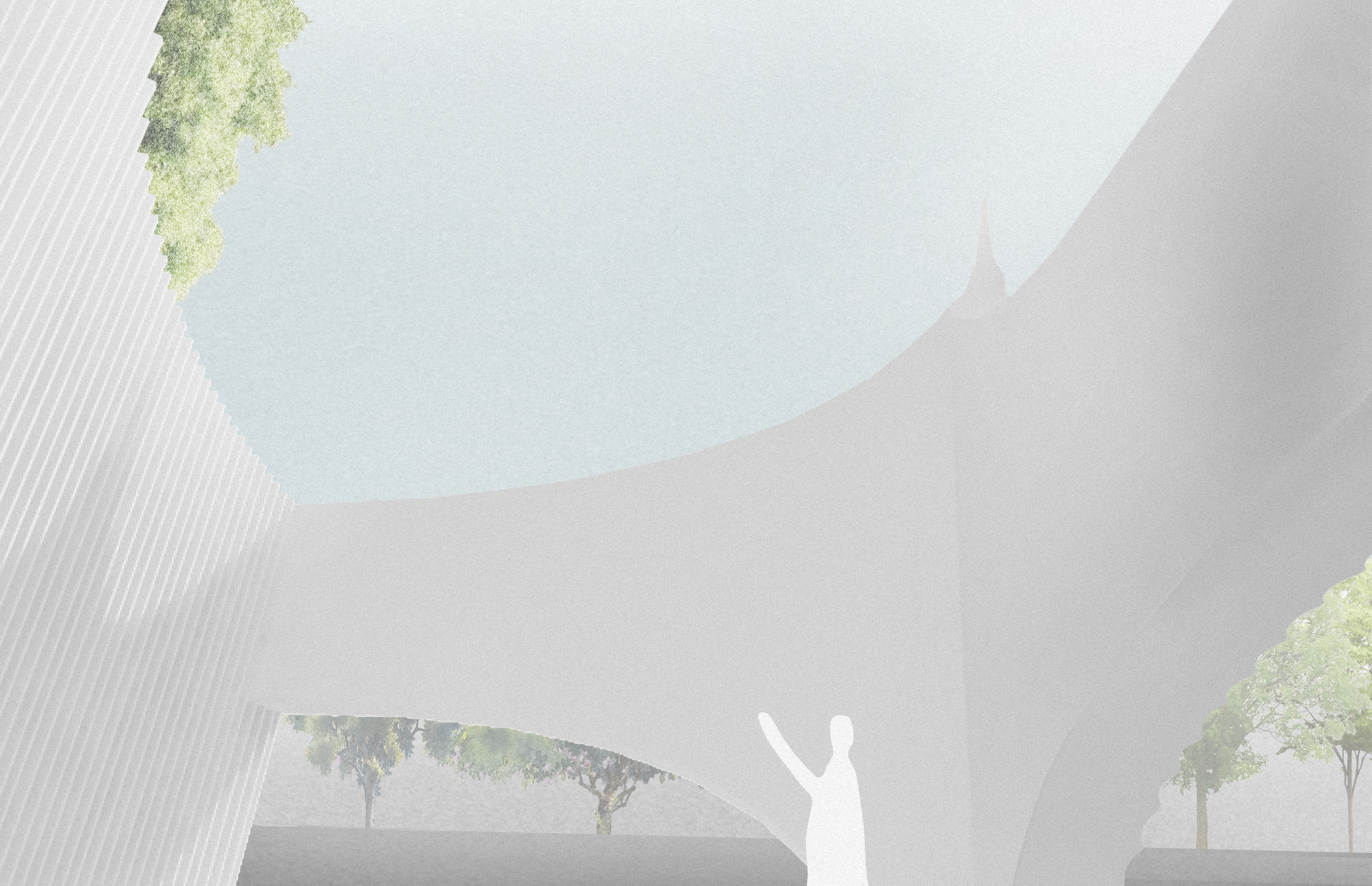 The main façade is located on the northeast roadside, so light and shadows enter the inner front yard only in the morning. A louver produced on the curved surface to add depth to the surface shows different shadows depending on the light and the natural scenery created with shadows of the plentiful pine trees escort people in their daily lives. In the yard of the pavilion, people can look up at the sky in between the structure and appreciate the light that shines upon them while restfully embracing the shade. The white wings will demonstrate a vivid presence and function as a new public landscape of the area.
